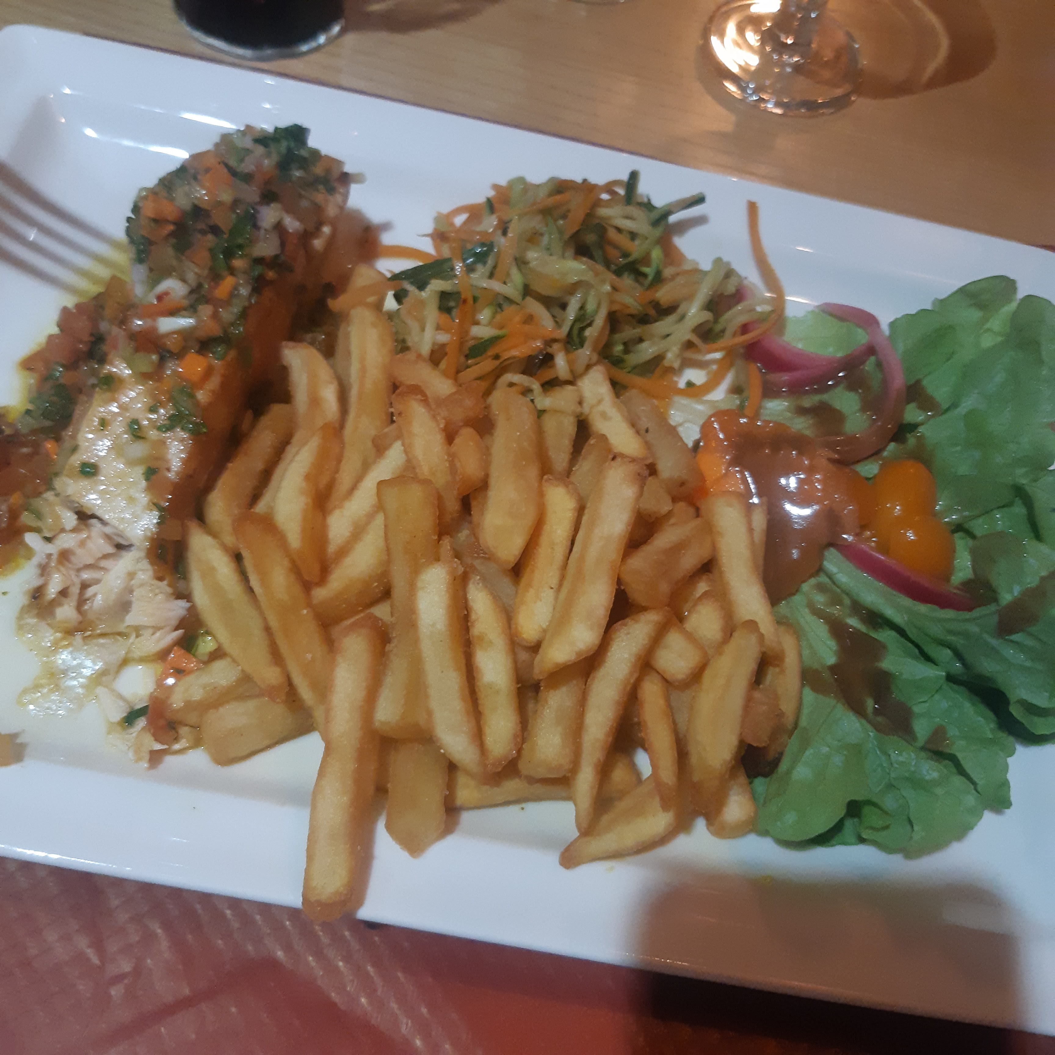 J ai pris de la morue frites Malheureusement j ai eu un morceau de ventre donc truffé d arêtes. La serveuse m a demandé si tout s était bien passé, je lui ai dit qu il y avait plein d arêtes , elle me répond « ben oui c est du poisson !! Sinon mon marie a aimé son plat Vin en carafe bon Dommage, les avis sont bons , mais nous n y retournerons pas
