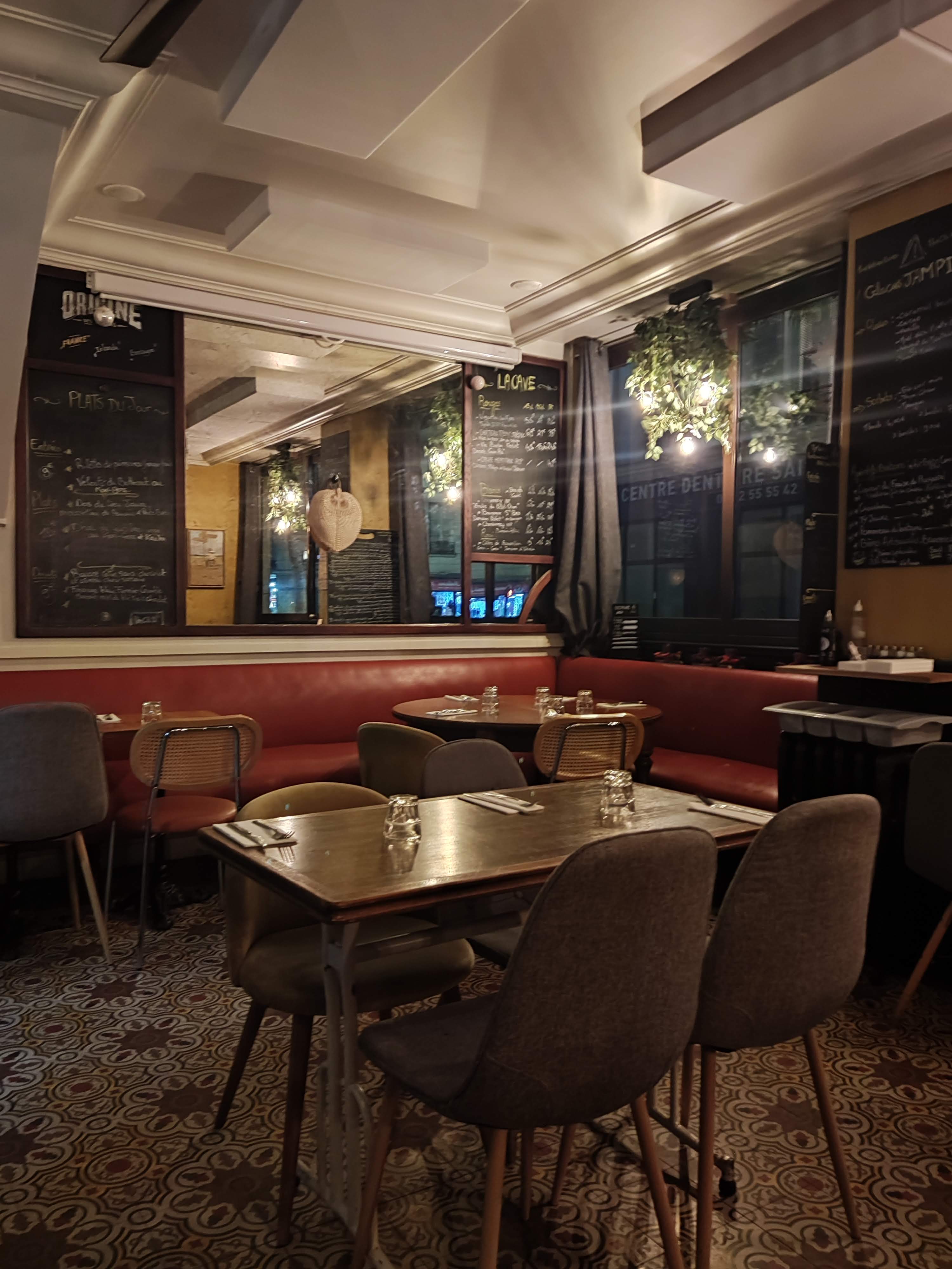 ❝ Cuisine française dans un décor de bistrot patiné avec banquettes rouges, sol céramique et miroirs muraux. ❞