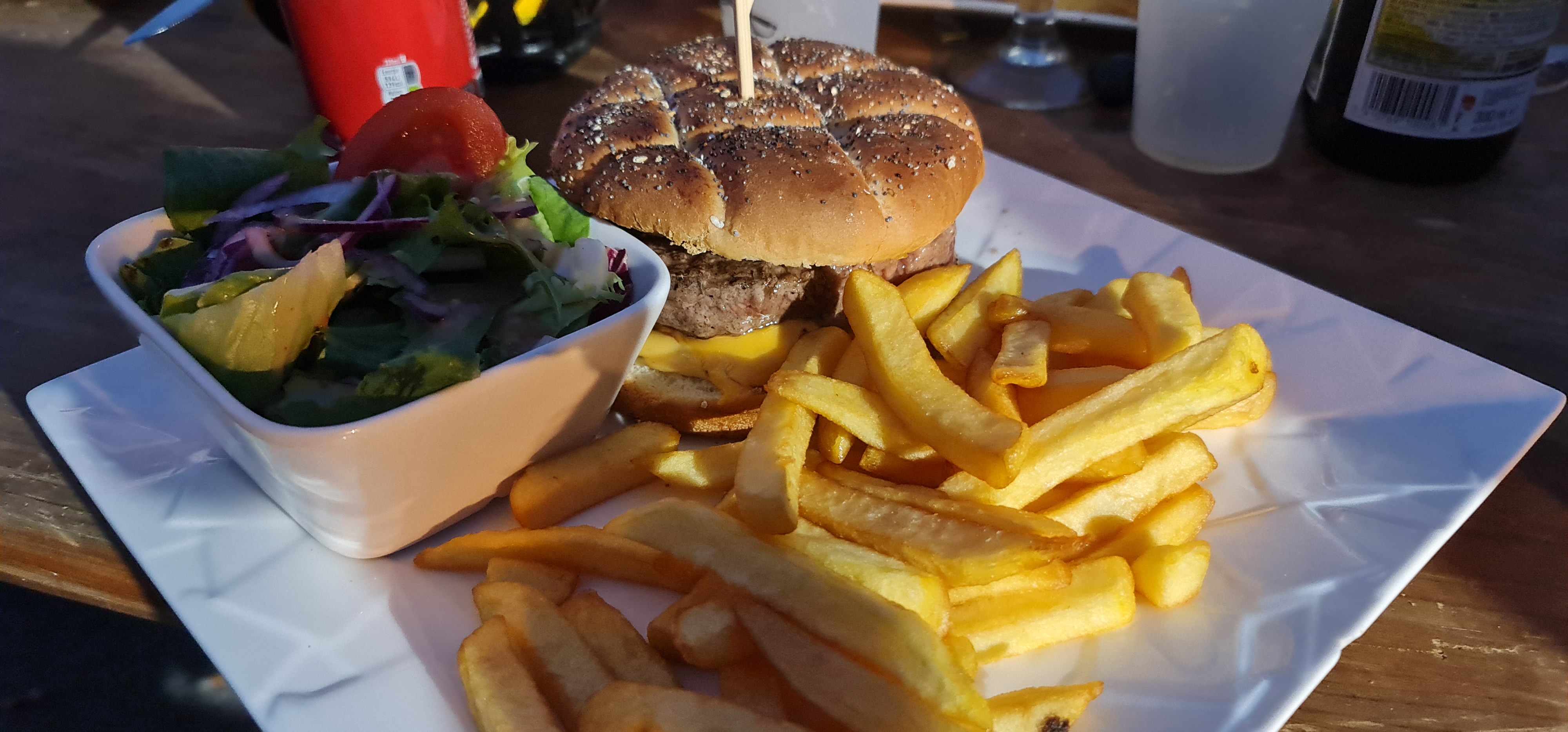 Petit repas impeccable, service rapide, salade bien consistante, bonne sauce burger et bonne cuisson, sous le soleil de Saint-su, parfait