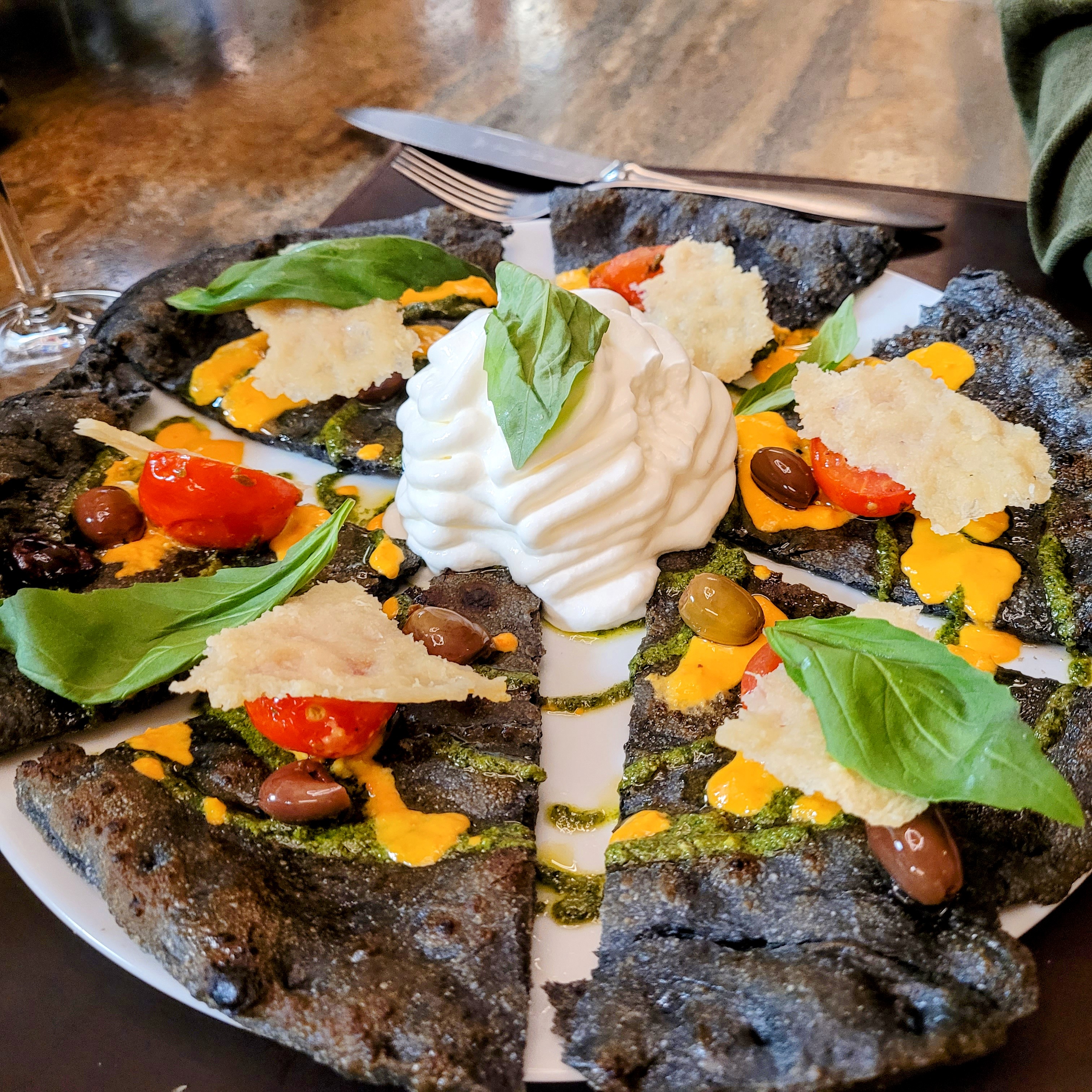 Serveur très agréable J'ai commandé une pizza au charbon que j'ai mangé car j'avais faim mais je n'ai pas aimé l'association des sauces et tomates cerises froides ainsi que la chantilly de stracciatella C'est original visuellement mais j'ai trouvé ça écoeurant.. c'est mon avis personnel..
