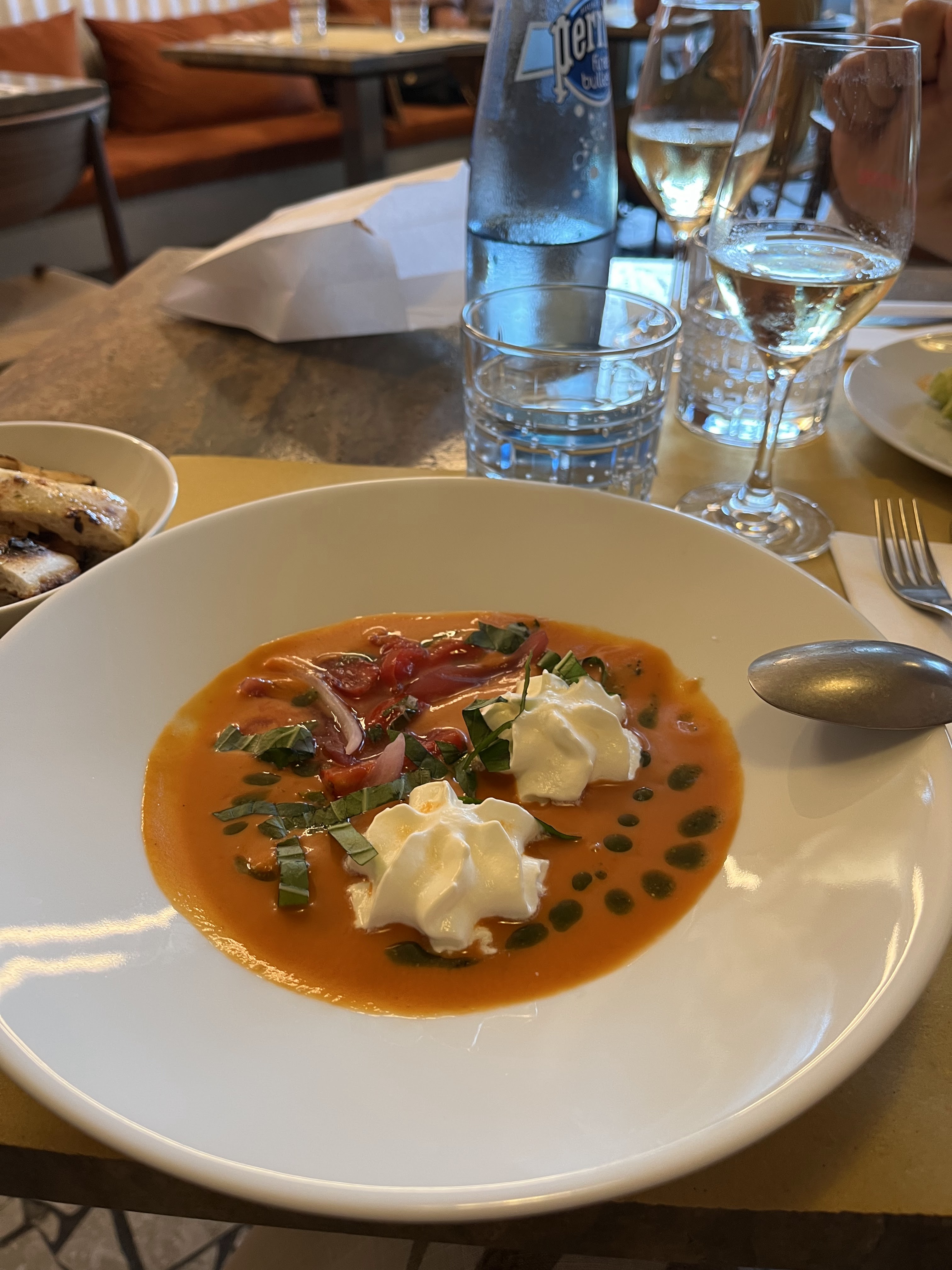 Le gaspacho était trop cher : 2 cuillères dans le plat. Rien de spécial. Les raviolis étaient corrects. La pizza était intéressante, me rappelle Coca à Valence. Je pense que c'est un menu un peu déroutant.