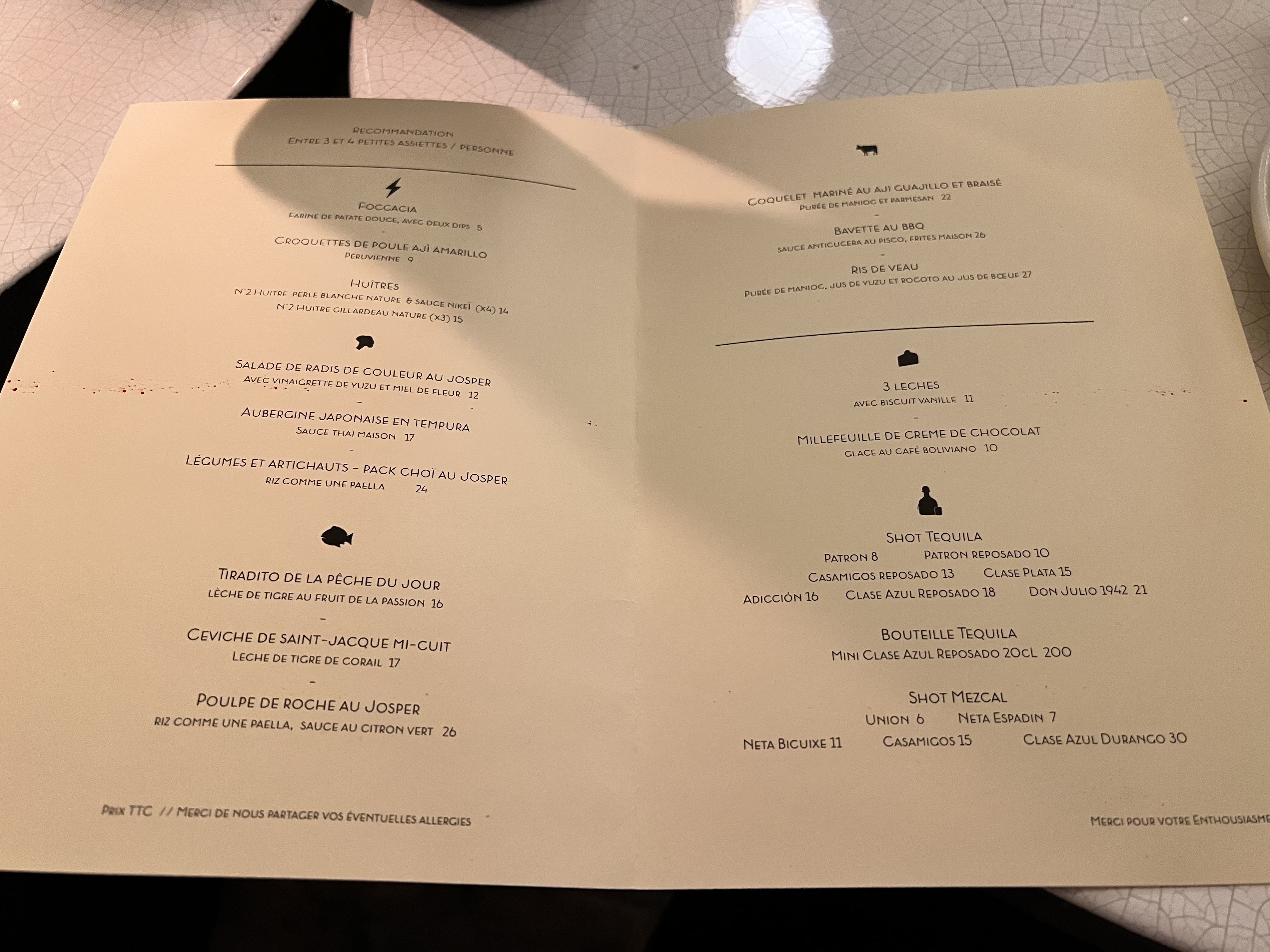 Un personnel souriant et aux petits soins, de jolies assiettes et des cocktails joyeux! Une chouette carte des vins avec des références classiques et natures. (mention spéciale pour les shots de mezcal, parfait pour une digestion efficace :) )