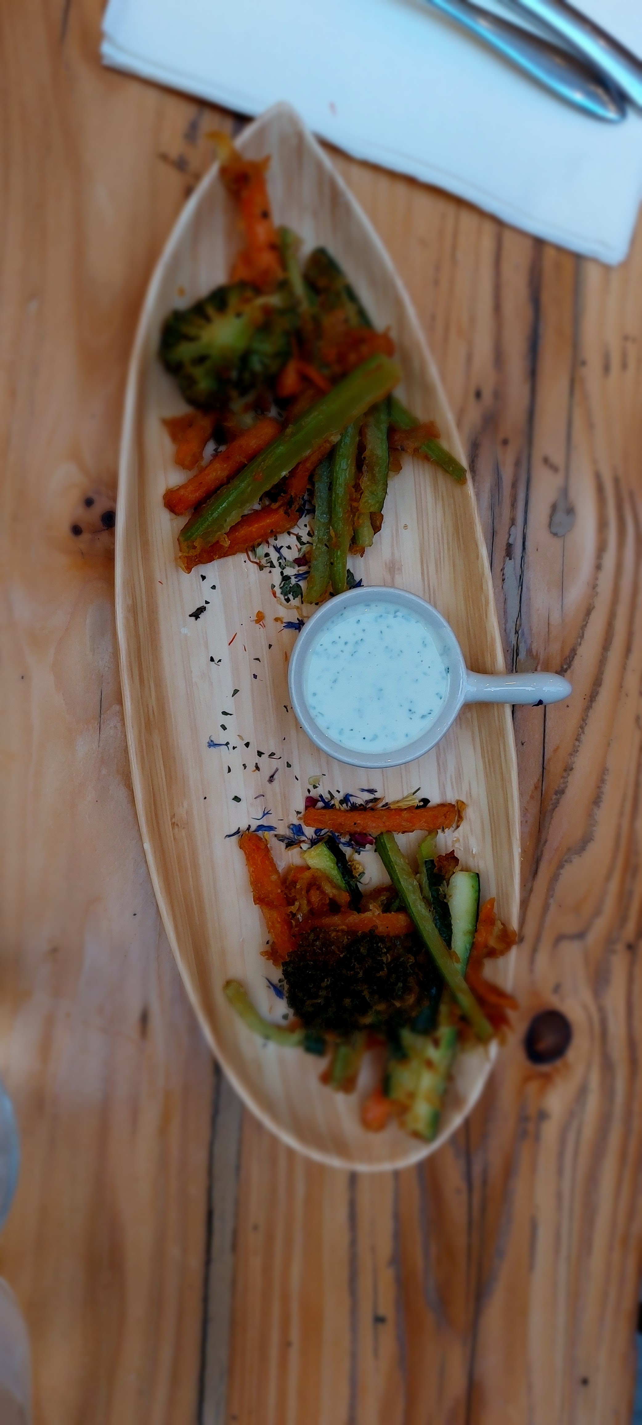 Nous avons choisi cet endroit car il était plein à craquer et avait l'air très mignon lorsque nous y sommes passés lors d'une promenade en soirée. Le personnel semblait très sympathique, ce qui fut le cas à notre arrivée le lendemain : l'hôte nous a accueilli chaleureusement, avec le sourire et nous a laissé choisir la table. Mais le service des serveurs était inattentif, nous avons dû demander notre eau trois fois pour l'obtenir, il ne suffit pas de regarder et de sourire aux serveurs pour attirer leur attention, il faut vraiment les appeler fort. La nourriture n'était pas bonne non plus : nous avions un menu avec des petits calamars et des tempura de légumes et une salade composée de fromage de chèvre : les deux ne sont bons que si c'est quelque chose que vous avez cuisiné vous-même à la maison, mais pas au restaurant. Bref, je ne le recommande pas :/ P.S. Il se pourrait que le changement inattendu de temps (de froid et très venteux à chaud et ensoleillé) ait influencé le personnel !
