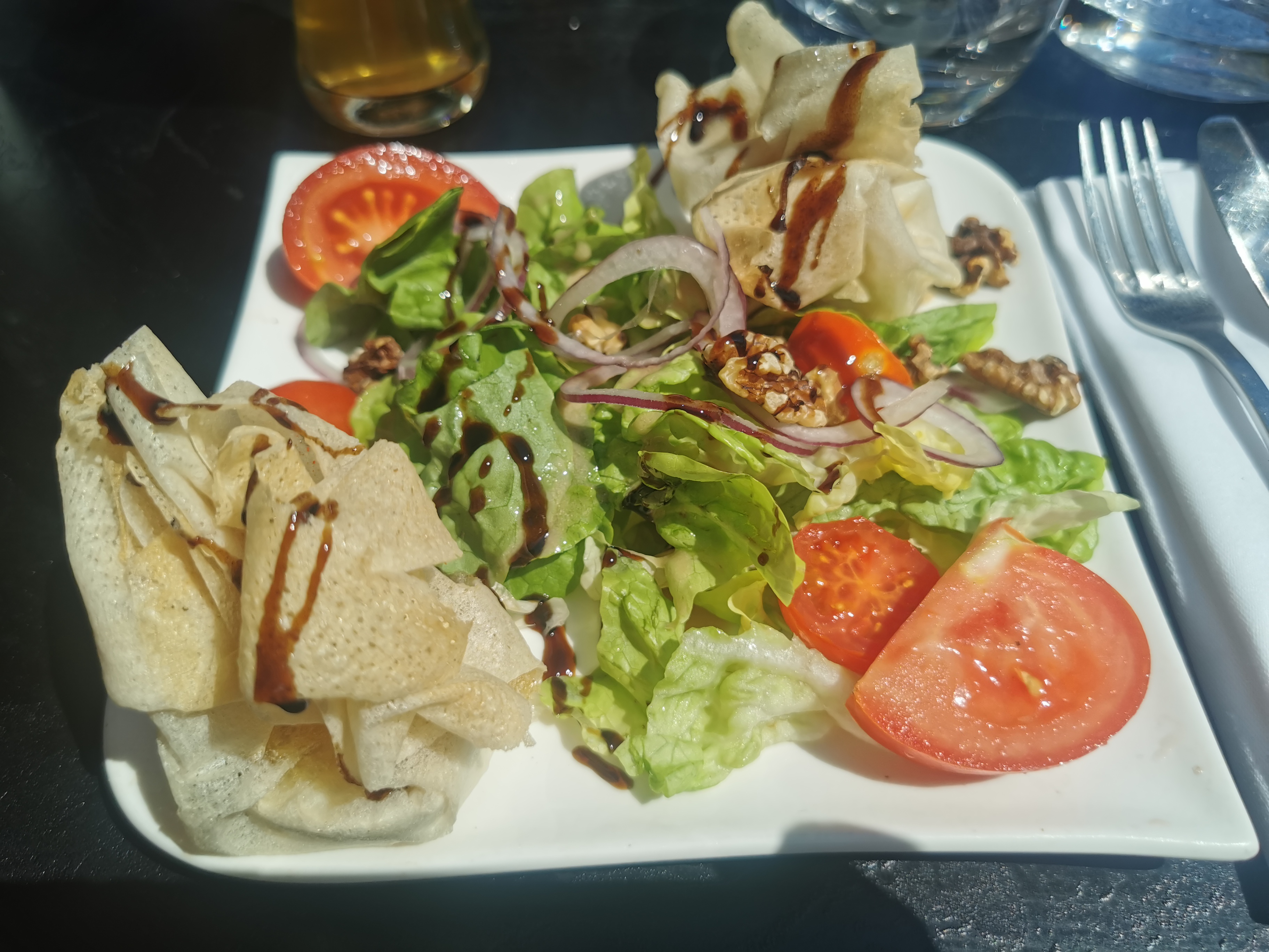 Salades sympa avec une belle vue agréable. La carte permet un large choix de plats différents avec des produits qui semblent frais mais nous n'avons pas pu évidemment tout goûter, il faudra revenir. Le personnel est jeune, efficace et sympathique. La décoration intérieure est vraiment soigné avec de beaux éléments en bois travaillé ce qui donne un cadre très chaleureux. Adresse à retenir. Accès depuis une belle petite ruelle de la vieille ville, ne donnant pas d'idée de la magnifique vue sur le port que l'on a depuis la terasse. Le choix des desserts est également assez large et avec quelques saveurs locales Le service est rapide si on le demande, en tout cas, ça a été notre cas. Dommage que la carte ticket resto ne fonctionne pas dans cet établissement