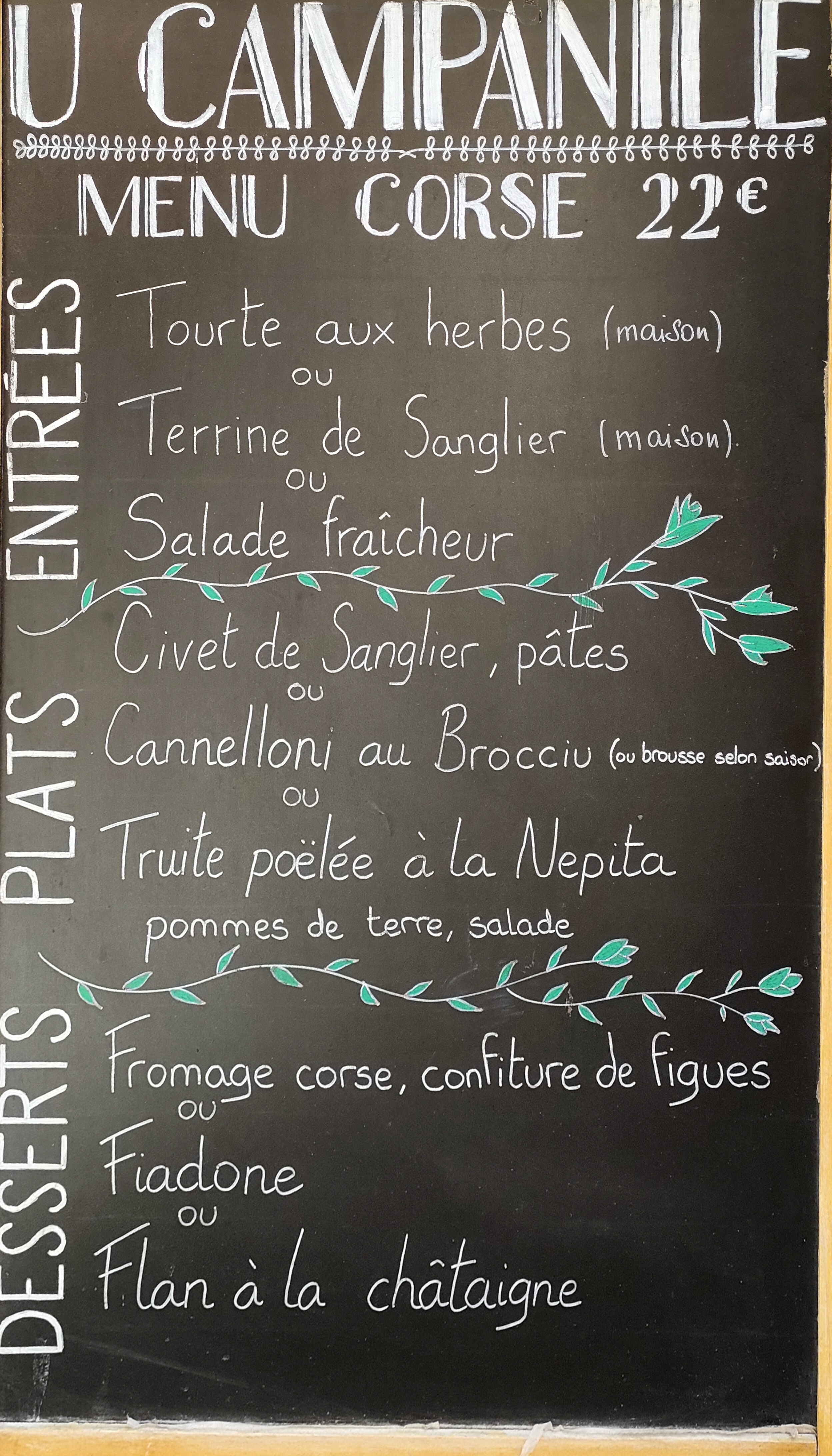 Menu Corse à 22 euros avec des produits frais et faits maison. Nous avons été servies par Manue, service au top, je recommande !