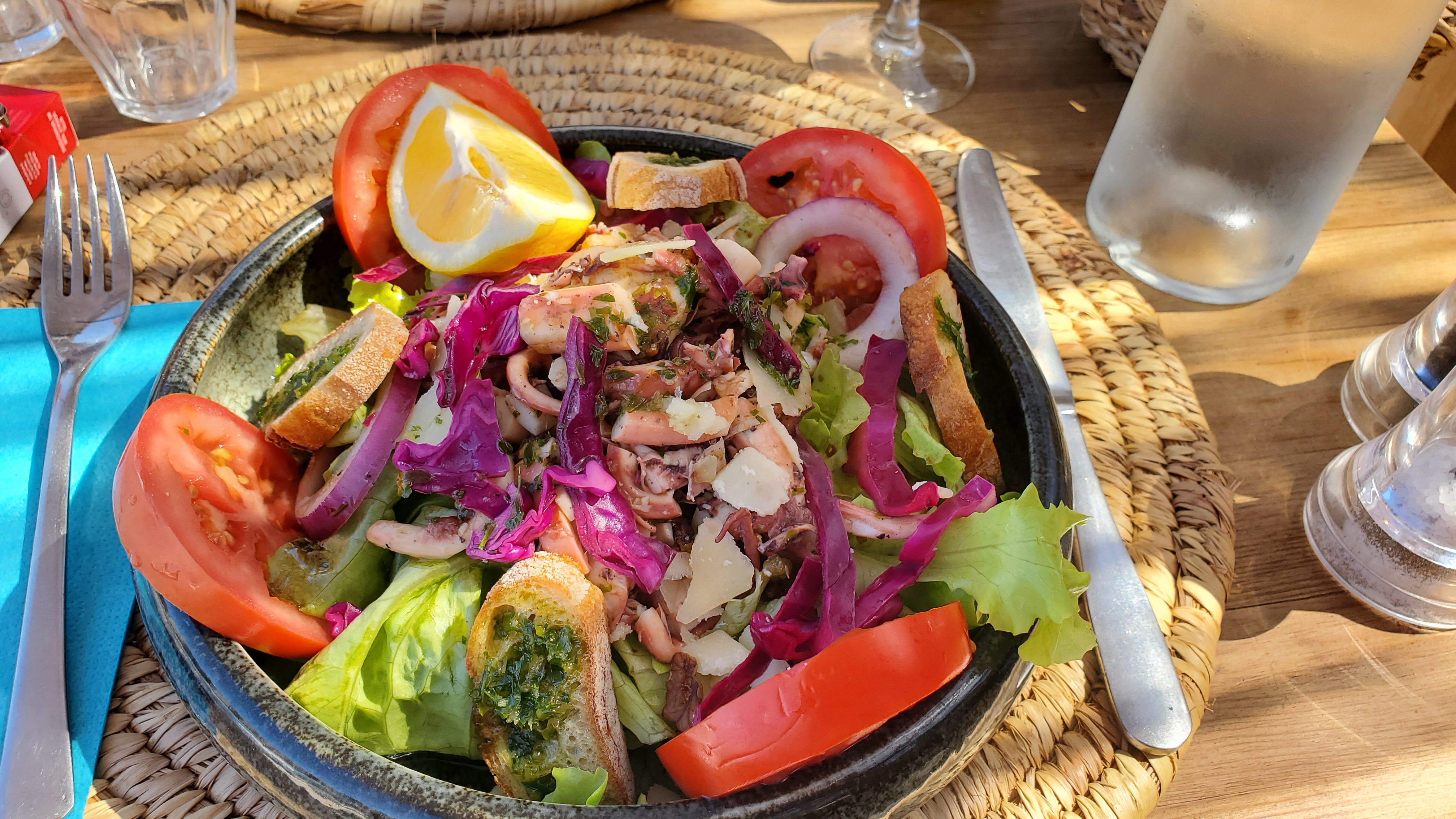 La nourriture était super savoureuse ! L'endroit est occupé mais c'est normal pour la pleine saison en août. L'emplacement ne peut pas être mieux, tout simplement excellent !