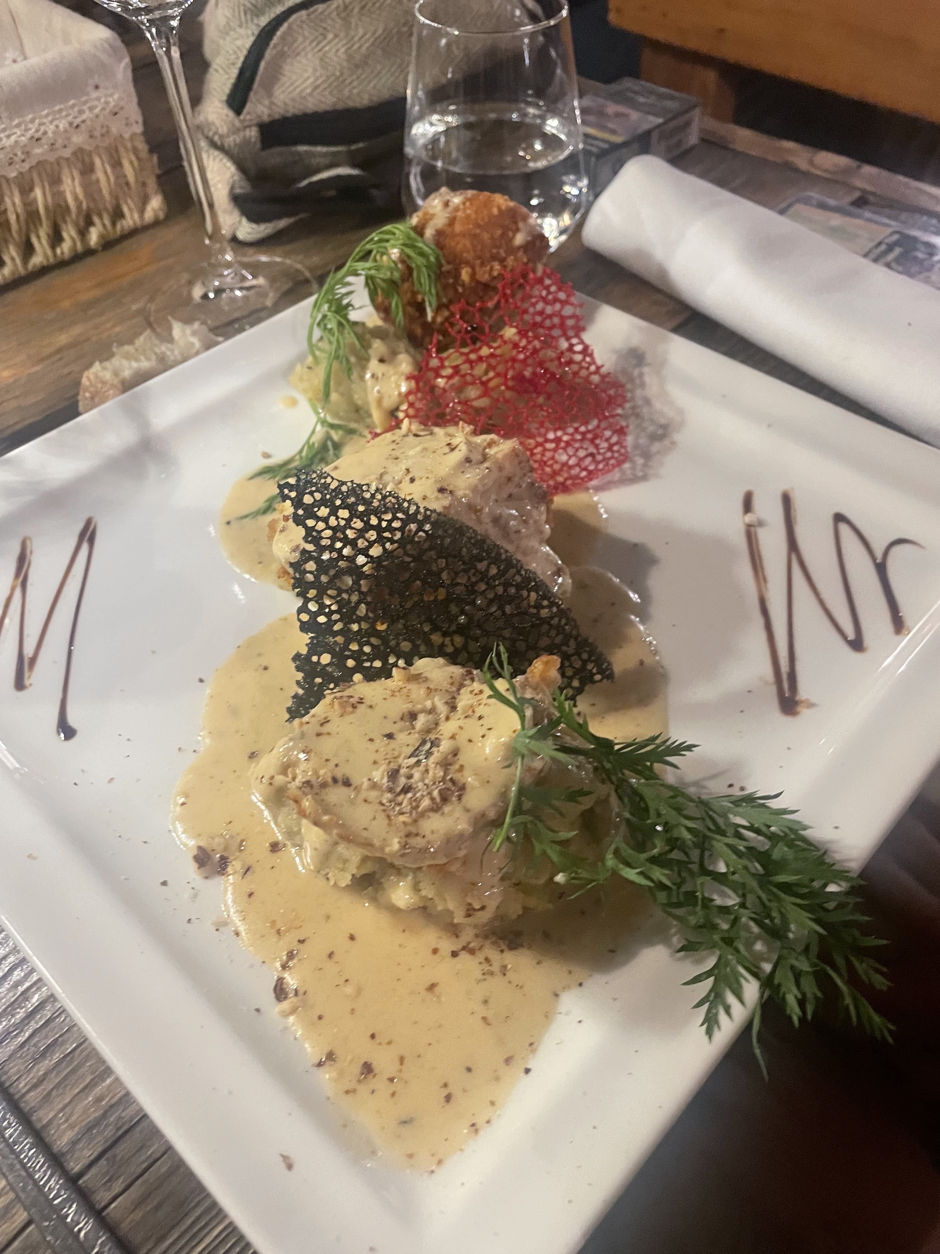 Accueil chaleureux, cadre atypique avec de vrais moulins à poivre 😊 Plats délicieux, fraîcheur des produits , très copieux, dommage je n'ai pas réussi à prendre un dessert 🤭 Grand plus : beau choix de vins même au verre, ce qui très très rare. Bravo 👏 Autre grand plus pour les locaux : ouvert en hiver 😊