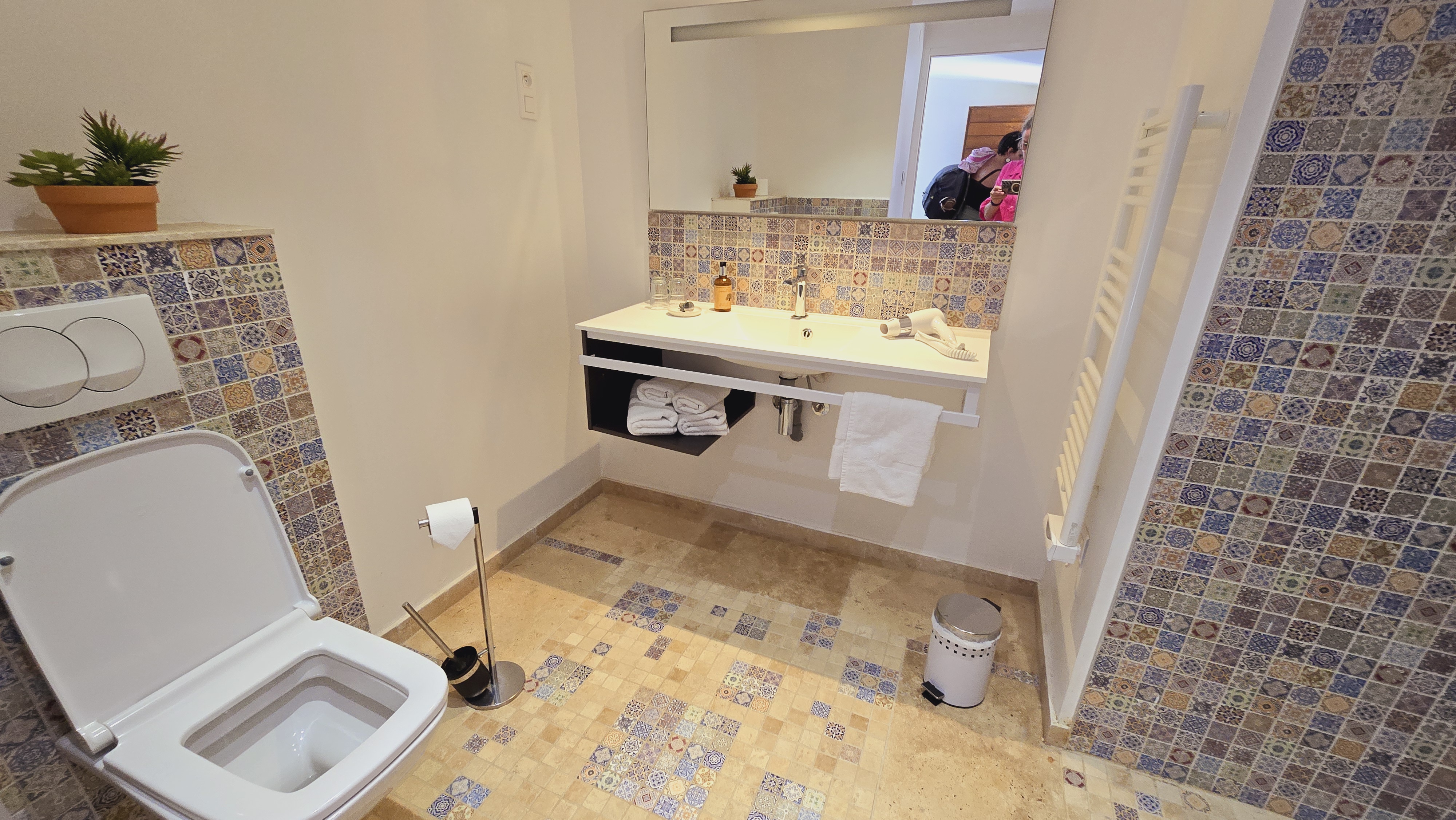 Un très bon moment tant culinaire de ludique/zen avec l'accès à la piscine. J'ai apprécié les douche/wc privatifs (pas trouvé la lumière : la petite fenêtre était un peu juste)