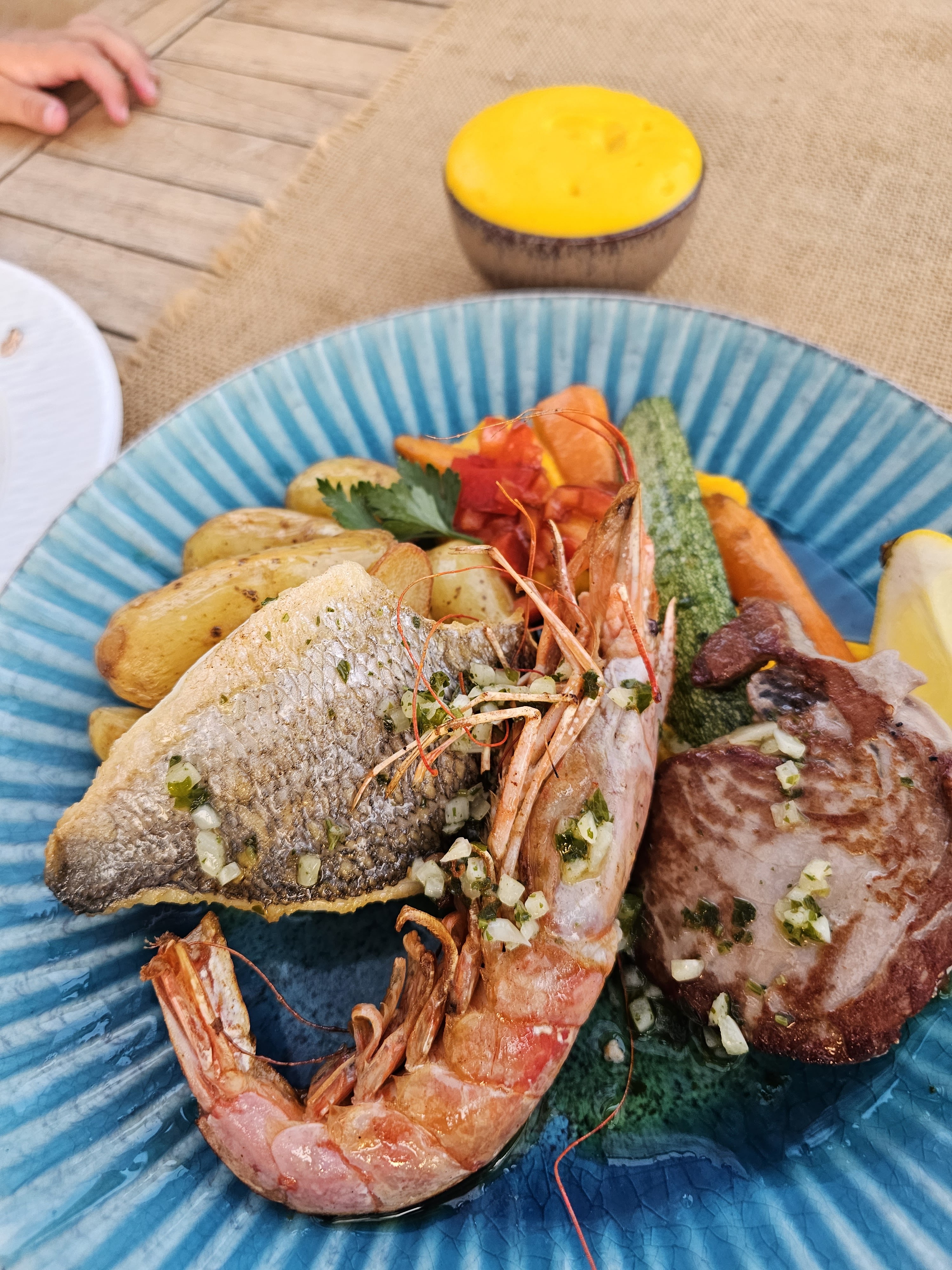 Très bon repas, la terrasse ombragée vu sur le port. On a pris les assiettes de la mer avec le trio de poissons : excellent. Service impeccable. Manque juste le pain à mon goût. Sinon Rien à redire.