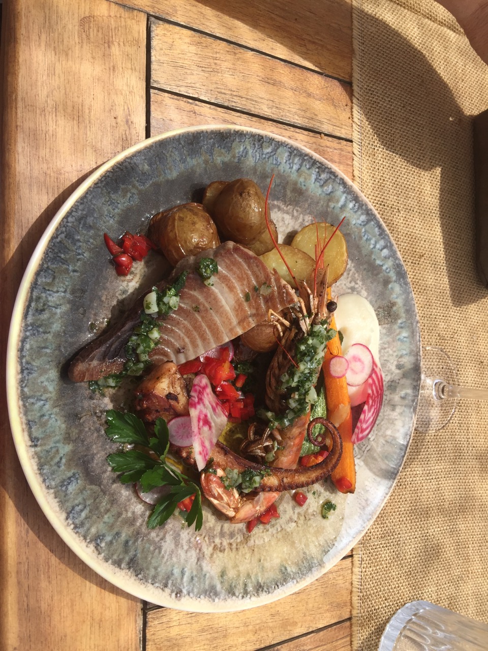Nous avons été accueillis avec sympathie et mangé sur le pouce une petite planche à partager parfaite pour les petits appétits et grosse chaleur cela dit beau choix de poissons et viandes pour les plus gourmands bref nous avons passé un moment agréable