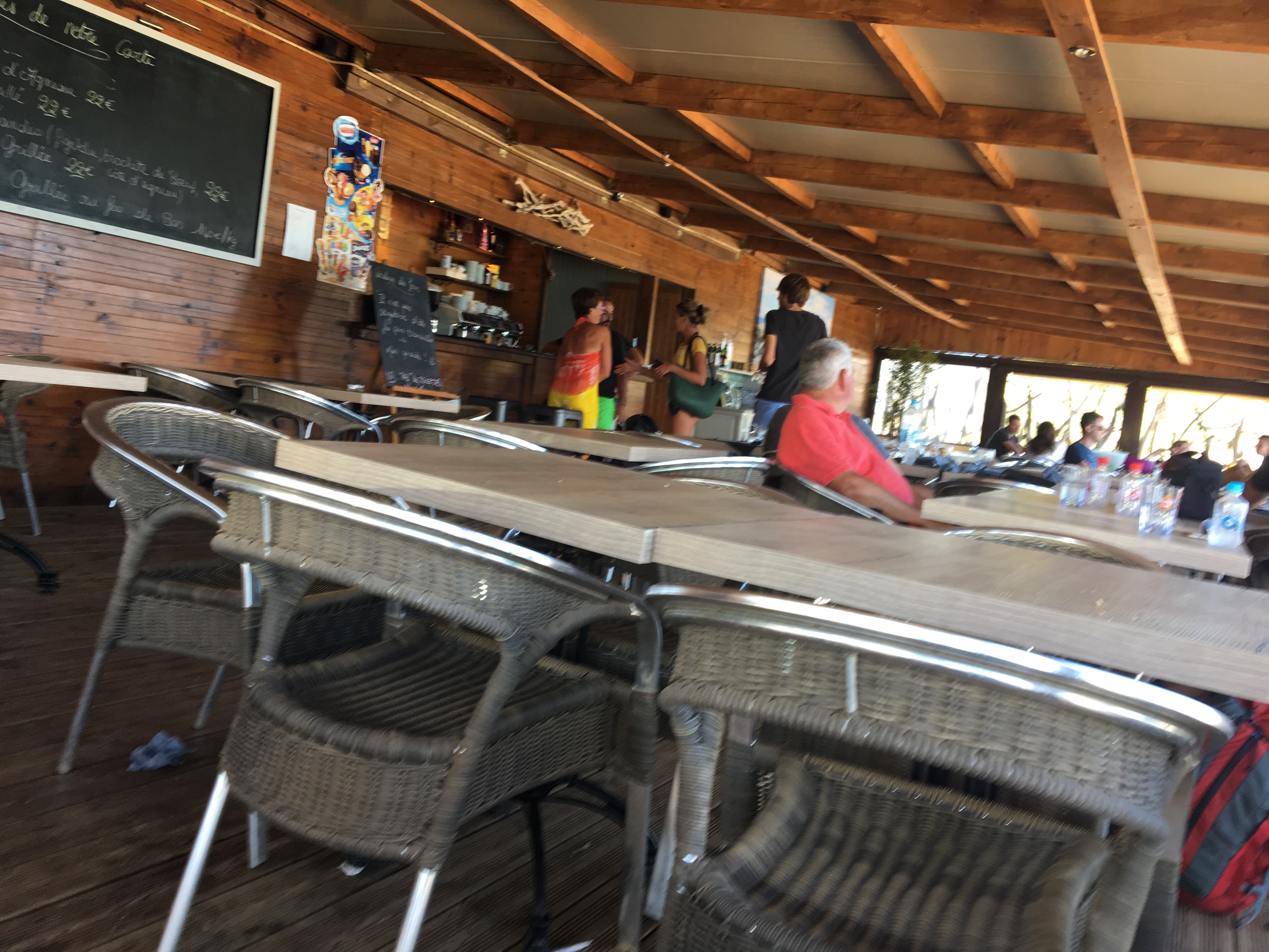 Le coin situé à l'extérieur est agréable malgré de temps à autre une odeur de vaches en liberté. Le personnel quand à lui est désagréable envers les clients. Boire un Morito déjà payé une heure et demie avant un couvert de 100 personnes devrait être autorisé ! Je me suis retrouvée à le boire debout parce qu'on ne peut pas le boire sur la plage a moins de retrouver des grains de sable dedans. Je me suis dit que ce n'était qu'une fois et qu'il y avait une partie liée au stress mais non. J'y suis retournée une semaine après et le personnel était toujours aussi agréable ( /!\ Notez le SARCASME => le personnel n'était pas accueillant et organisé) De plus il n'y a pas de toilettes donc si vous avez besoin de vous lavez les mains ou d'aller aux toilettes pour pouvez toujours rêver.