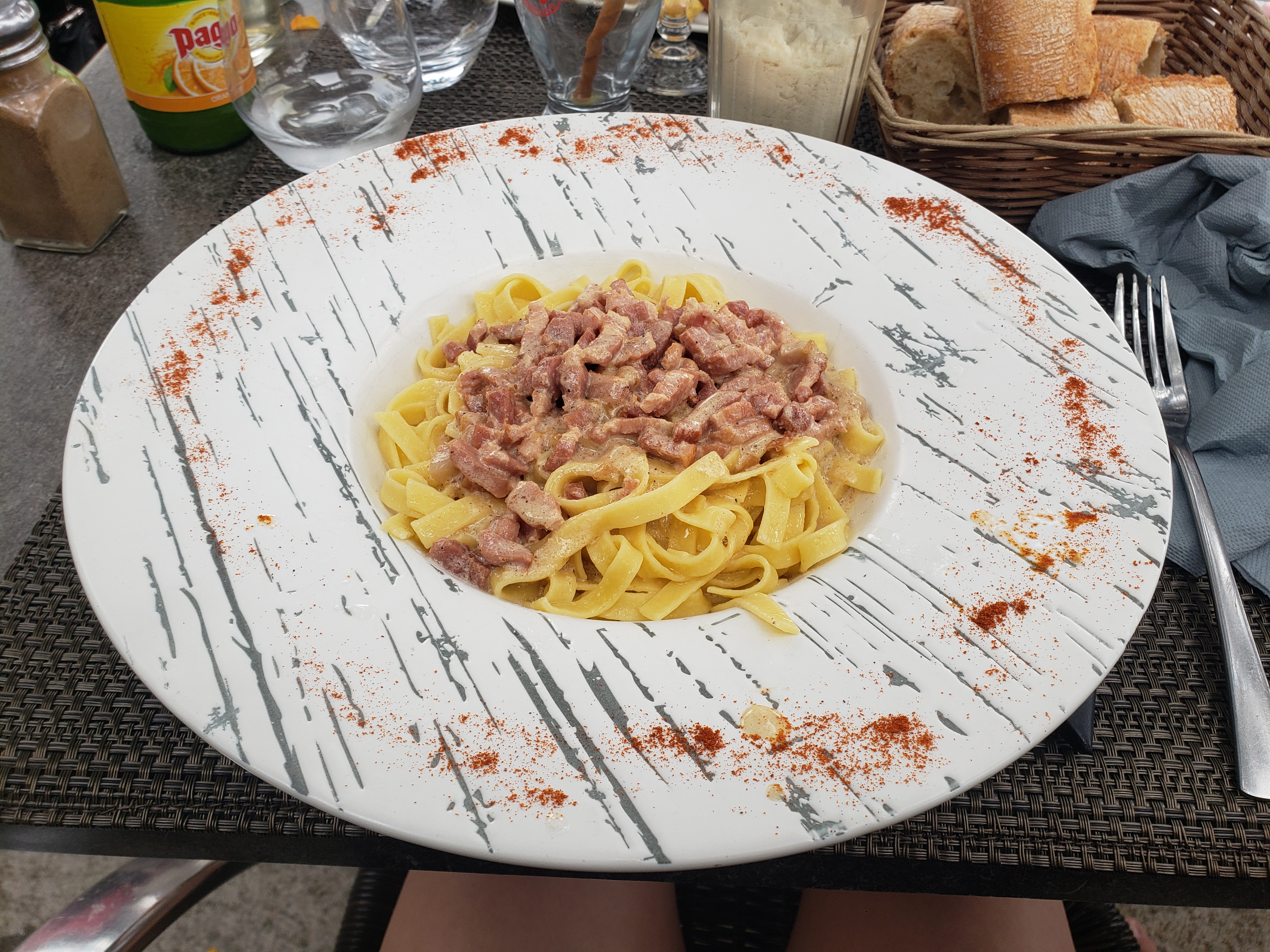 La terrasse est charmante avec sa vue surplombant la vallée et son beau chêne. Malheureusement, plusieurs points noirs: - je suis venu seul et je n'ai pas pu choisir ma place alors que le lieu était désert et que plusieurs tables sont restées vides pendant ma visite, - les tagliatelles a la carbonara étaient insipides, comme si les lardons avaient été cuits à l'eau et qu'on avait utilisé de la crème trop liquide, sans œuf. Les pâtes baignaient dans leur jus. Point positif: La serveuse est souriante, compétente et très réactive. Donc venez toujours à deux au moins pour éviter ce traitement, et ne touchez pas aux pâtes.