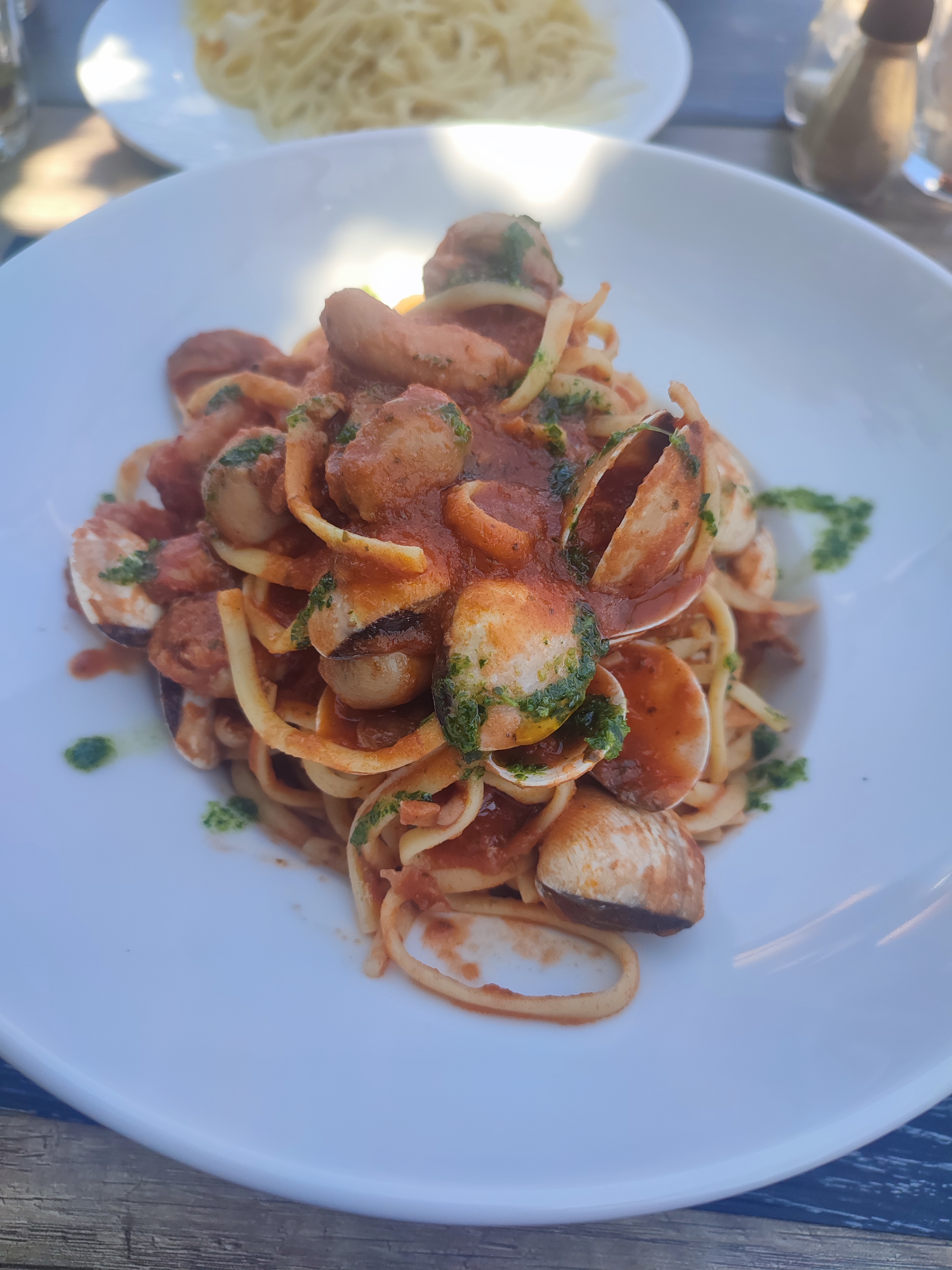 Très beau cadre, quasiment les pieds dans l’eau, bel accueil du serveur, par contre déçus par les linguine aux fruits de mer et au poisson qui n’était pas assez cuit et servies tièdes (cher 30€!), calamar absent du plat aussi…. Propreté à revoir ( toilettes et desserte à dessert)