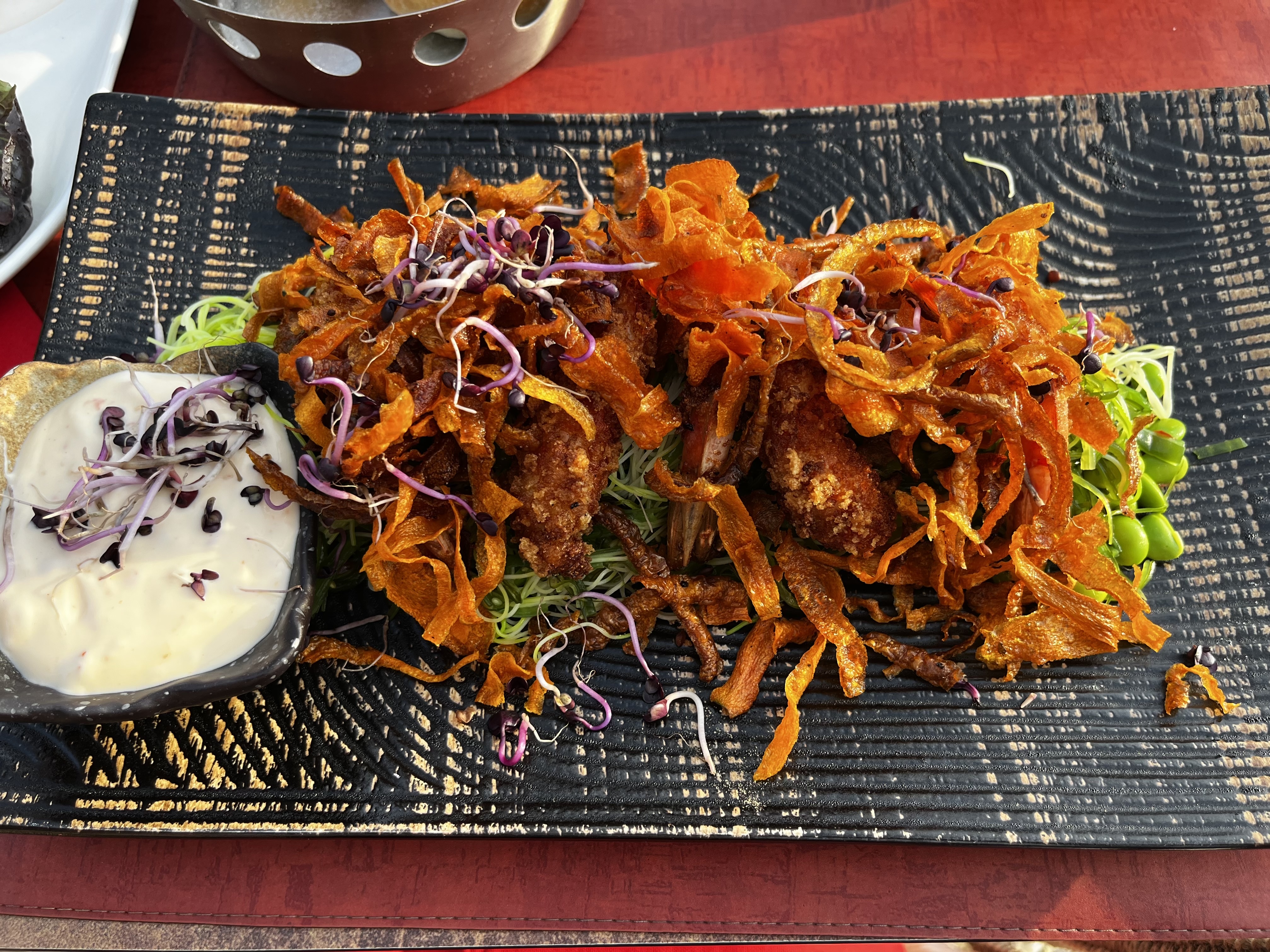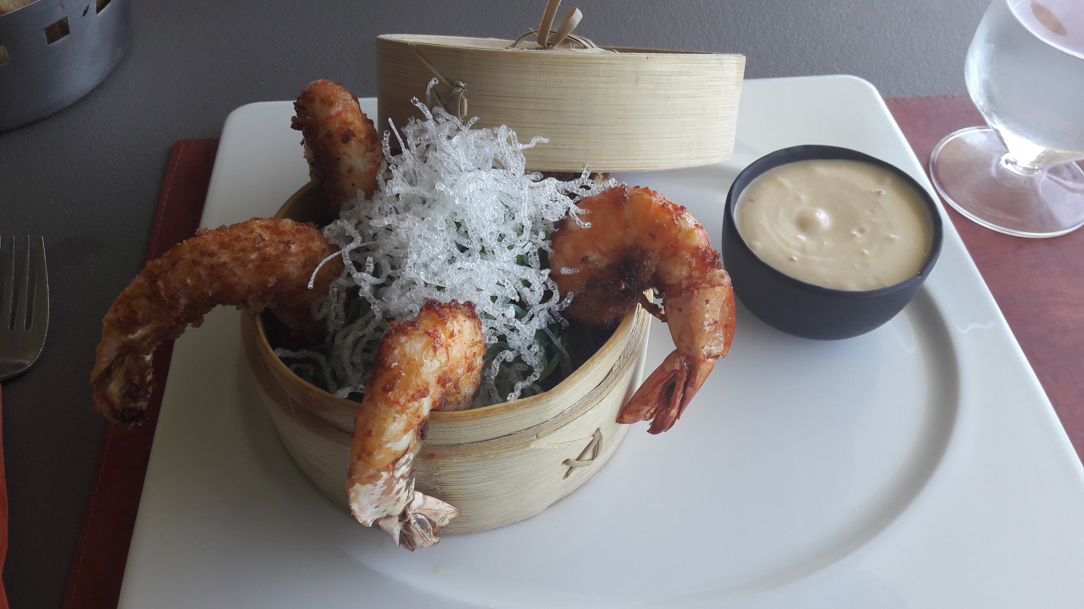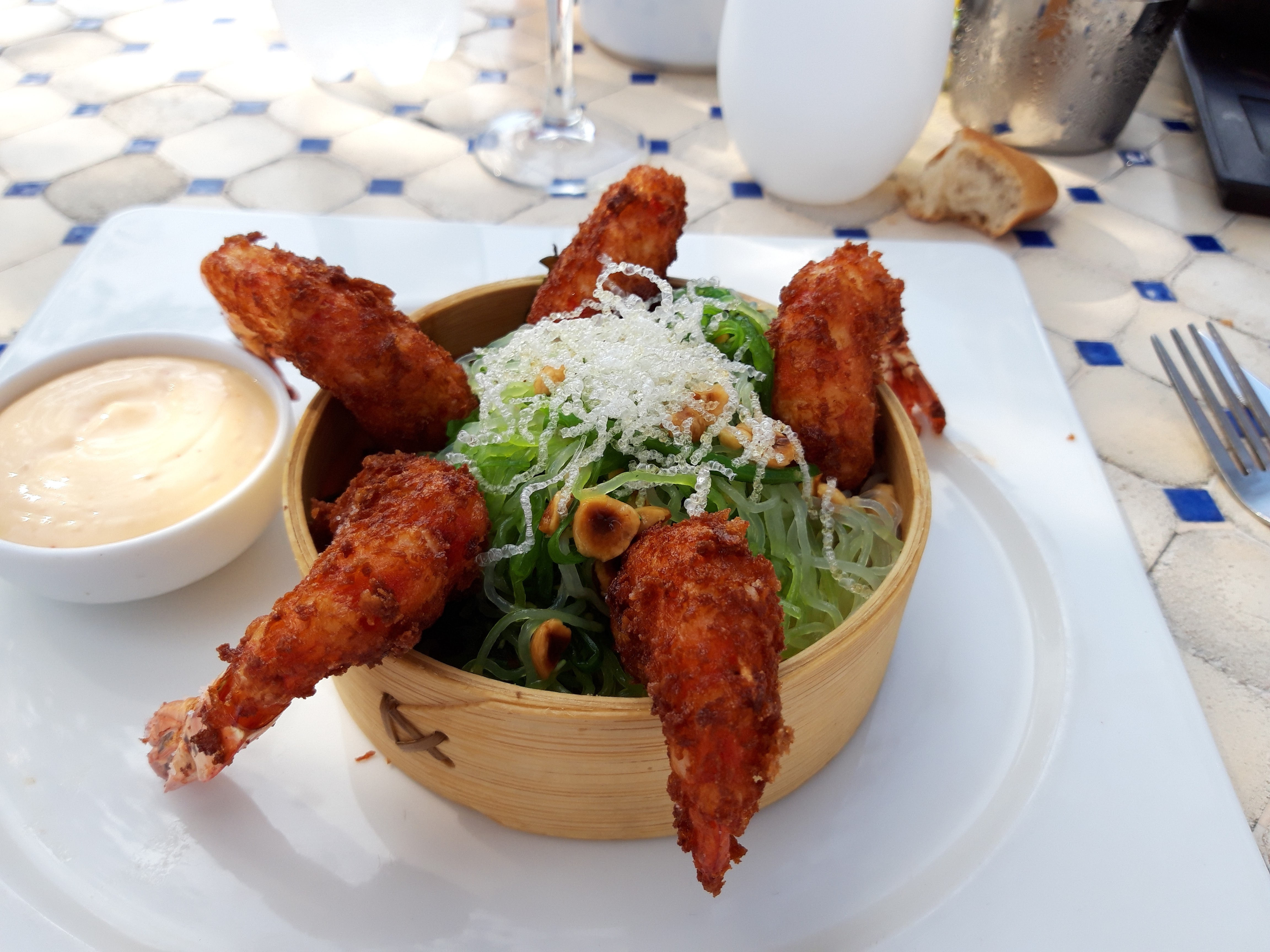 Avis pour le restaurant de la plage et non le gastronomique du même nom. 2 entrées, 2 desserts, 2 pintes, 1 cocktail: 94€ Juste, non. La qualité était très passable, surtout pour une addition aussi élevée. Au sujet de l’entrée “gambas croustillantes”: les gambas (crevettes?!) étaient sèches et très petites, sur cuisson de la panure. Les nouilles de riz (avec 3 Wakame qui se battent en duel) étaient dure. Bref UNE HONTE, le plat ne ressemble plus du tout aux photos postées précédemment.
