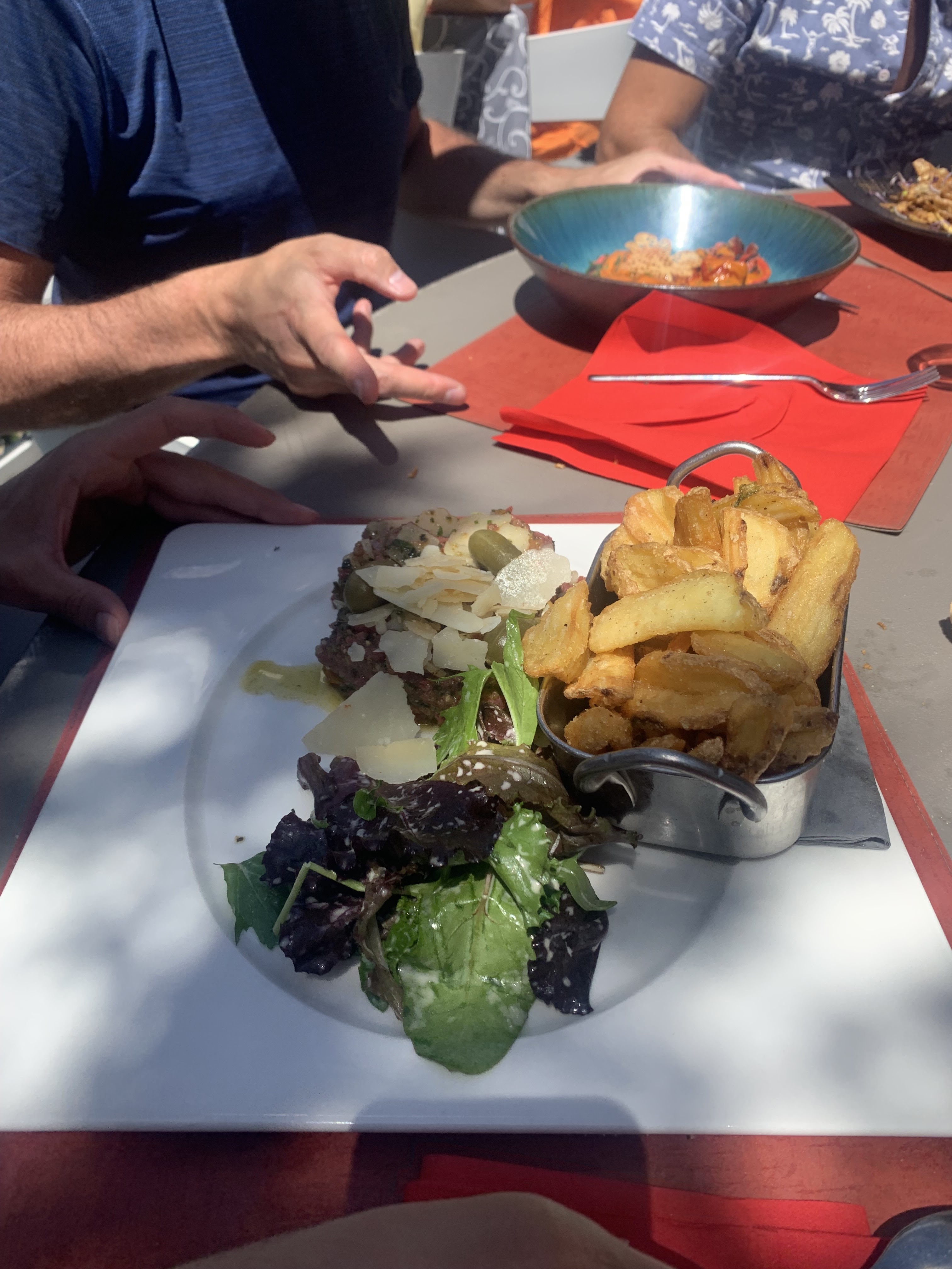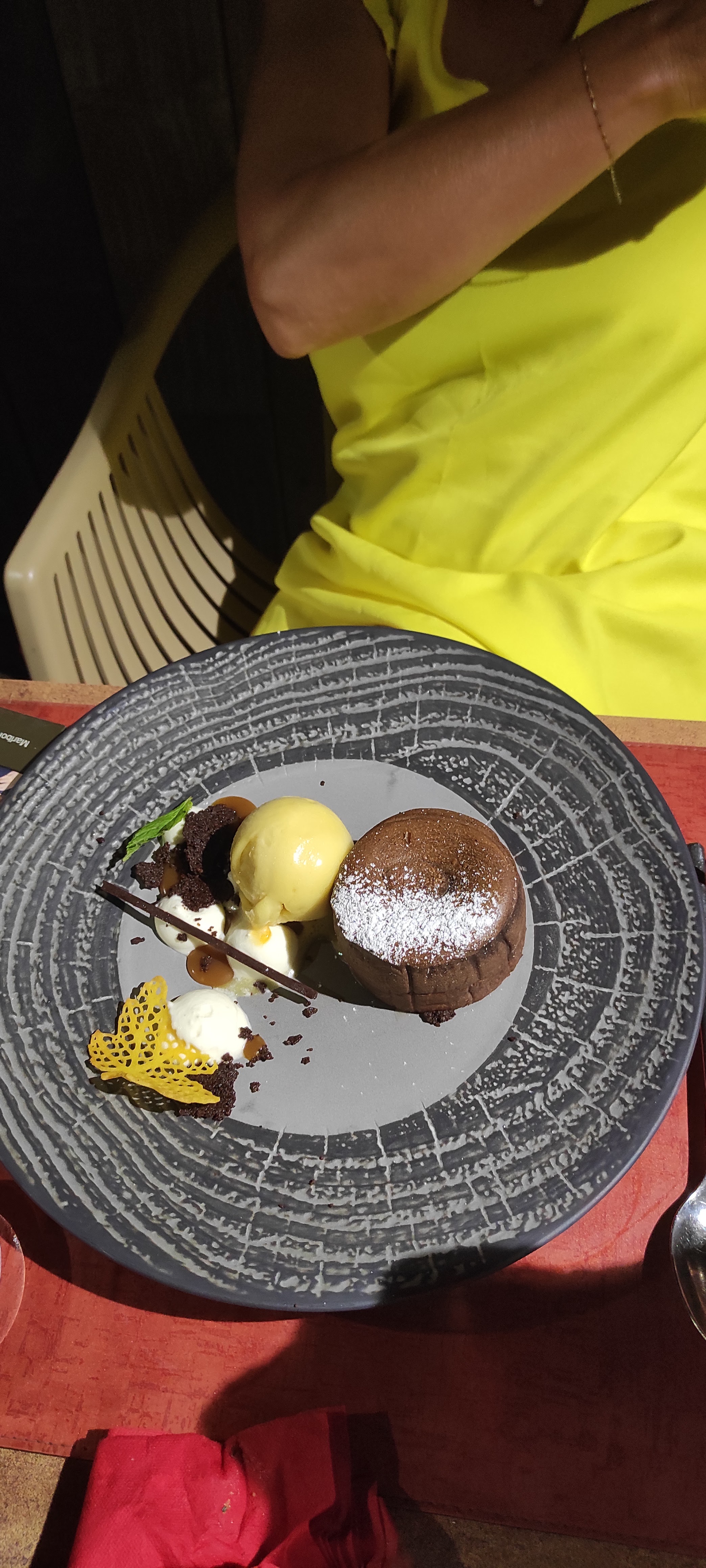 Je parle du restaurant de la plage dans cet avis. Une agréable soirée avec des amis qui en ont fait leur cantine. Le restaurant est grand donc il faut parfois patienter mais on est en vacances , avec une vue magnifique sur Santa Giulia , les serveurs sont adorables , la carte alléchante alors profitons ! Les enfants peuvent jouer directement dans le sable (pensez à la bombe Anti-moustiques) Pour le menu : Tout donne envie... Nous avons pris le t bone (32 euros). Les portions généreuses , la viande goûteuse , la cuisson maîtrisée et les accompagnements délicieux. Le plat pour les enfants est alléchant (enfin un vrai poisson frais pané!) Les légumes sont cuisinés et les frites maison. Le meilleur pour la fin ... Le dessert ... Tout donne envie...alors... J'ai pris deux desserts ! Sans regret ! Notre seul regret : ne pas l'avoir trouvé avant ! Mais une bonne raison pour revenir à Porto vecchio l'an prochain (Nous avions testé le gastronomique l'an dernier, ce fut très bon mais trop cher au vue de la prestation; depuis l'an dernier ils ont perdu l'étoile mais les tarifs restent les mêmes).