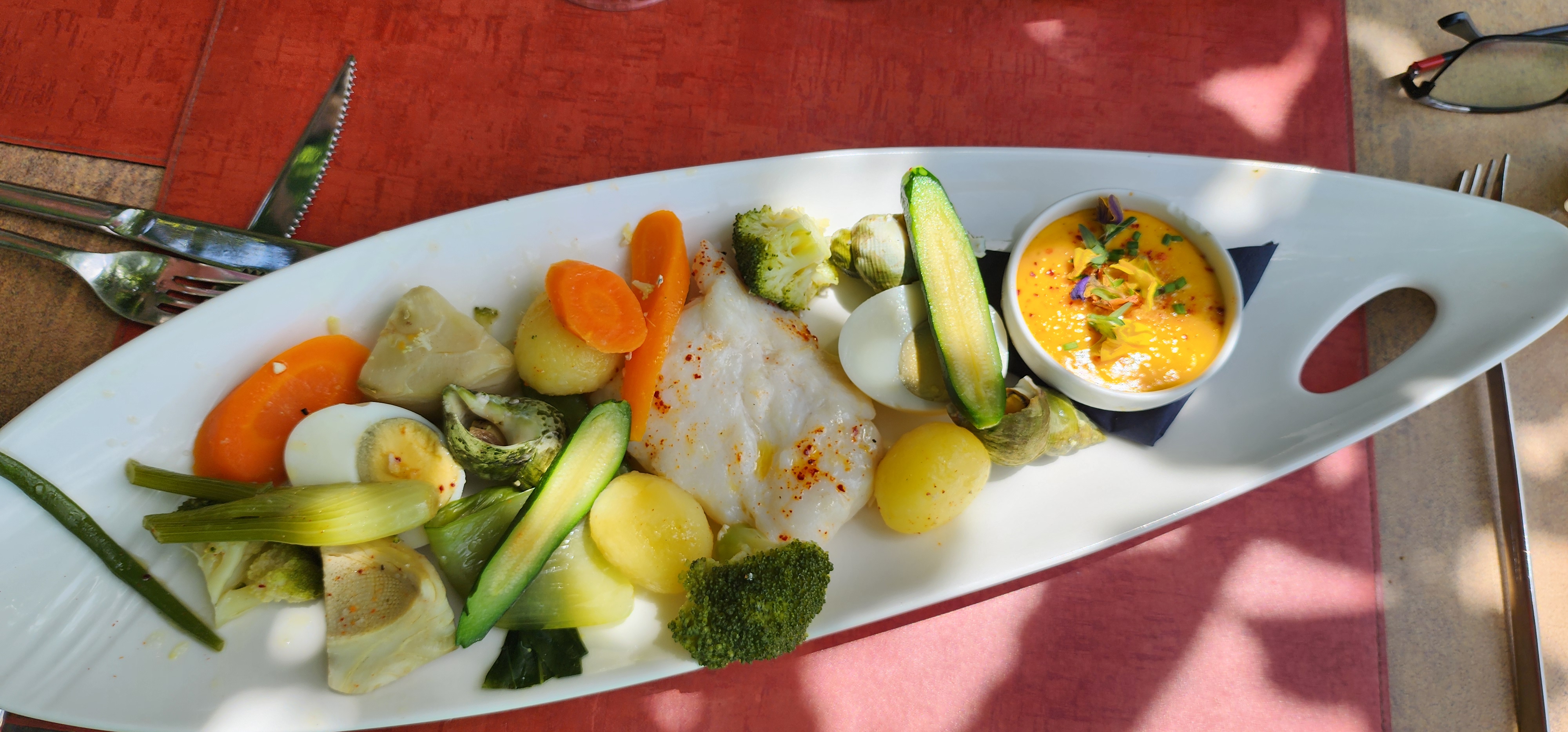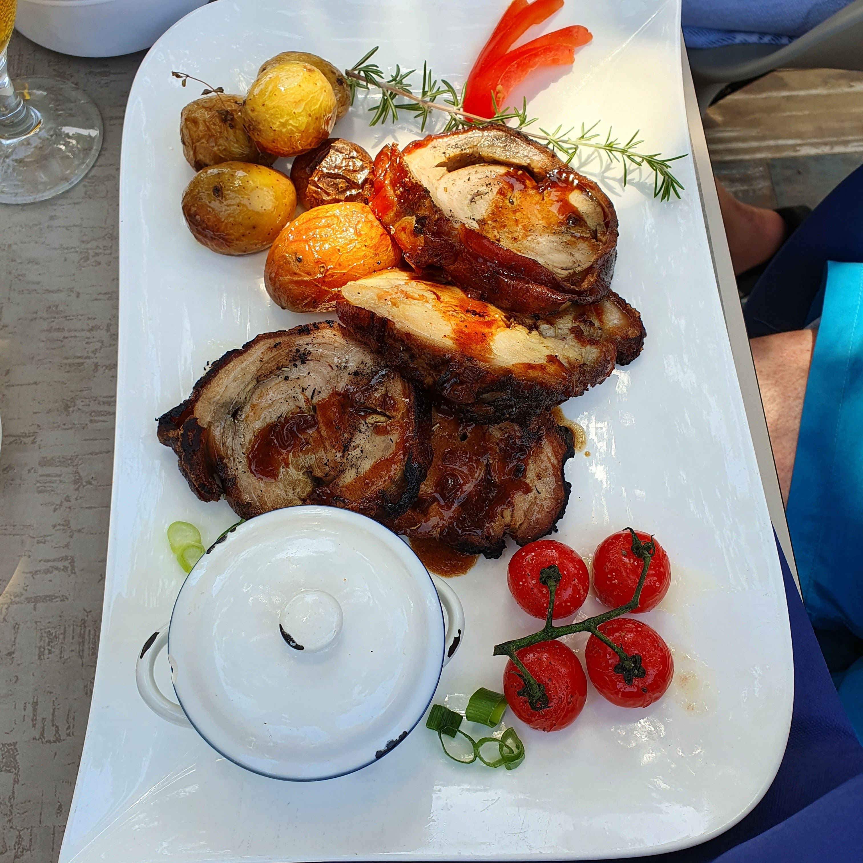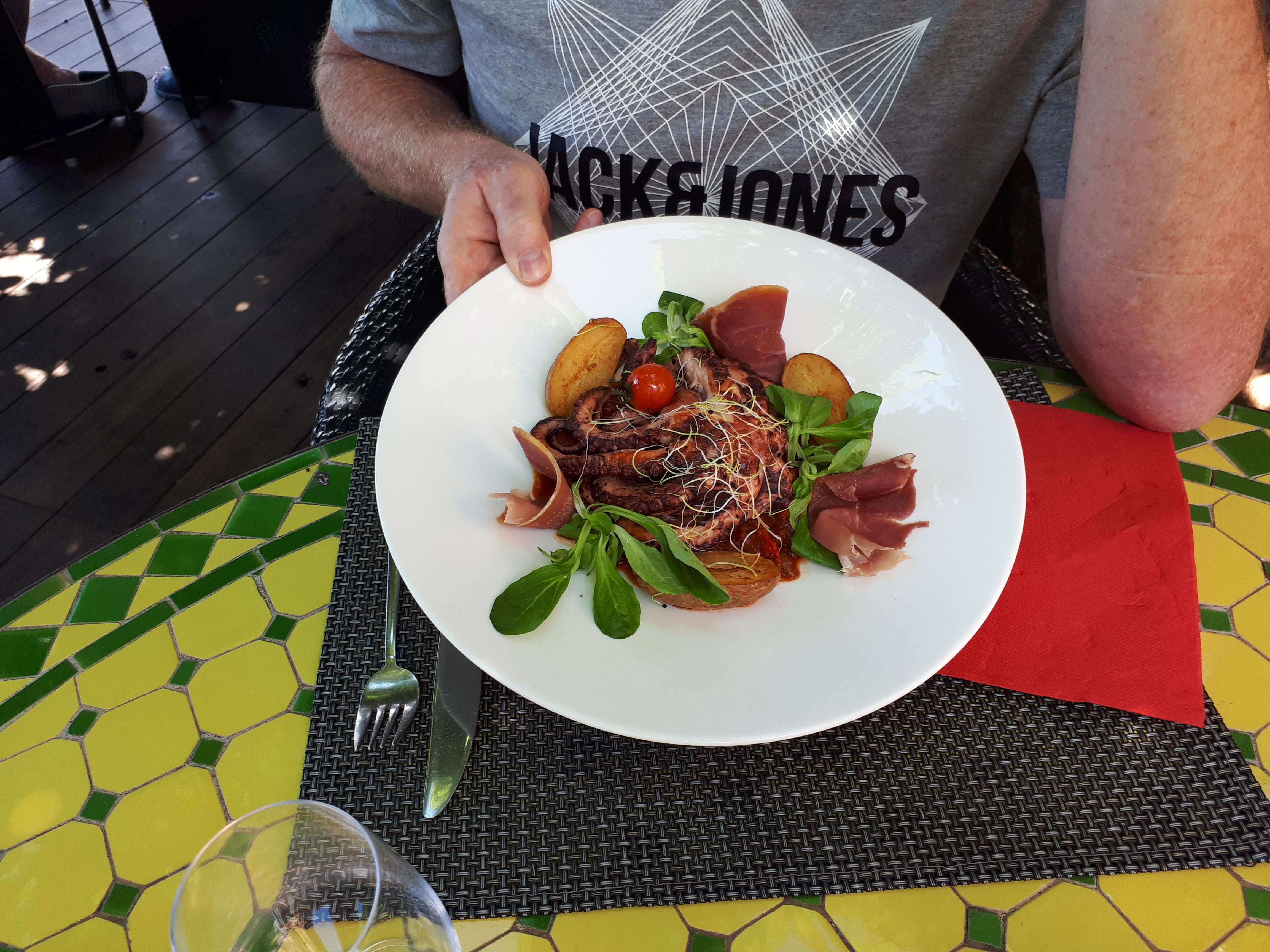Juste magnifique. Nous avons commandé que des produits locaux : sole, Saint Pierre, gambas, daurade.... des très bons produits avec un cadre parfait !!!!! Temps magnifique en plus de cela.