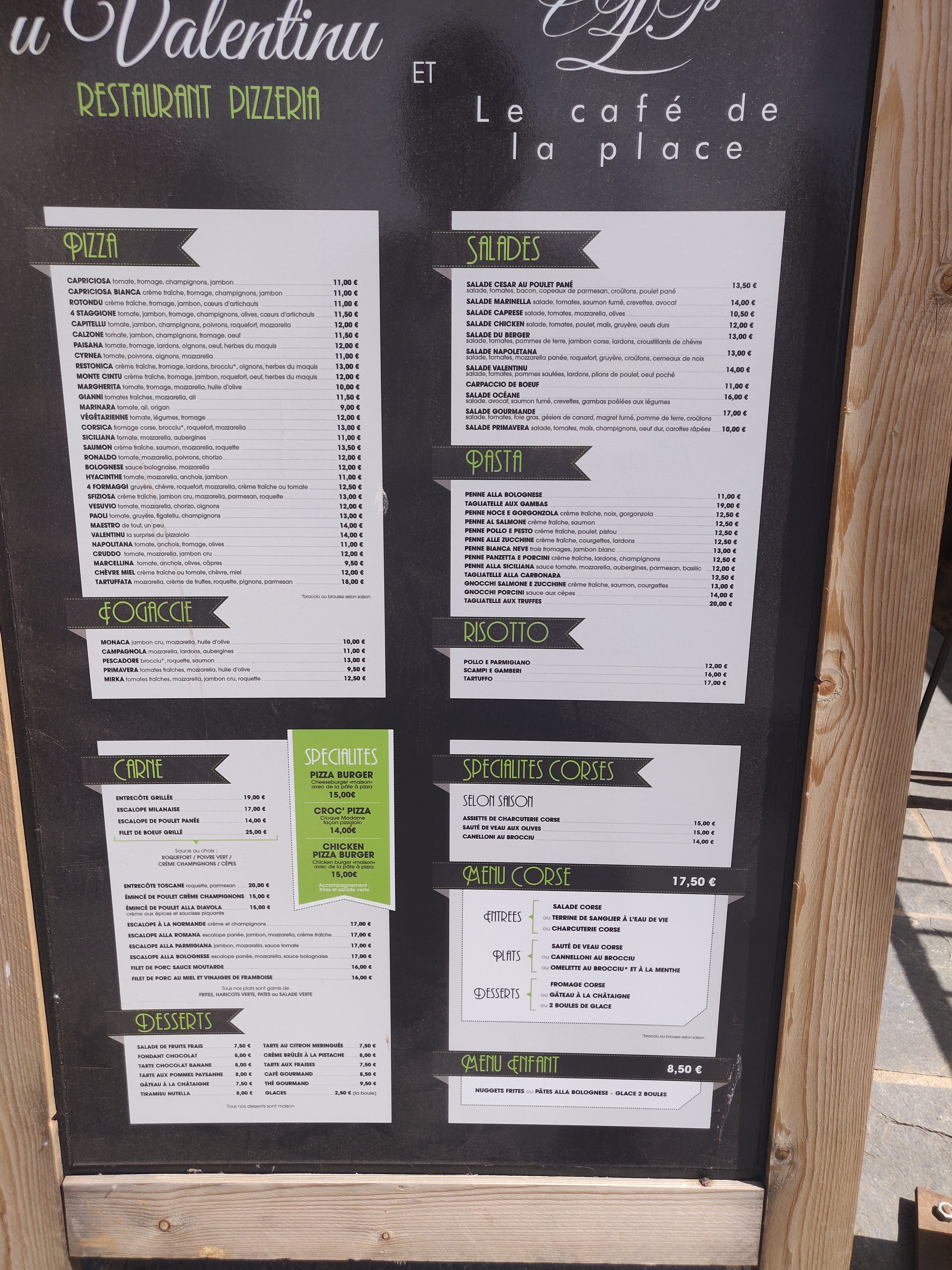 Si vous allez dans le centre ville de Corté je recommande ++++++ U Valentinu avec (suivant la saison bien entendu) les lasagnes au brocchiu et à la menthe sauvage....juste une tuerie Accueil sympa Cuisine un régal et très copieux Prix très correct Possibilité de choisir ombre ou soleil c'est un petit + à ne pas négliger