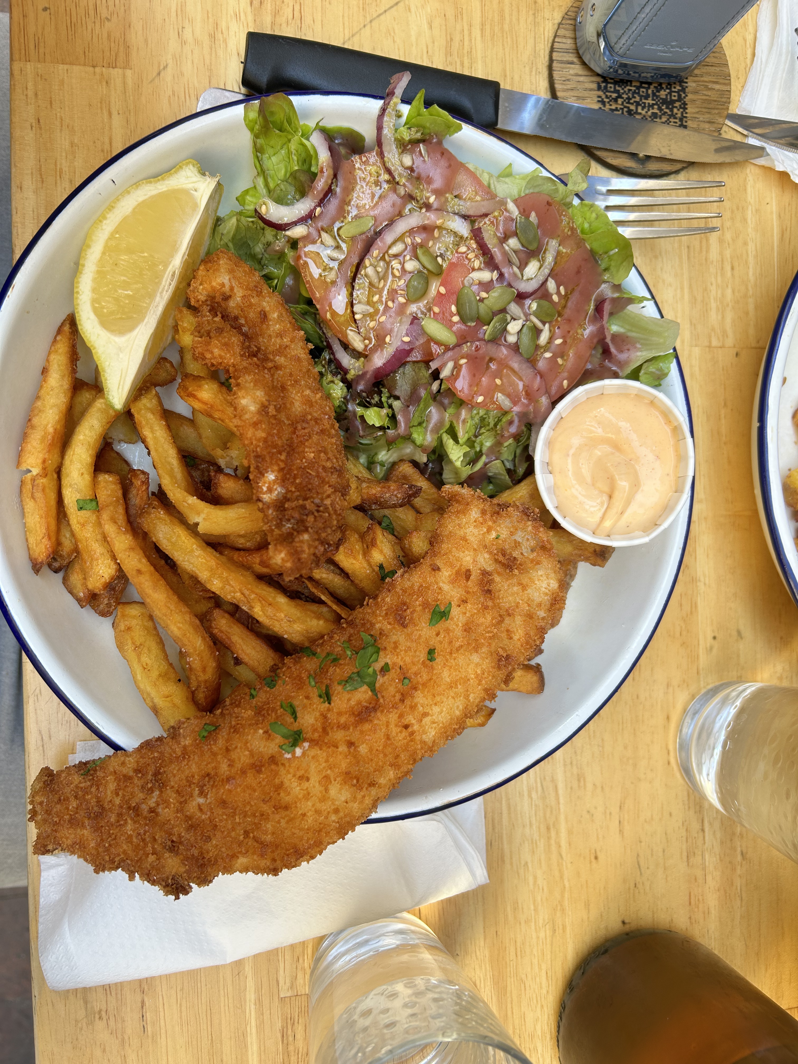 Très bon fish and chips, frites maison, poisson croustillant et aïoli maison au top 👌