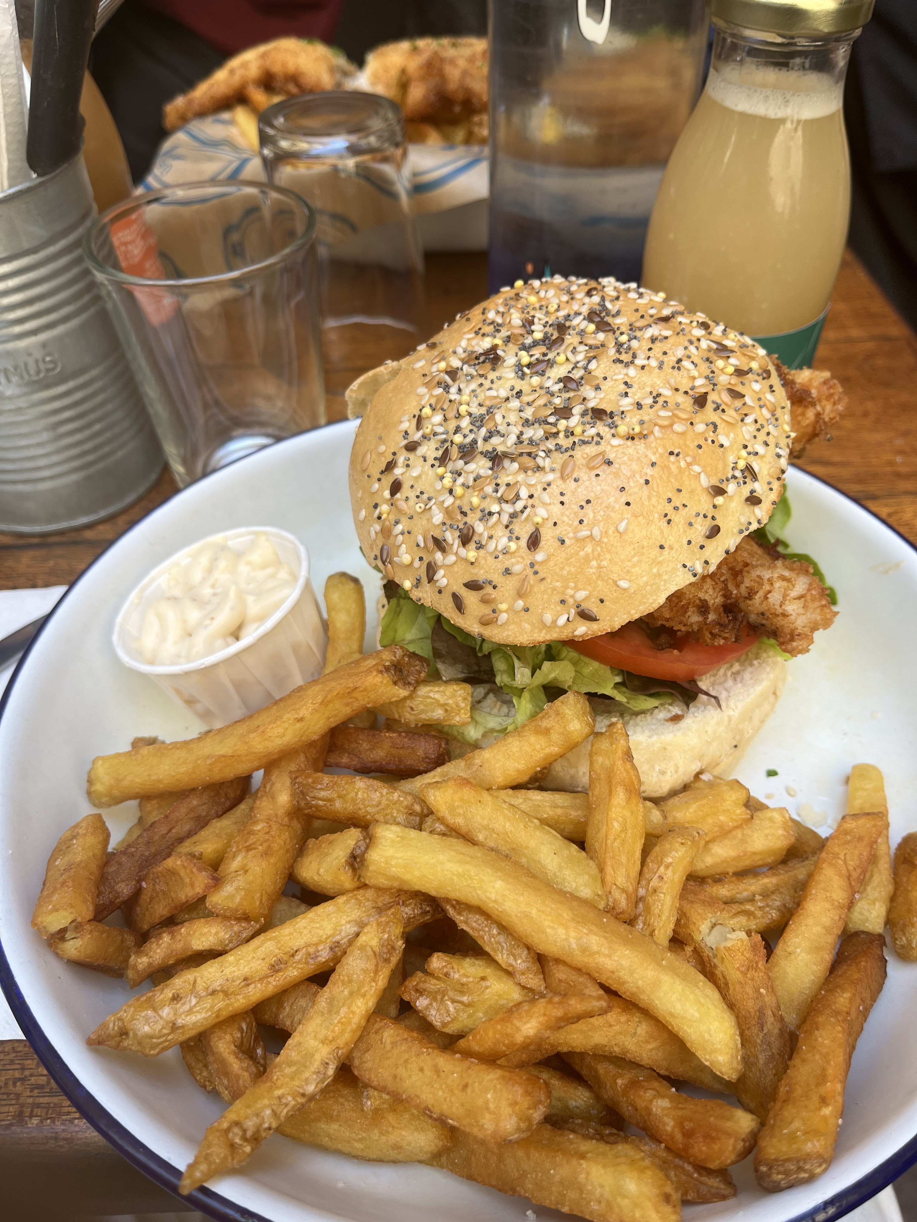 Très bonne adresse. Un burger au poulet croustillant avec du pain frais, tout ça accompagné de frites et leurs sauces maison à tomber par terre (je conseille l'aïoli) Je recommande à 100% !