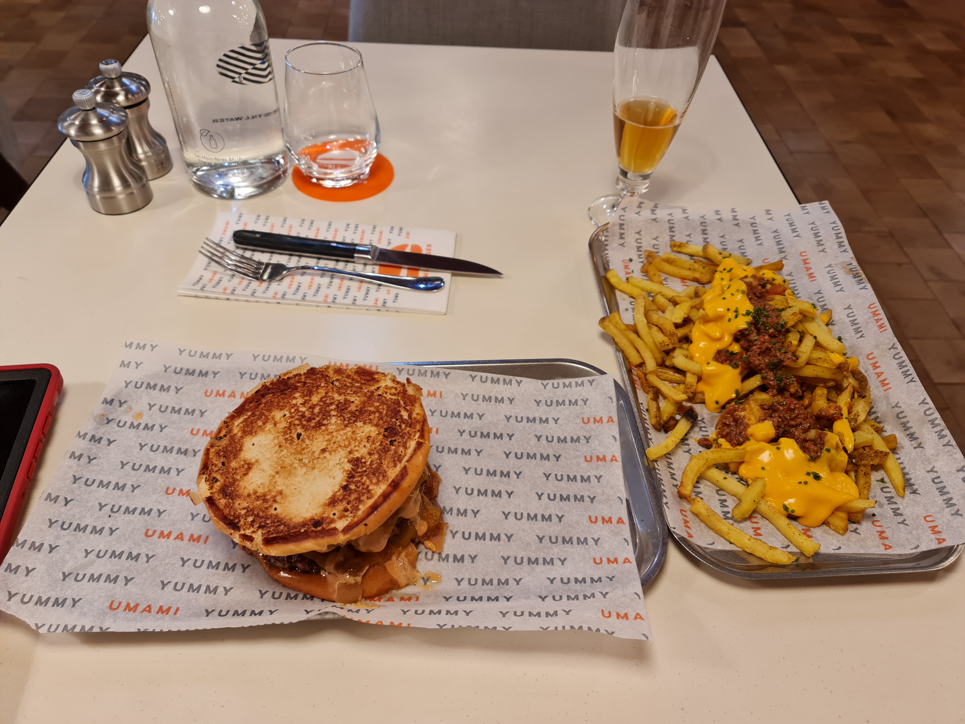 Après des mois d'attente et faisant fi des nombreux avis négatifs, j'ai tenté de me faire mon propre jugement sur Umami. Le rapport qualité/prix est assez scandaleux : - Des cheesy potatoe tots ultra bourratifs que je n'ai pas pu finir. - Un patty melt burger qui n'a rien de comparable au délicieux West de chez Blend (pour ne pas dire au Quick N'Toast, c'est dire le niveau...). - Des frites mollassonnes qui baignent dans une sauce cheddar d'origine douteuse. Cheddar qui n'a pas dû maturer très longtemps pour avoir une couleur orangeâtre aussi criarde. Le tout vendu à des prix accessibles uniquement aux personnes éligibles à l'ISF. Bref, un bon foutage de gueule en règle et je ne comprends pas ce que cette enseigne soi-disant révolutionnaire vient faire dans un hôtel de luxe tel que Pullman. J'ai perdu près de 50 euros pour un repas qui a fini tout droit à la poubelle et on ne m'y reprendra plus!