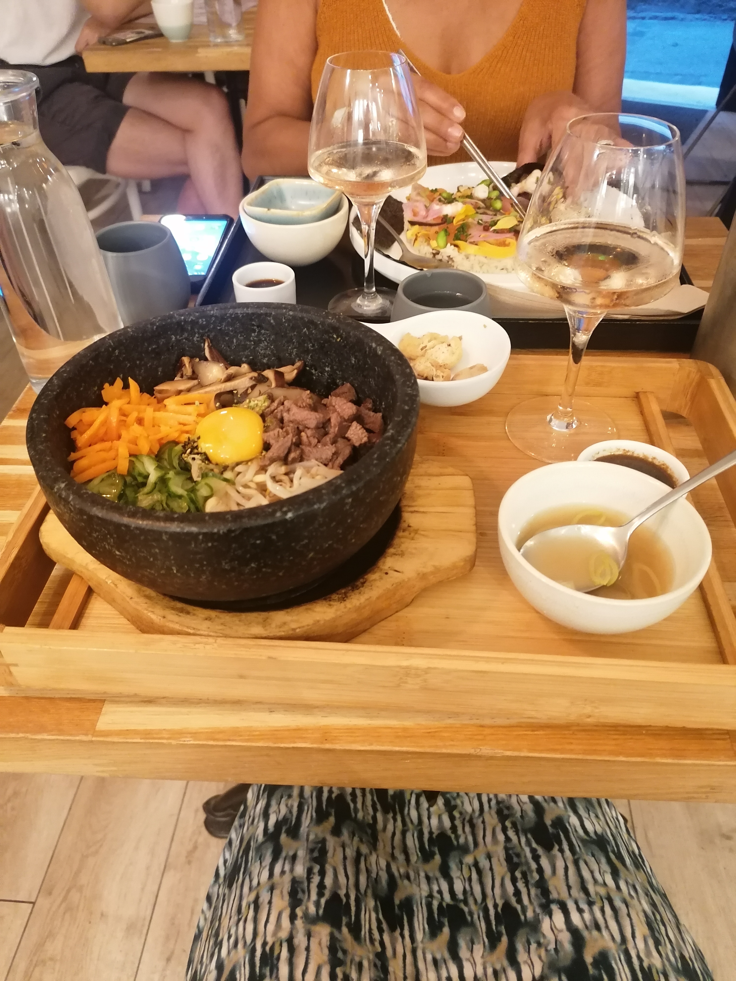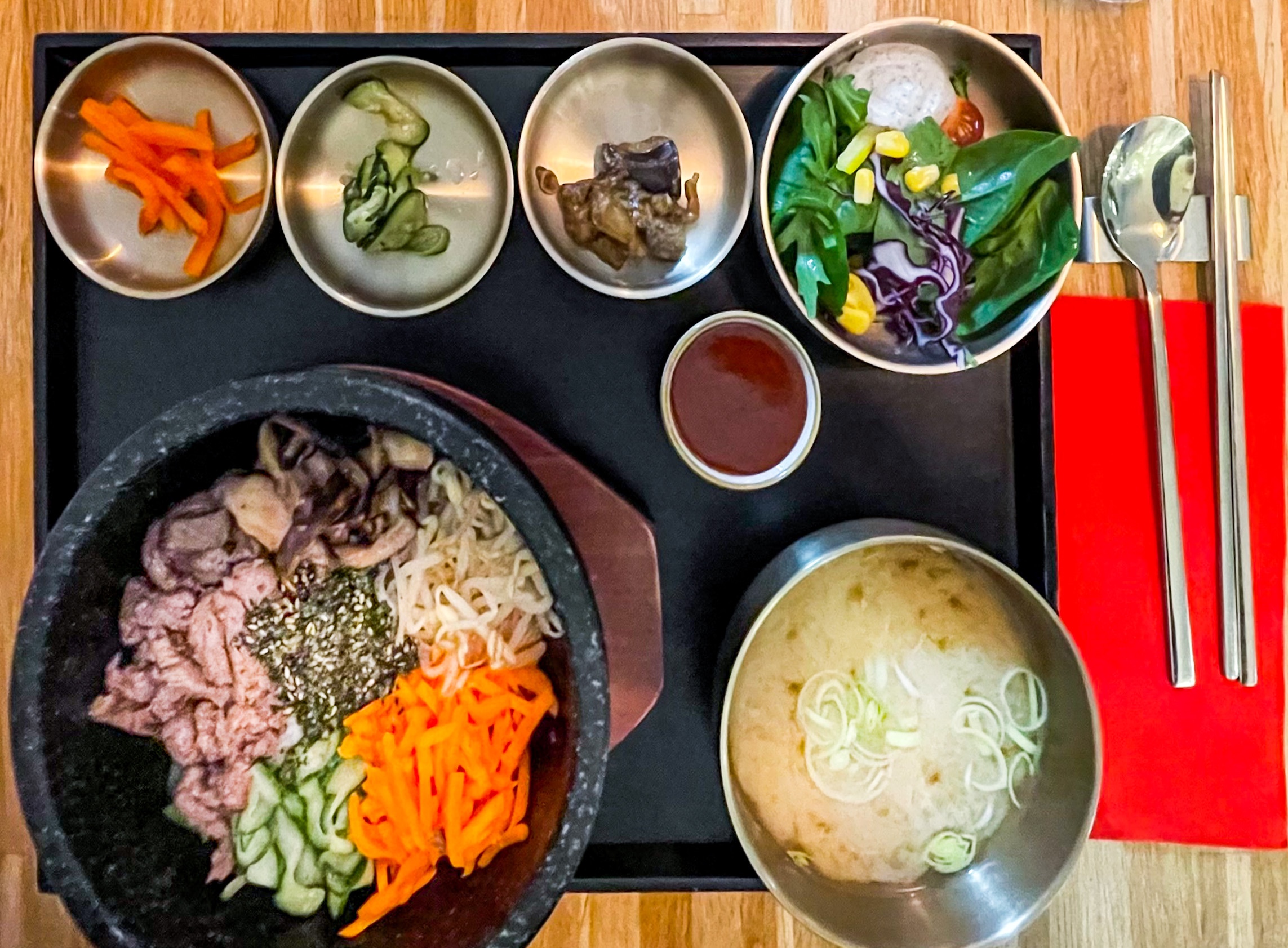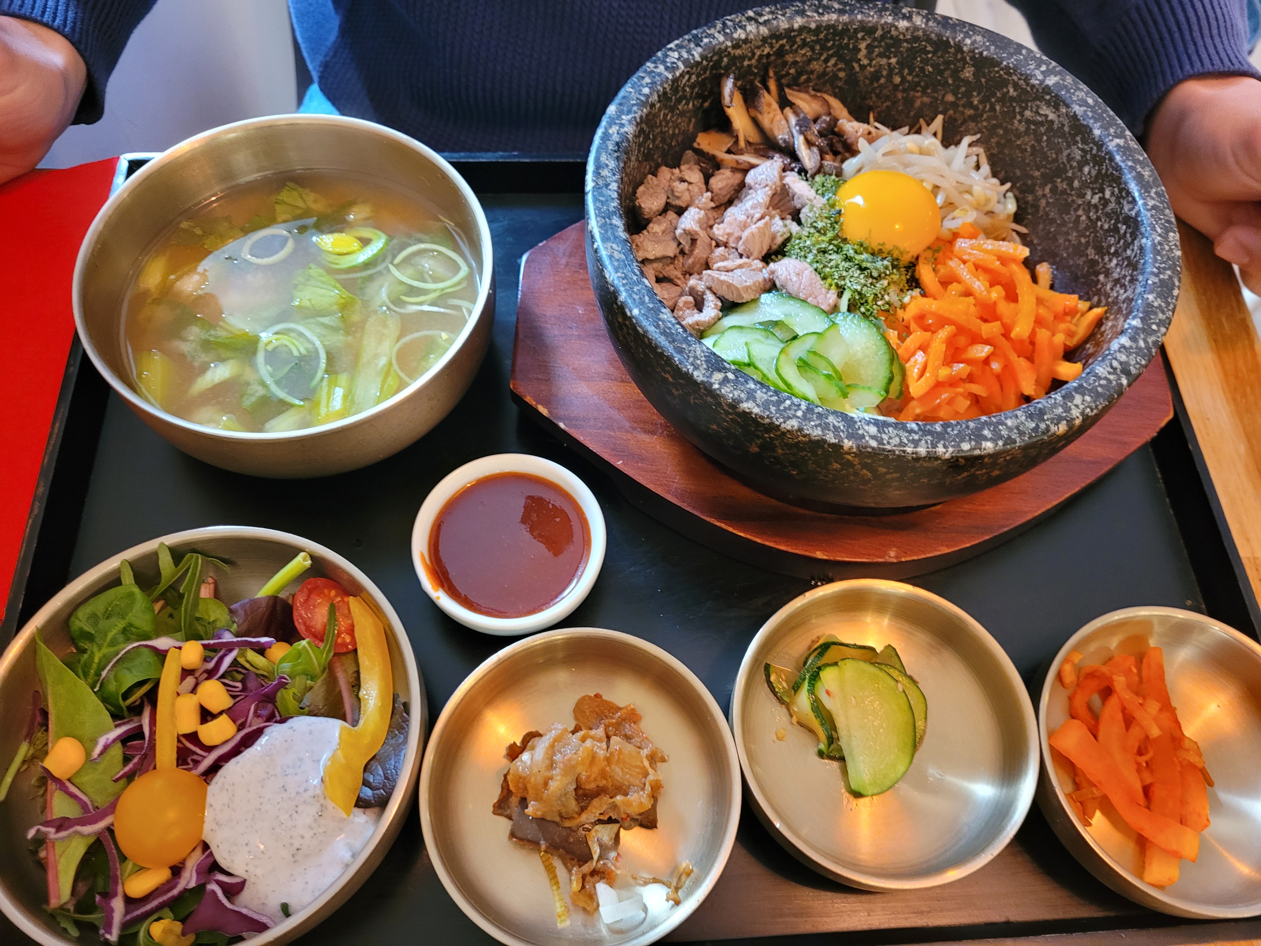 Plutôt déçu par rapport à l'ensemble des avis que nous avions lus. Le bibimbap était bon, mais pas renversant non plus, et la soupe en accompagnement ressemblait à celle que l'on trouve dans de nombreux restaurants asiatiques, avec ses petits cubes de tofu... En plus les prix sont quand même assez élevés, surtout pour déjeuner (19 € le bibimbap, 10 € le dessert, 3 € le café !), bref le rapport qualité prix n'est franchement pas bon. A noter également que les tickets restaurant ne sont pas acceptés. 😕
