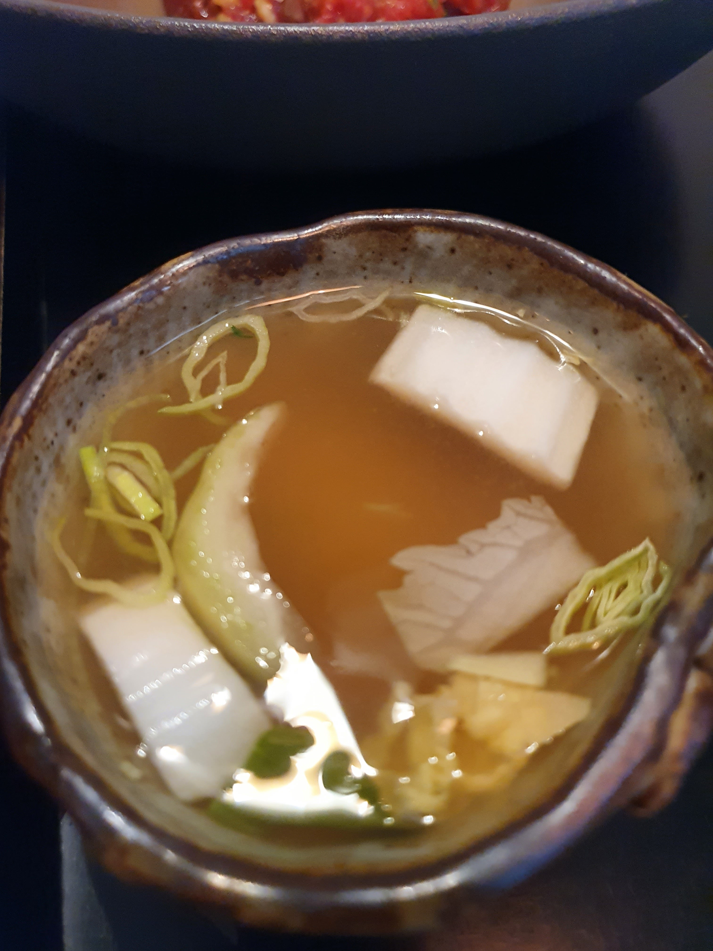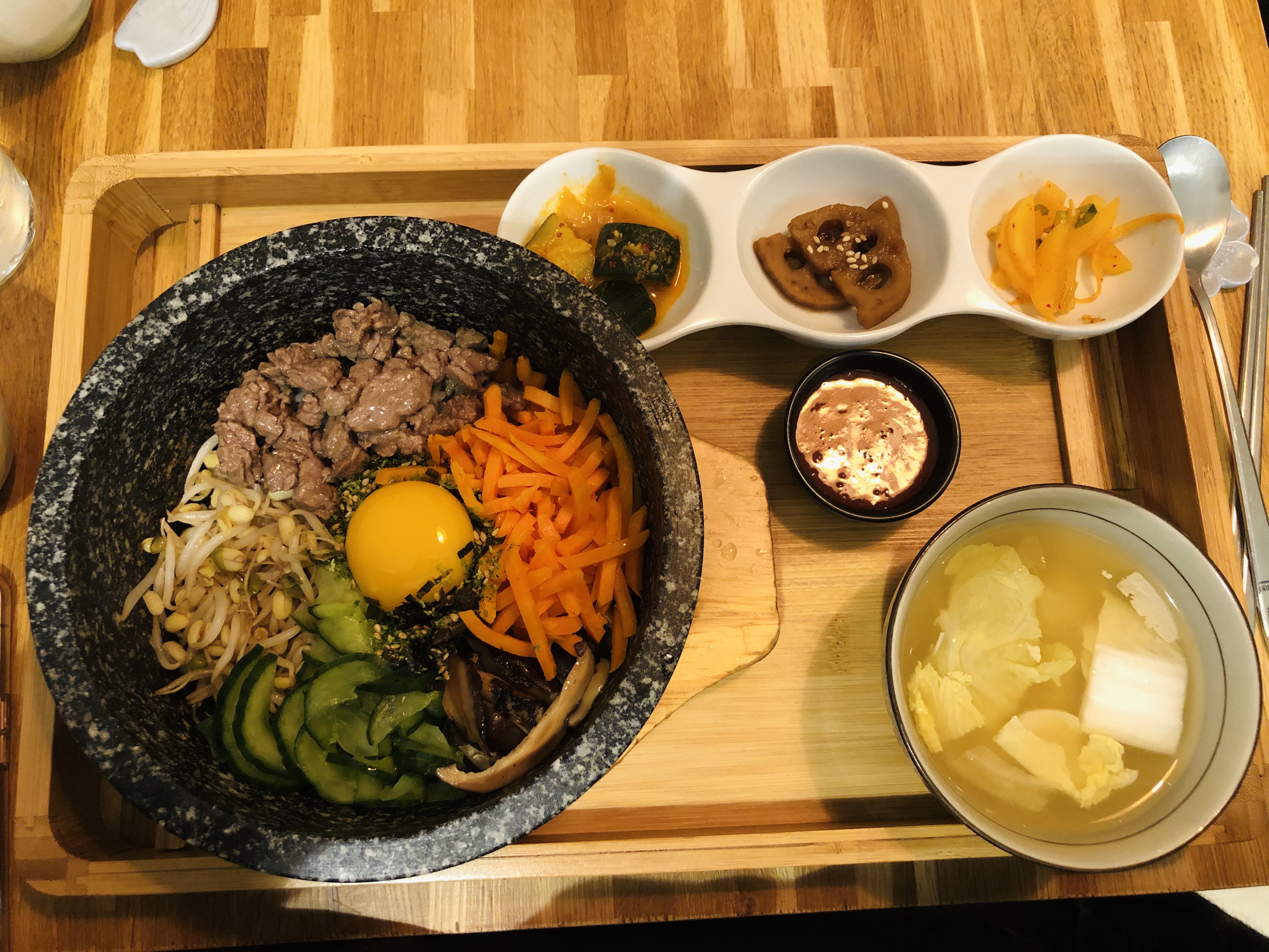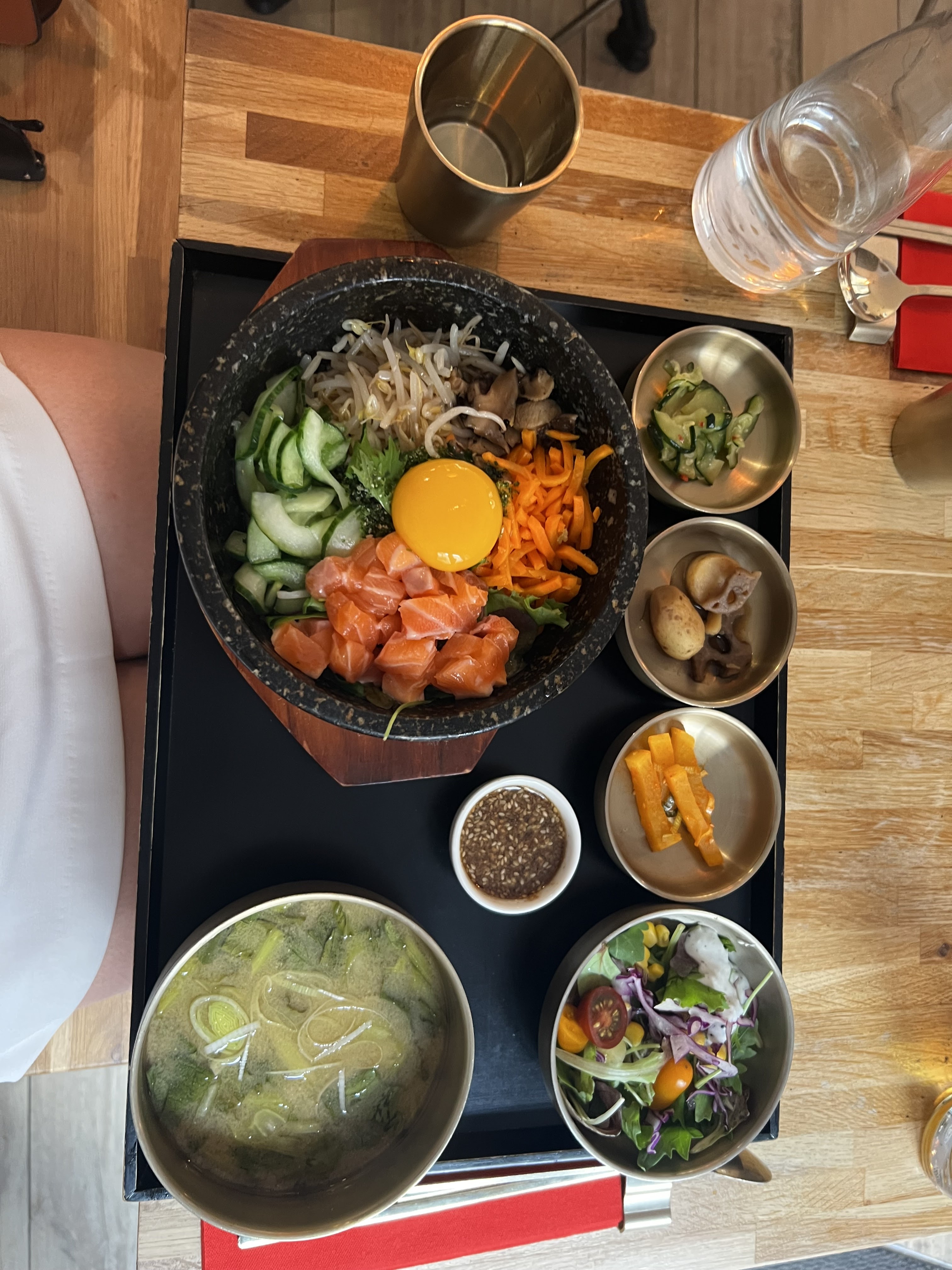 Plutôt déçu par rapport à l'ensemble des avis que nous avions lus. Le bibimbap était bon, mais pas renversant non plus, et la soupe en accompagnement ressemblait à celle que l'on trouve dans de nombreux restaurants asiatiques, avec ses petits cubes de tofu... En plus les prix sont quand même assez élevés, surtout pour déjeuner (19 € le bibimbap, 10 € le dessert, 3 € le café !), bref le rapport qualité prix n'est franchement pas bon. A noter également que les tickets restaurant ne sont pas acceptés. 😕