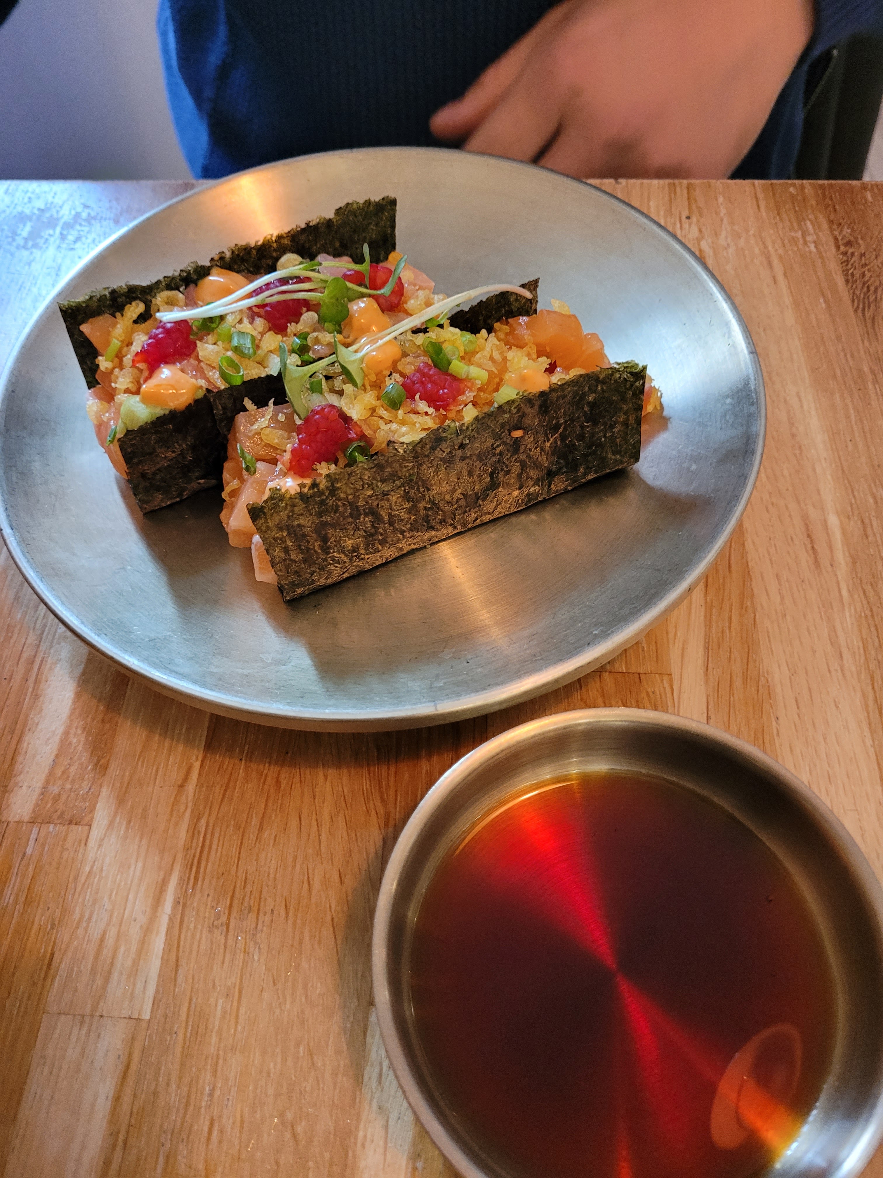 Un excellent moment : Le service était très gentil et efficace, malgré le restaurant qui s’est rempli très rapidement. Le tartare umami était particulièrement savoureux. Les saveurs multiples, marquées, bien équilibrées et très agréables. Un bibimbap de saumon, rempli de saveurs et très copieux. Enfin, le dessert : rêve de pommes, qui sait trouver un équilibre parfait entre l’acidité de la pomme granny, le sucré et la douceur de la Pana Cotta et le croquant de la meringue, le tout relevé et rafraîchit par un granité au shiso. Pas clairement indiqué sur la carte mais à discuter avec un patron/chef de salle passionné : plusieurs références de saké qui pourront vous faire découvrir de nouveaux horizons. Bref, un endroit qui vaut plus que le détour. La réservation est quasiment obligatoire.