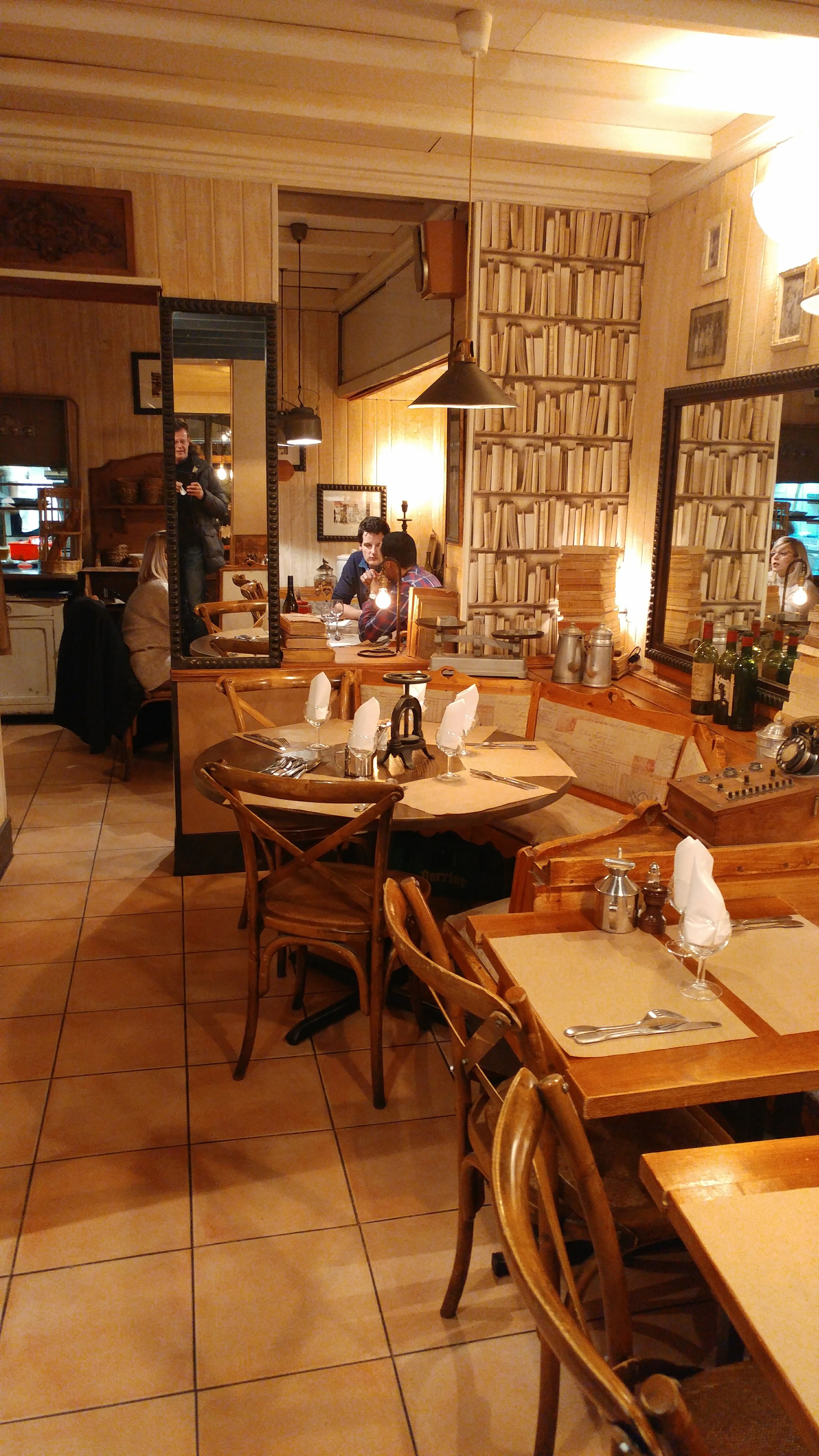 Après avoir été découragé par les bars à vin animés de la rue principale, ce fut un plaisir de trouver ce restaurant confortable dans une rue calme. La décoration est de style français classique avec de beaux livres et peintures anciens. Alors que nous ne nous arrêtions que pour du vin et un plateau de fromages, je reviendrais ici avec plaisir pour un repas. Très bien !