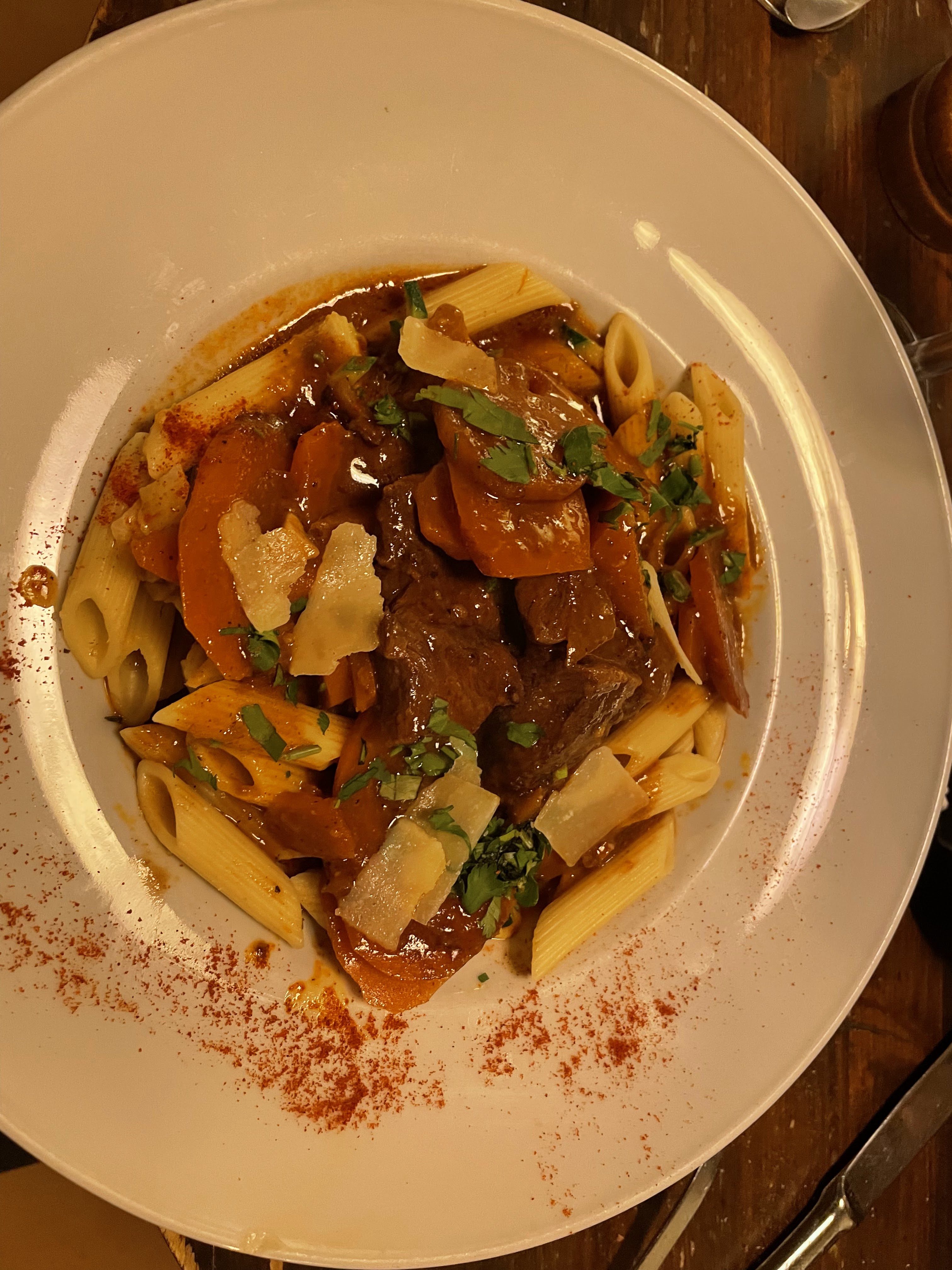 La viande qu'ils nous ont servie était froide, voire congelée, la soupe à l'oignon était un peu fade et le ragoût de bœuf manquait beaucoup de viande accompagné de trop de nouilles épaisses.... A Paris nous avons mangé bien mieux dans d'autres sites