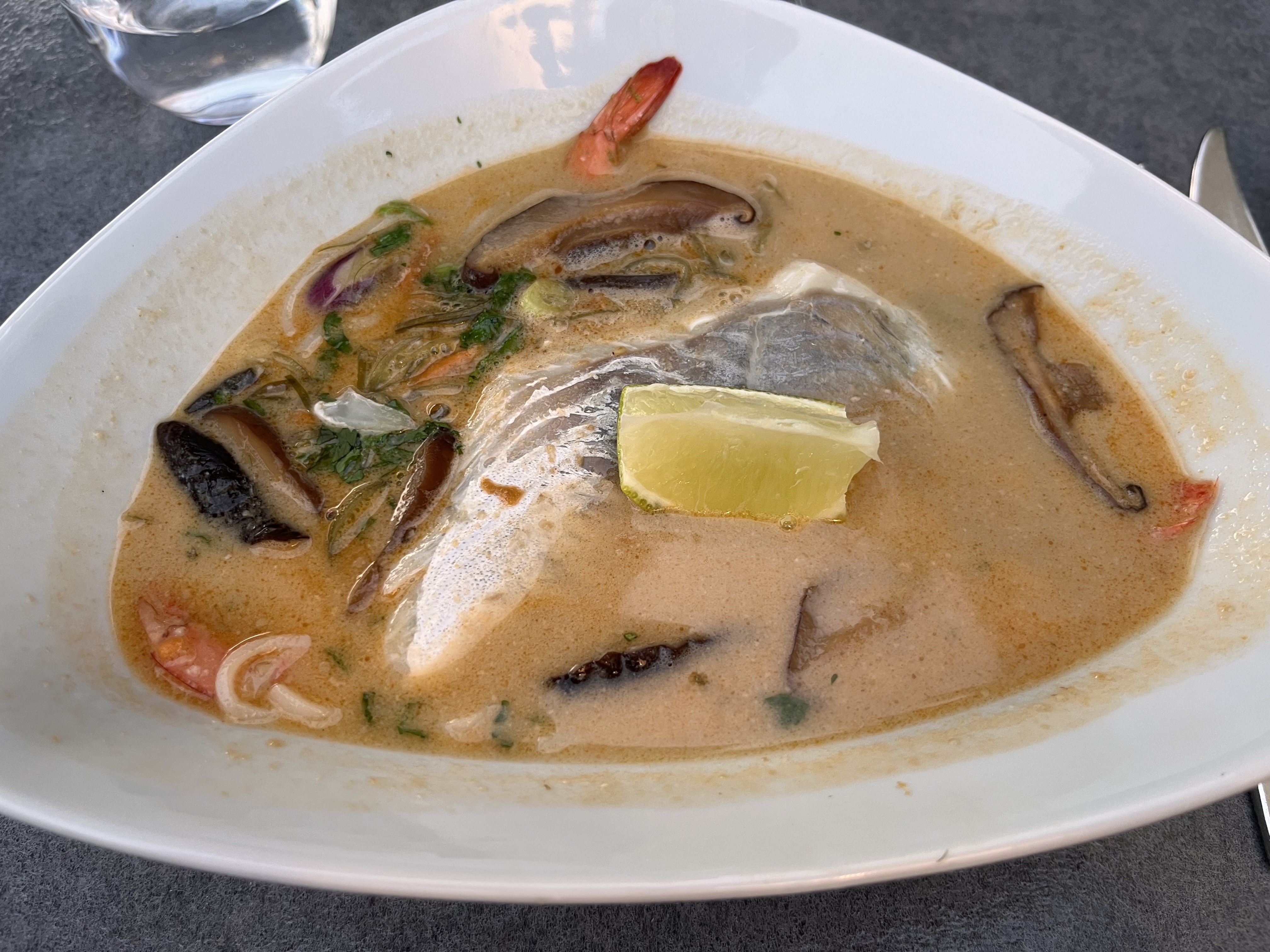 Waouh ! C'est vraiment l'un des meilleurs repas que j'ai eu de ma vie. Alex, notre serveur/hôte (et copropriétaire !), était vraiment fantastique. Il nous a fait visiter le magnifique restaurant et le patio extérieur. Cet endroit est vraiment magnifique ! Le menu était délicieux. Nous avons choisi le menu fixe, qui comprend 3 plats. Le prix était très intéressant et la qualité de la nourriture était incroyable. L'entrée que nous avons choisie était une délicieuse soupe aux raviolis aux champignons et au canard fumé. Notre plat principal était un poisson local appétissant qui était dans cette délicieuse sauce thaïlandaise à la citronnelle (avec des nouilles de riz !). Le dessert était ce gâteau fondant au chocolat, semblable à un gâteau à la lave, et c'était l'une des meilleures choses que j'ai jamais goûtées. Je suis reparti rassasié, heureux et impatient de visiter à nouveau la région afin de pouvoir prendre un autre délicieux repas ici. Faites vos réservations MAINTENANT! Cet endroit est un petit bijou. Merci pour cette belle expérience!