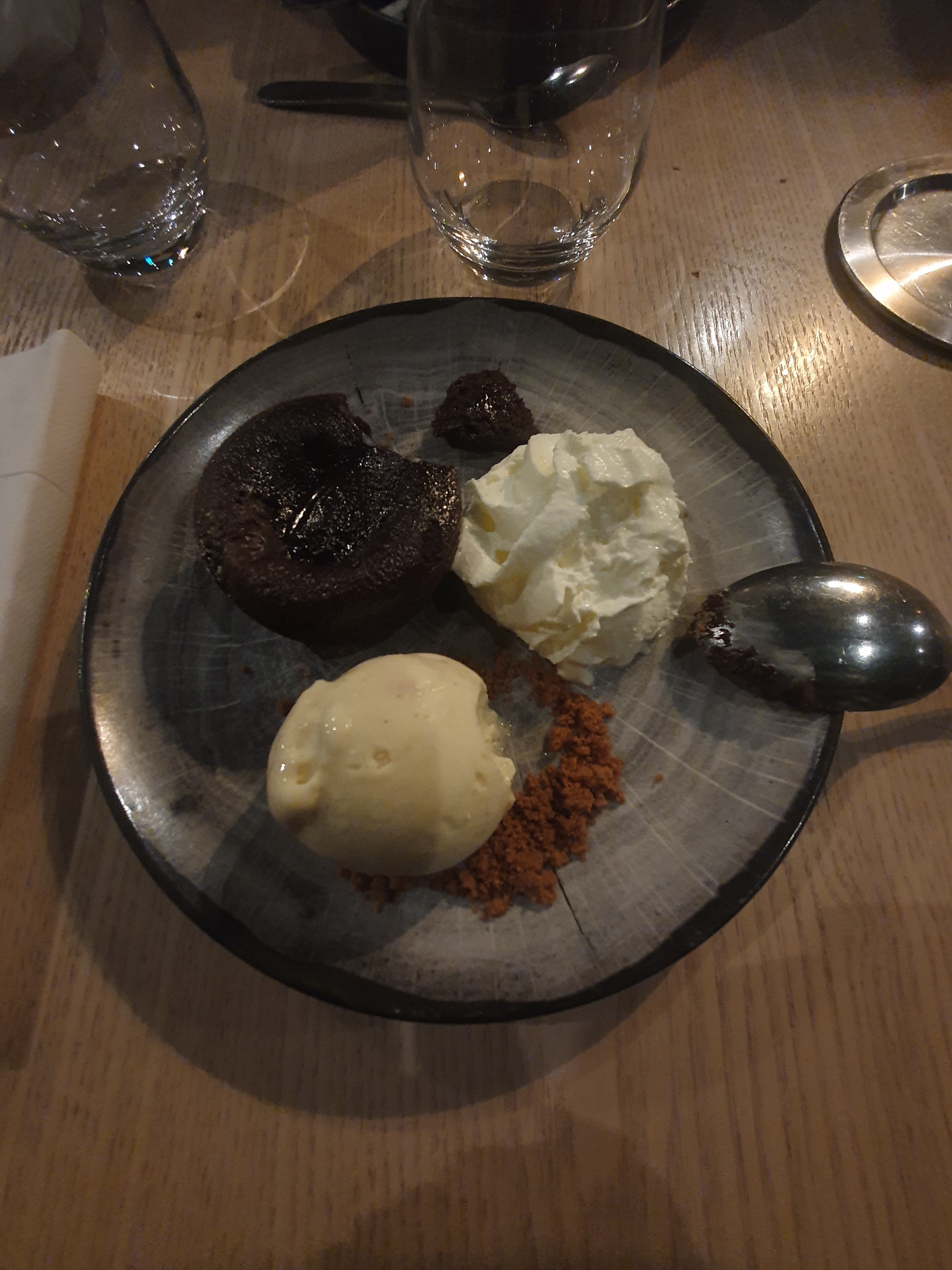 Service super sympa et la déco agréable. Plateau terre et mer, très bon et appétissants . Brochette de gambas un peu trop cuite, mais sinon rien à redire et le fondant au chocolat au top...😍 Je recommande.
