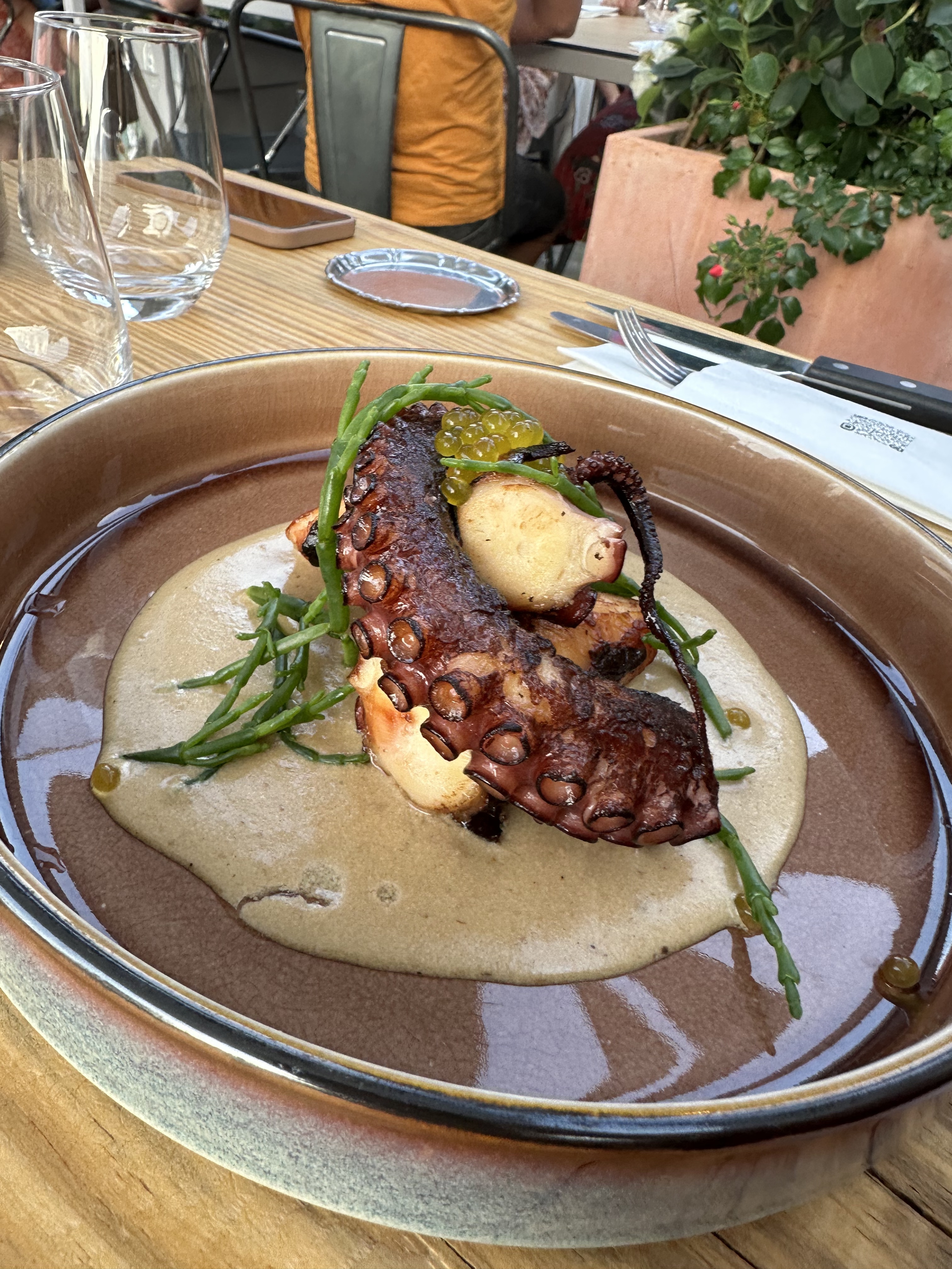 Nous avons dîné dans ce très joli restaurant un samedi. Une belle ambiance/déco, une équipe accueillante et professionnelle en plus d’avoir eu des plats appétissants! Le poulpe grillé était très bien cuit, c’est bien aussi de pouvoir choisir son accompagnement. Nos cocktails (spritz, kir) bien réalisés et bien présentés également. Top, rien de négatif à dire!