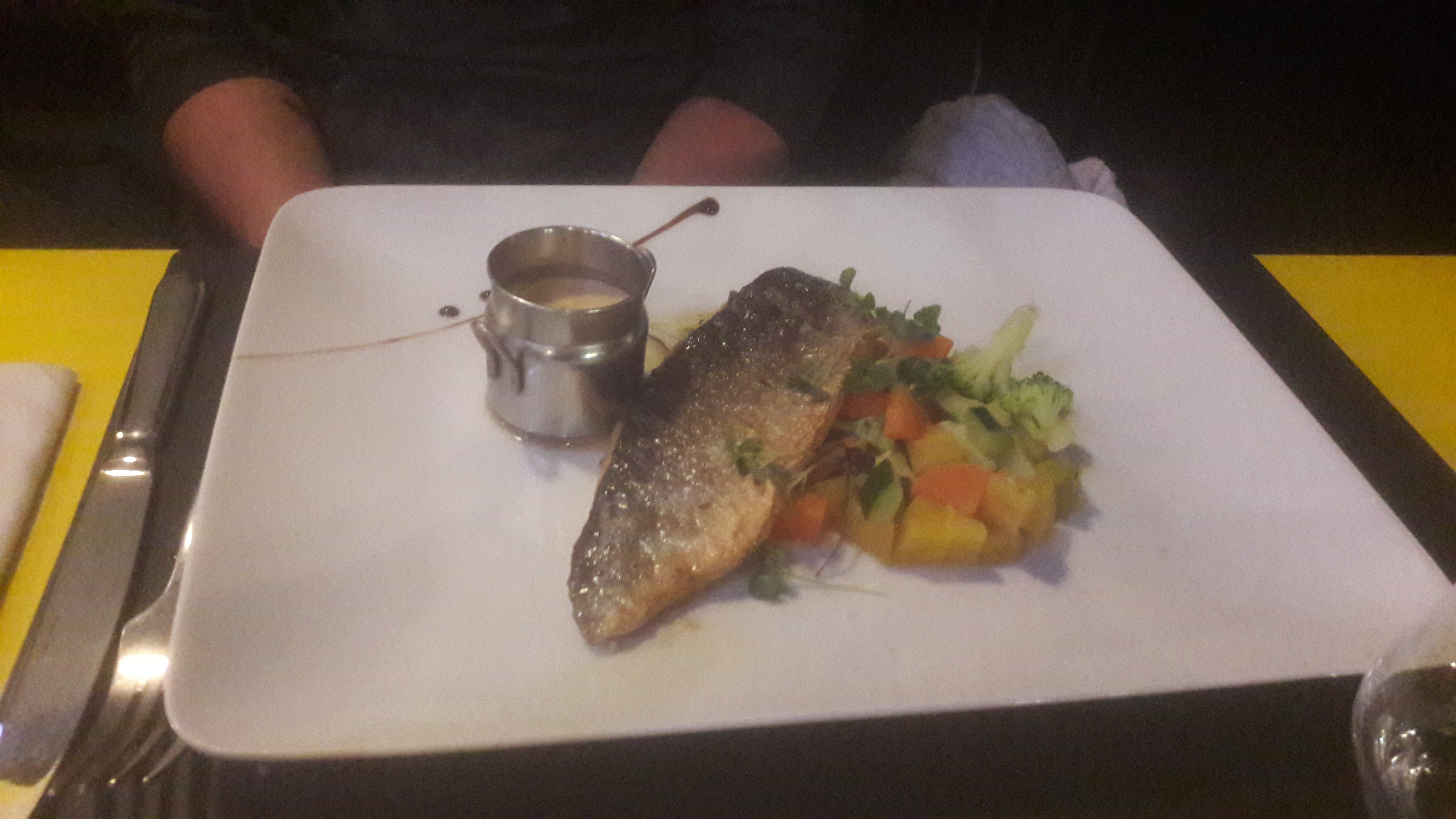 Ambiance feutrée, service attentionné et plat maison. La dorade était parfaitement cuite accompagnée de légumes de saison, avec une sauce onctueuse, le tout formait un mariage parfait. En dessert, j'ai pris une brioche perdue qui était à mon goût trop sucrée, mais il faut souligner la qualité des mets. Bravo pour l'offre culinaire que vous nous proposez.