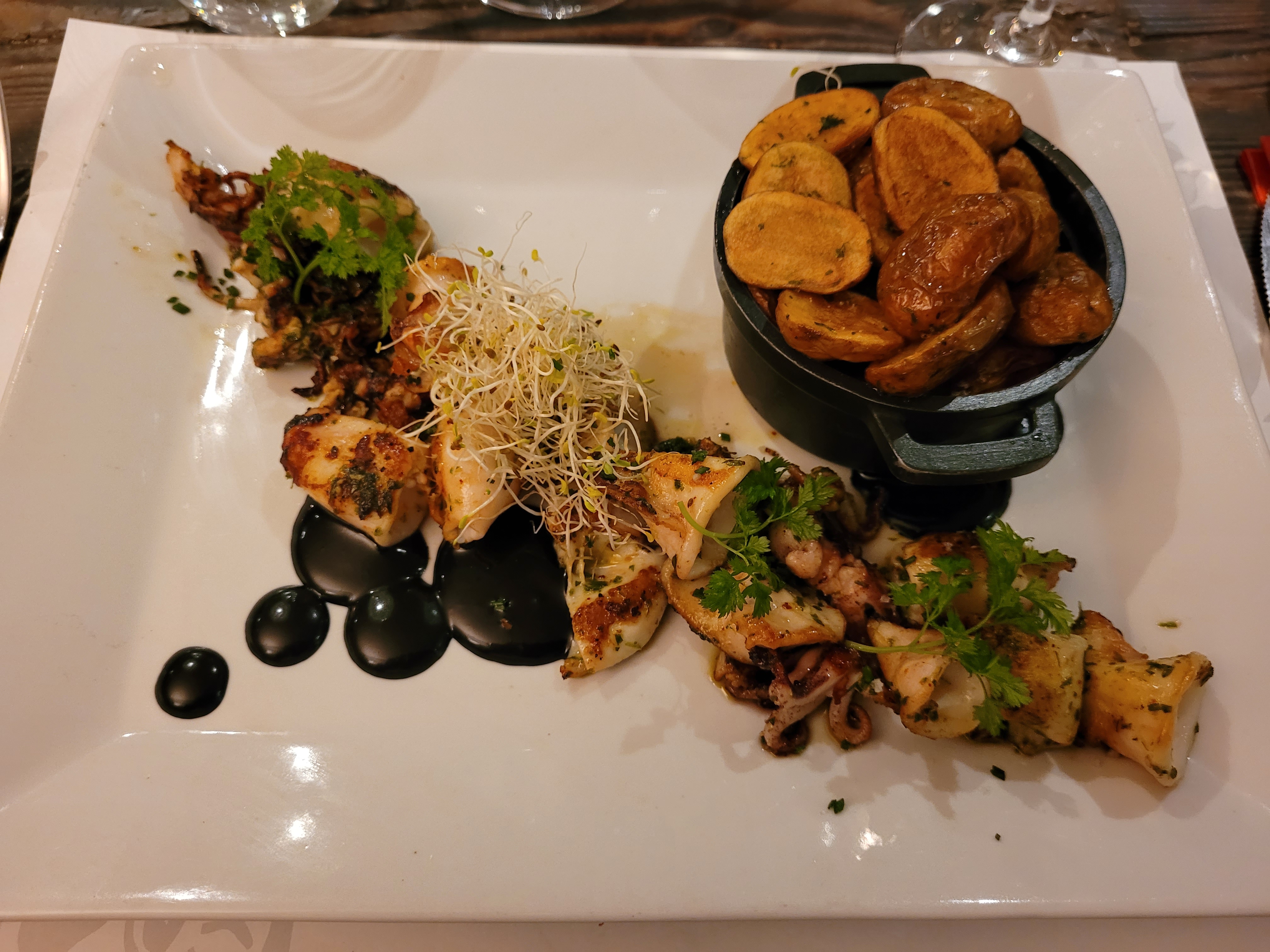 Déjeuner très agréable en terrasse avec de très bons chipirons et un ananas braisé pour bien commencer l’après midi.