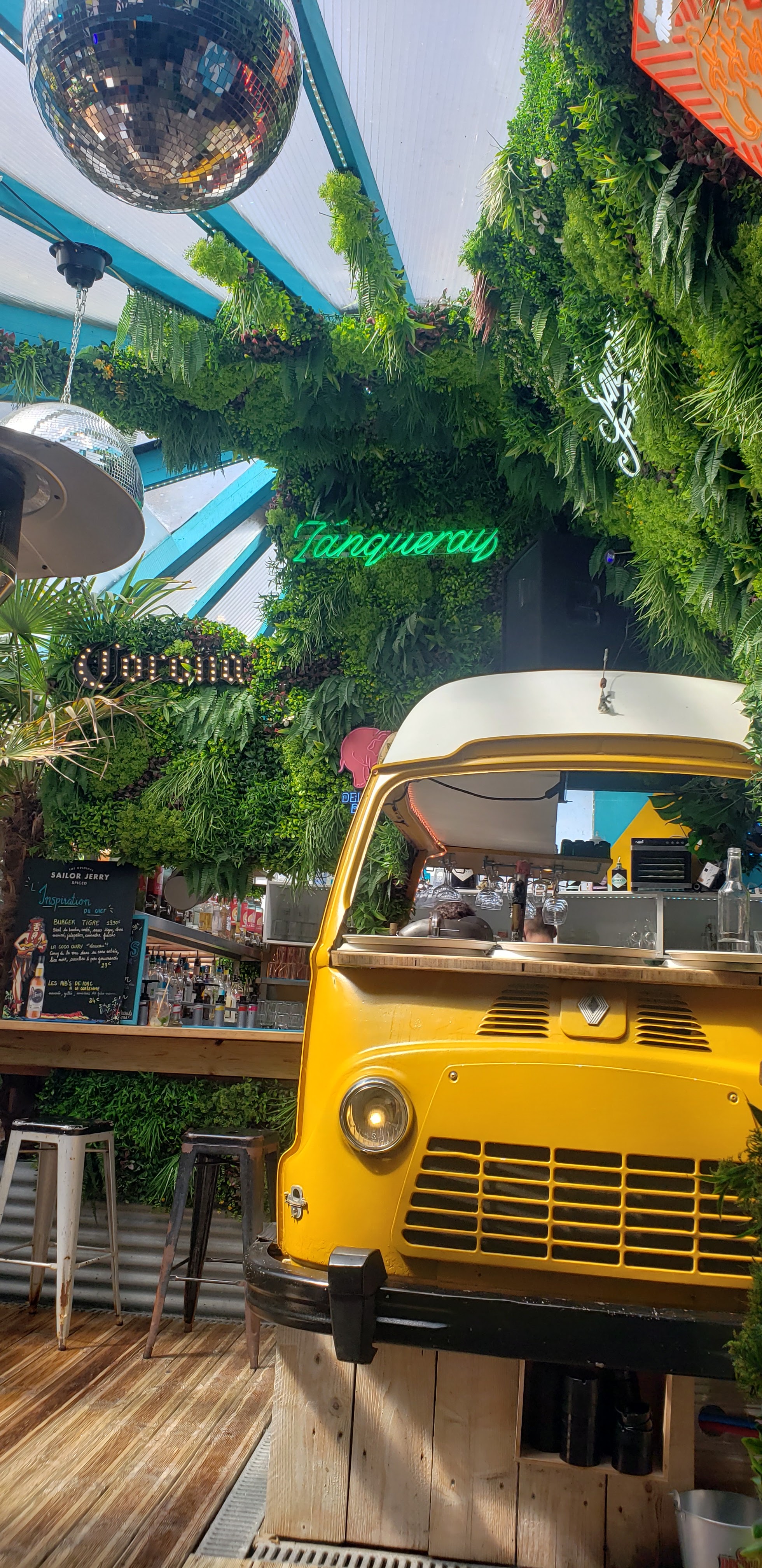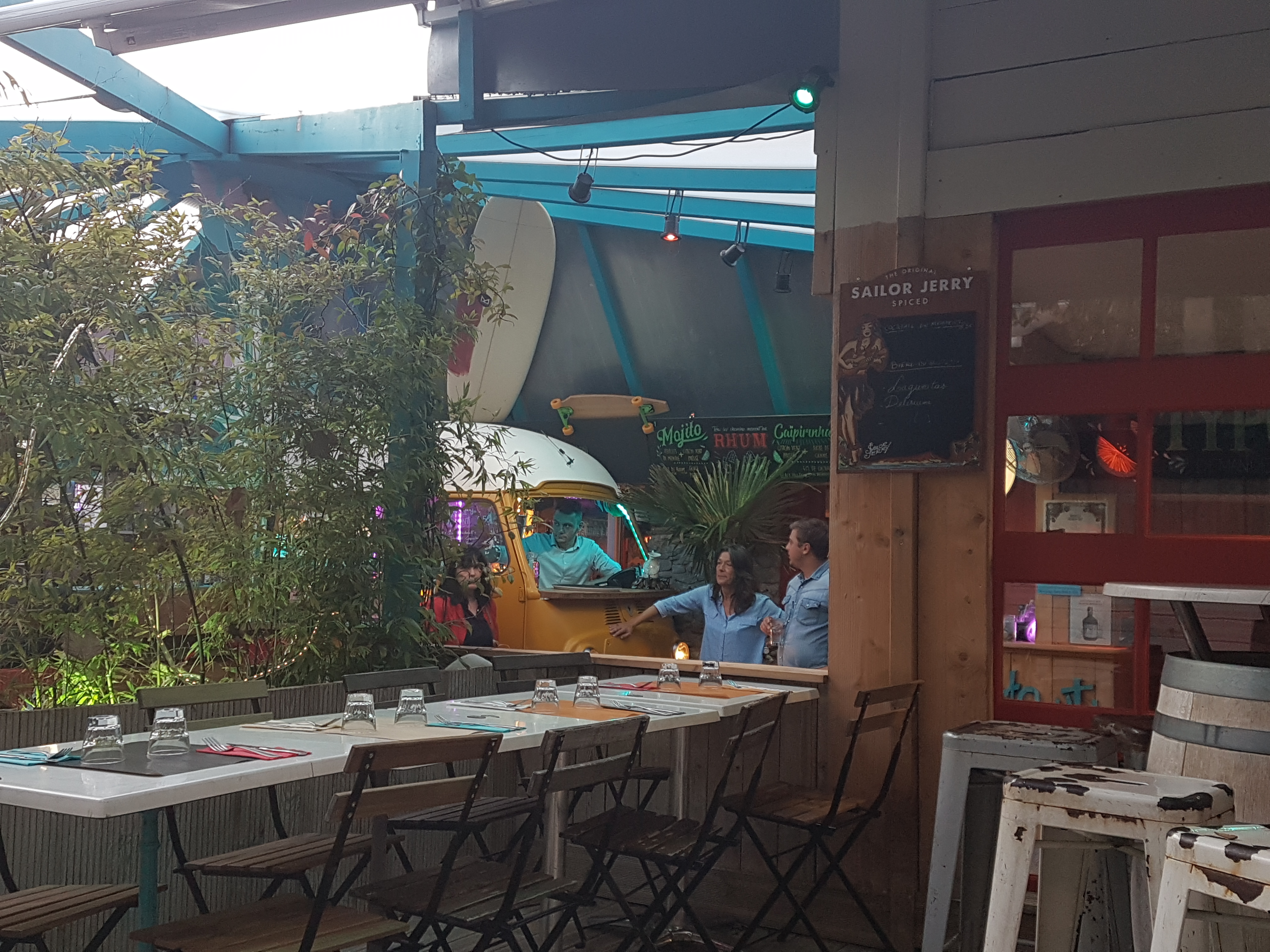 Déco très sympa en extérieur couvert. Du bois et des arbres, de vieux fourgons Renault. Service accueillant. Prix abordables pour les bowls, pizzas et burgers. Choix intéressant et recherché de 🍸cocktails.