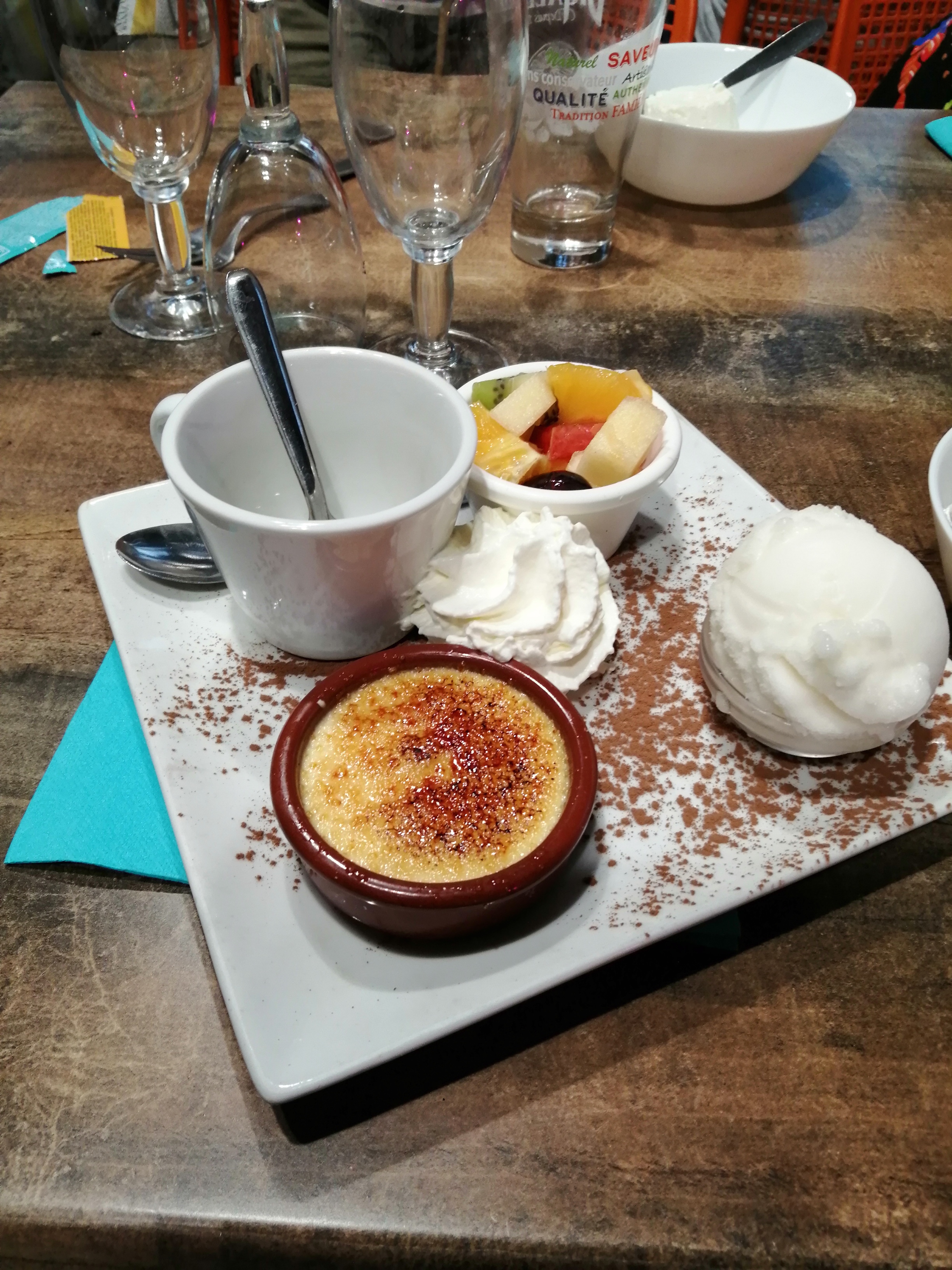 Nos Perrier était chaud, ainsi que le vin. Il n y avais plus de glace vanille mais il la propose ds tous les desserts. J ai signalé que les boissons étaient chaud, mais le serveur n'a pas été très agréable et ne la pas bien pris 🤔. Je vais régulièrement ds ce resto. Mais la j ai été déçu.... Le niveau de qualité a baissé 🌸 dommage....