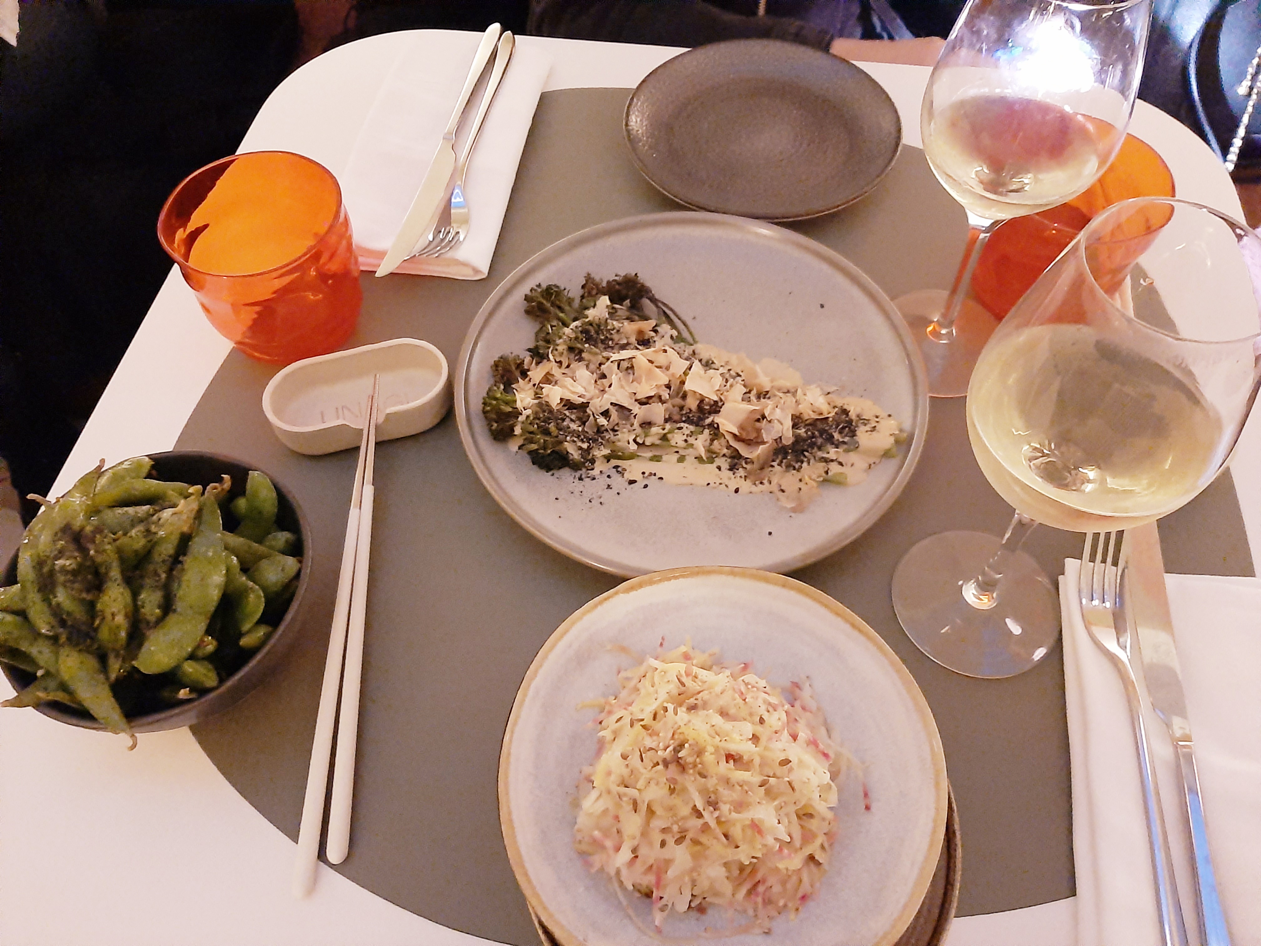 Salade de choux revisitée excellente. Tataki de saumon à tomber ! Et brocolis japonais une tuerie . Accueil et service au top. Très bel endroit