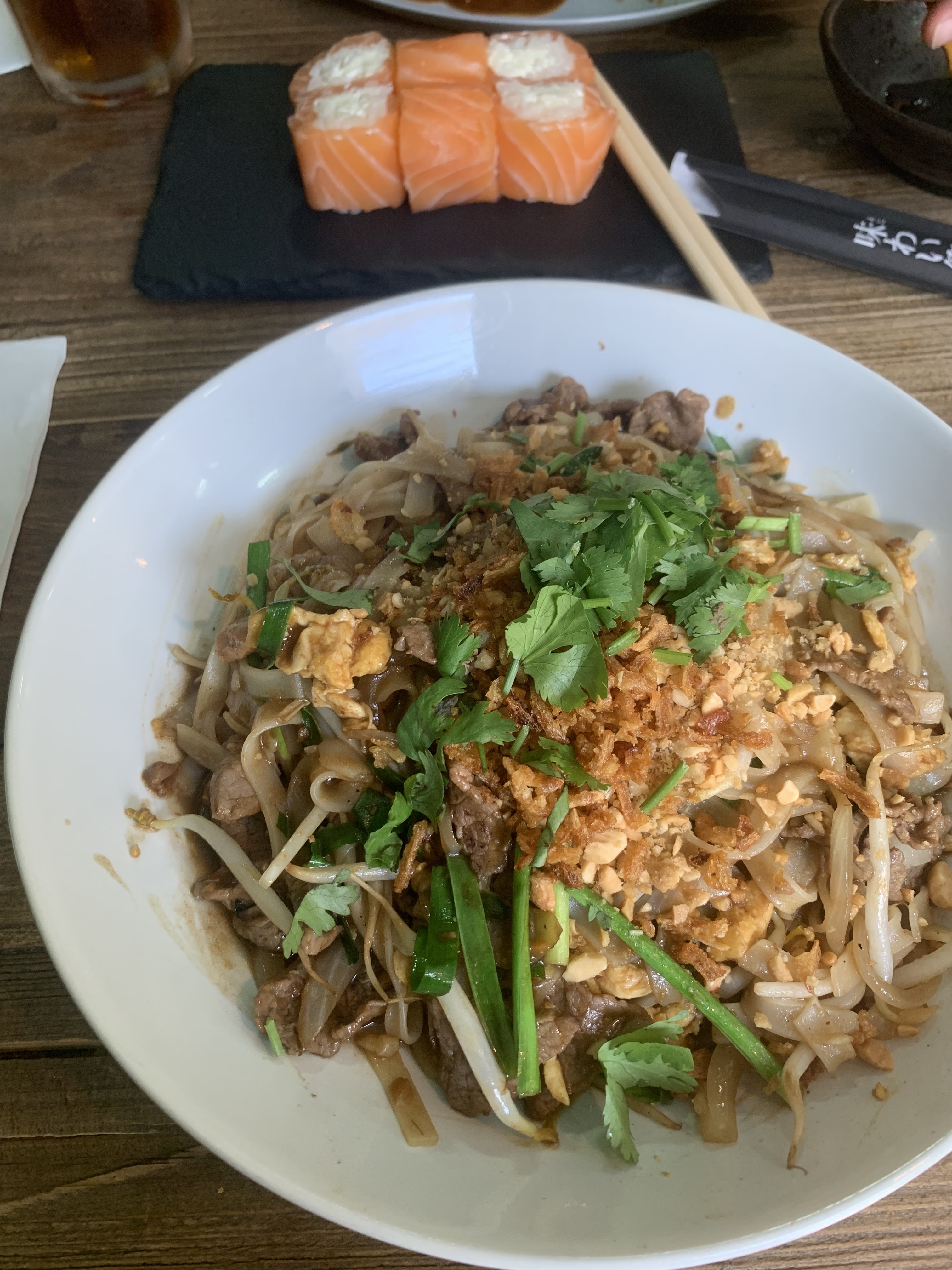 Très beau cadre Plats bien copieux: Pad thaï INCROYABLE Bœuf au curry rouge très bon également et très bon sushi notamment Serveur gentil mais service pas top, pas de baguette, pas de carafe d’eau, et recettes de mojito à revoir selon moi (menthe en fin de vie, sirop de framboise et non fruits frais)