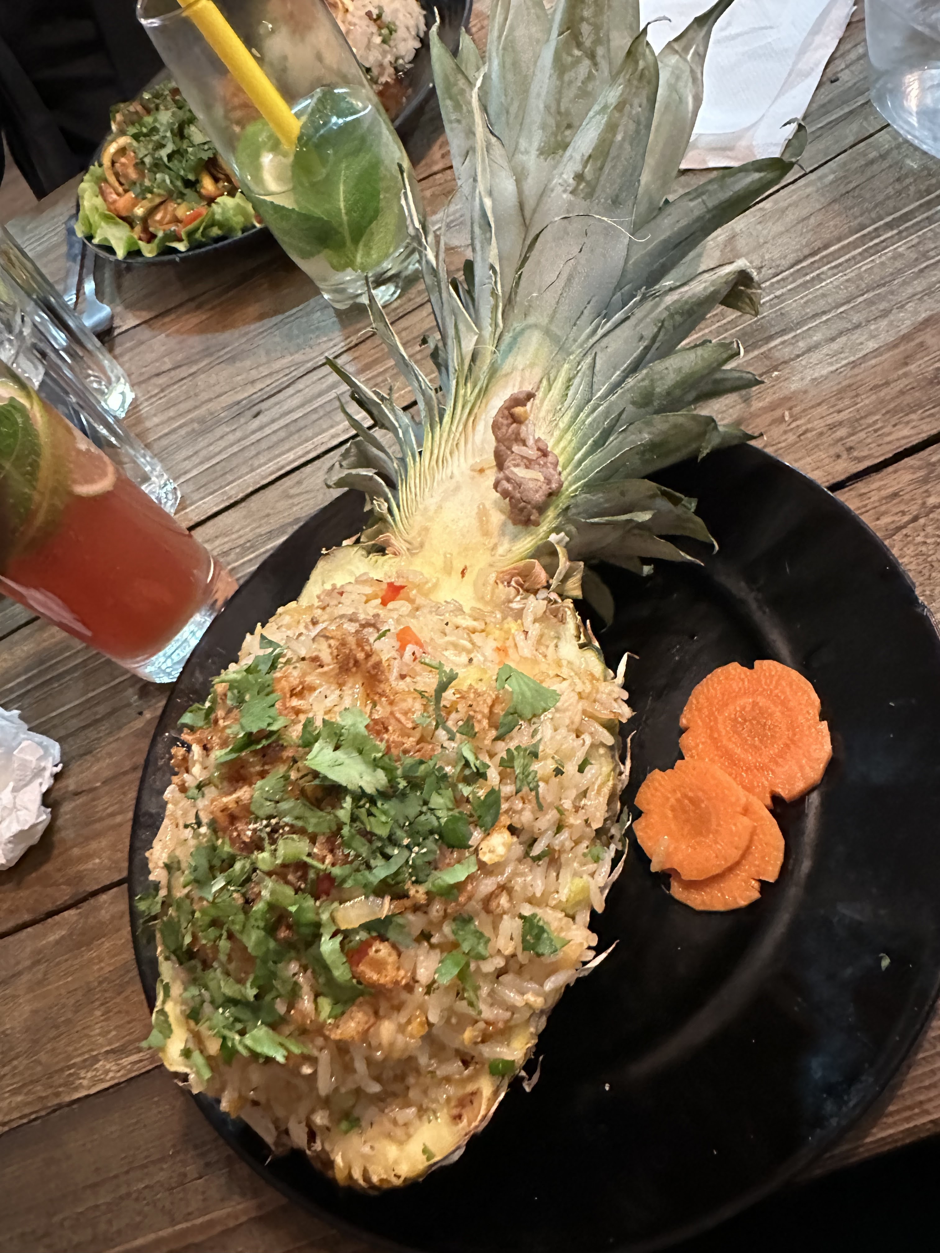 Nous avons été très bien accueillis et nous nous sommes régalés : cocktails jungle coconut et banana Moon dans le thème coco, assortiment de nems et samoussas, pad thaï et boeuf riz Loc lac, des plats où l'on ressort le ventre plein ! Des plats au prix raisonnable pour une très bonne qualité (13€ le pad thaï poulet par exemple) Presque tout est fait maison. Ils proposent aussi des nouilles, soupes, ananas thaï, Bubble Tea.... Et plein d'autres choix.