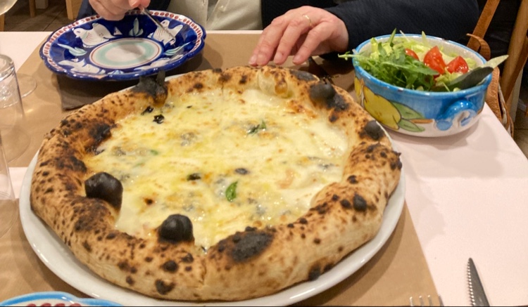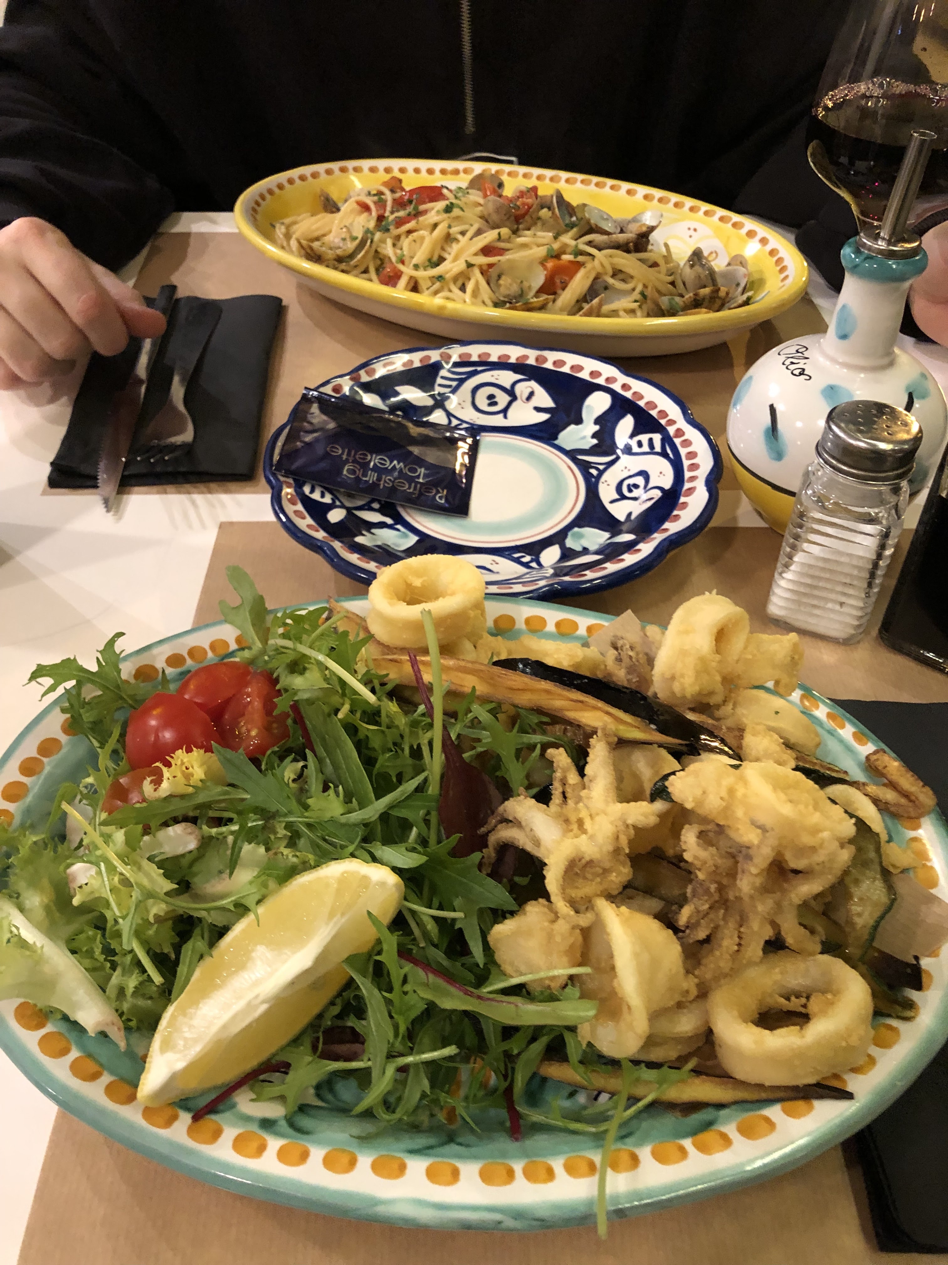Joli endroit italien et nous avons eu la chance d'avoir une table ! Pizza Margherita classique avec calamars séchés et légumes avec une panna cotta à l'amaretto. Il y a eu un peu de cris à la cuisine pour les commandes mais j'imagine que ça a fait l'ambiance !
