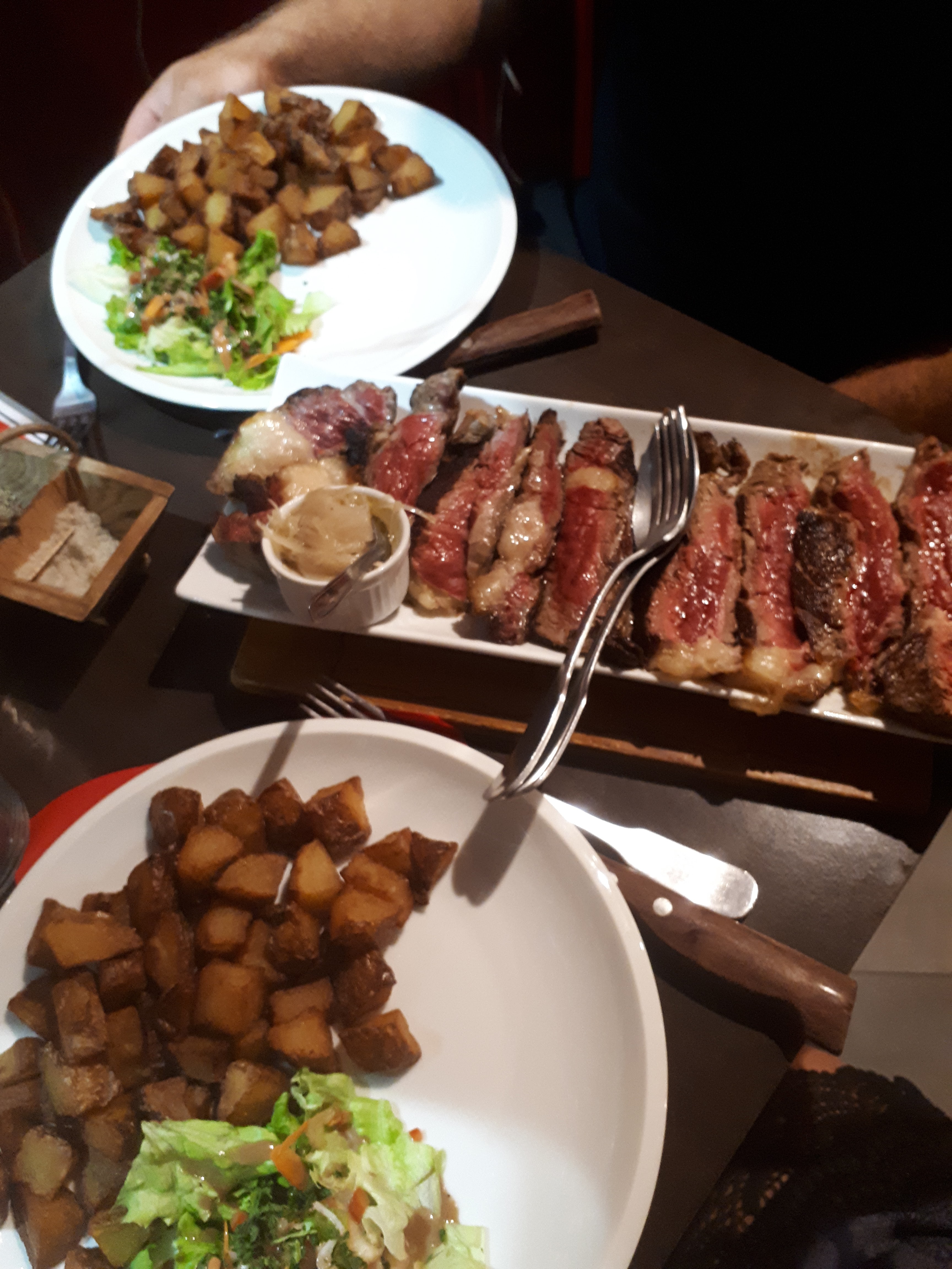 Malheureusement repas le soir est déjà il n’y avait plus trop de choix. J’ai prix une côte de bœuf pour 2(1kg) je ne pense pas qu’elle faisait vraiment le poids vu le peu de quantité.viande sans plus , moi qui me faisait un plaisir de connaître ce lieu. Dommage