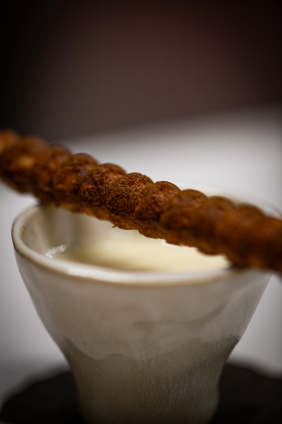 On est d’abord saisi par le lieu feutré, d’un noir vibrant, presque charnel, qui illumine aurait dit un Pierre Soulages ; le sentiment étrange de prendre part à un film avant d’avoir dîné. Puis le service s’opère comme un ballet, limpide et amical. Les plats s’enchaînent, interrogent, troublent, le vaisseau est lancé et on ne veut plus en descendre