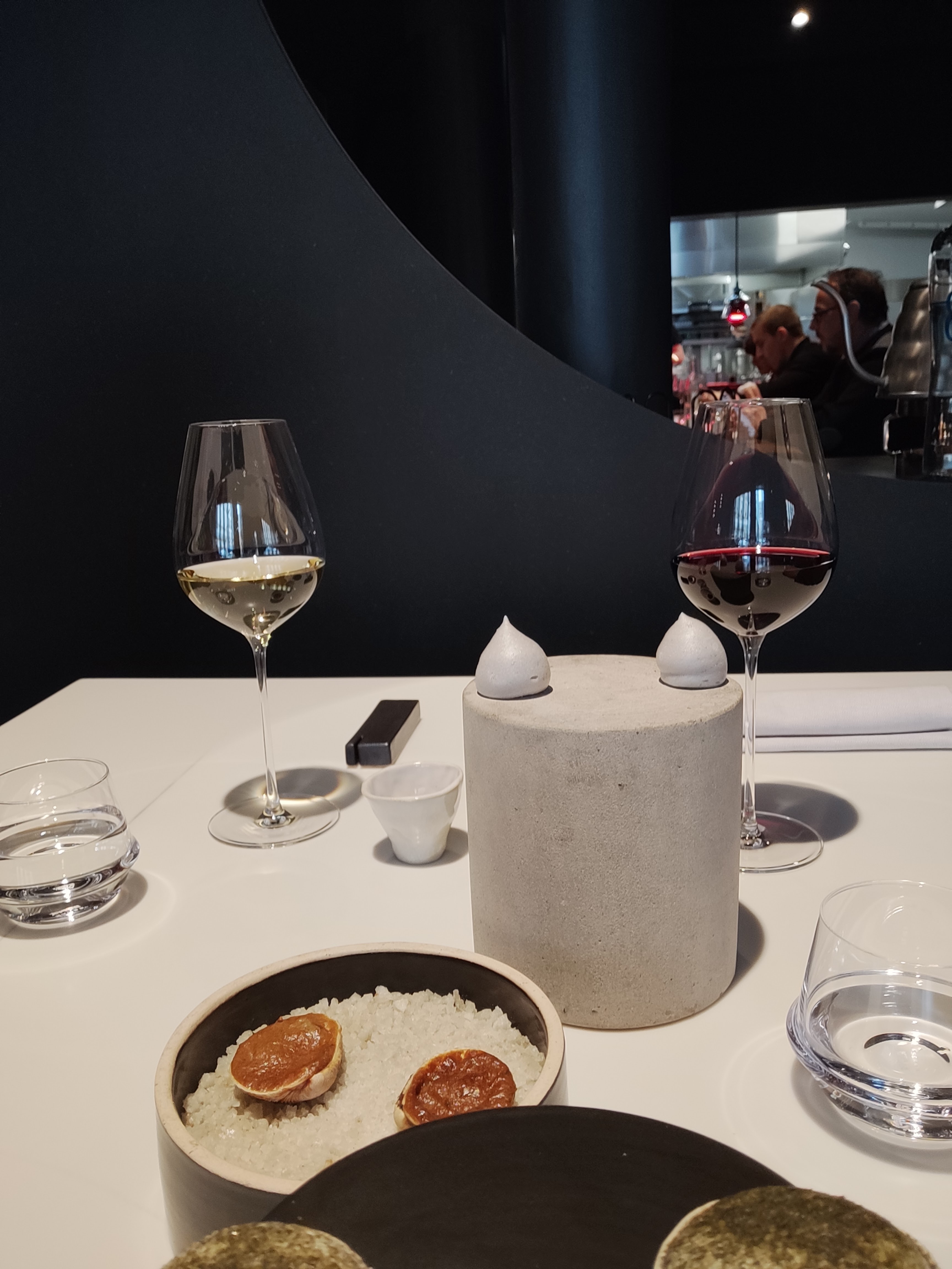 La qualité de la cuisine est impeccable, le service l’est aussi. Ce fut un voyage culinaire formidable. Néanmoins, ce genre de restaurant représente forcément pour certains, un petit budget. Nous avions décidé de nous partager un seul accord mets et vins à deux, soucieux de ne pas abuser de l’alcool, et de rester dans notre budget. Lors du service, on nous sert deux verres. Les quantités étant raisonnables, nous nous sommes dit qu’ils divisaient les quantités en deux, pour nous faire profiter. Quand nous nous sommes rendus compte que ce n’était pas le cas, il était trop tard pour nous manifester. Le serveur s’est rendu compte de l’erreur lors l’addition, sans se manifester non plus. Je ne sais pas si cela était finalement un simple quiproquo ou non. Néanmoins, le résultat est le même, nous avons consommé bien plus d’alcool que nous ne le désirions initialement. Mais une fois le verre rempli devant vous, difficile de dire non… En ce qui concerne la quantité, je dois souligner que je suis sorti de là en ayant faim. Après, le but n’est pas de sortir de ce genre d’endroit en roulant, mais bien de profiter de la qualité de la nourriture, et de l’esprit innovant du chef. Et là, nous avons été servis. Néanmoins, vu le prix de l’addition pour 2 (400€), on se pose quand même des questions. Il faut certainement laisser un peu de temps à cette très jolie équipe de se « caler ».
