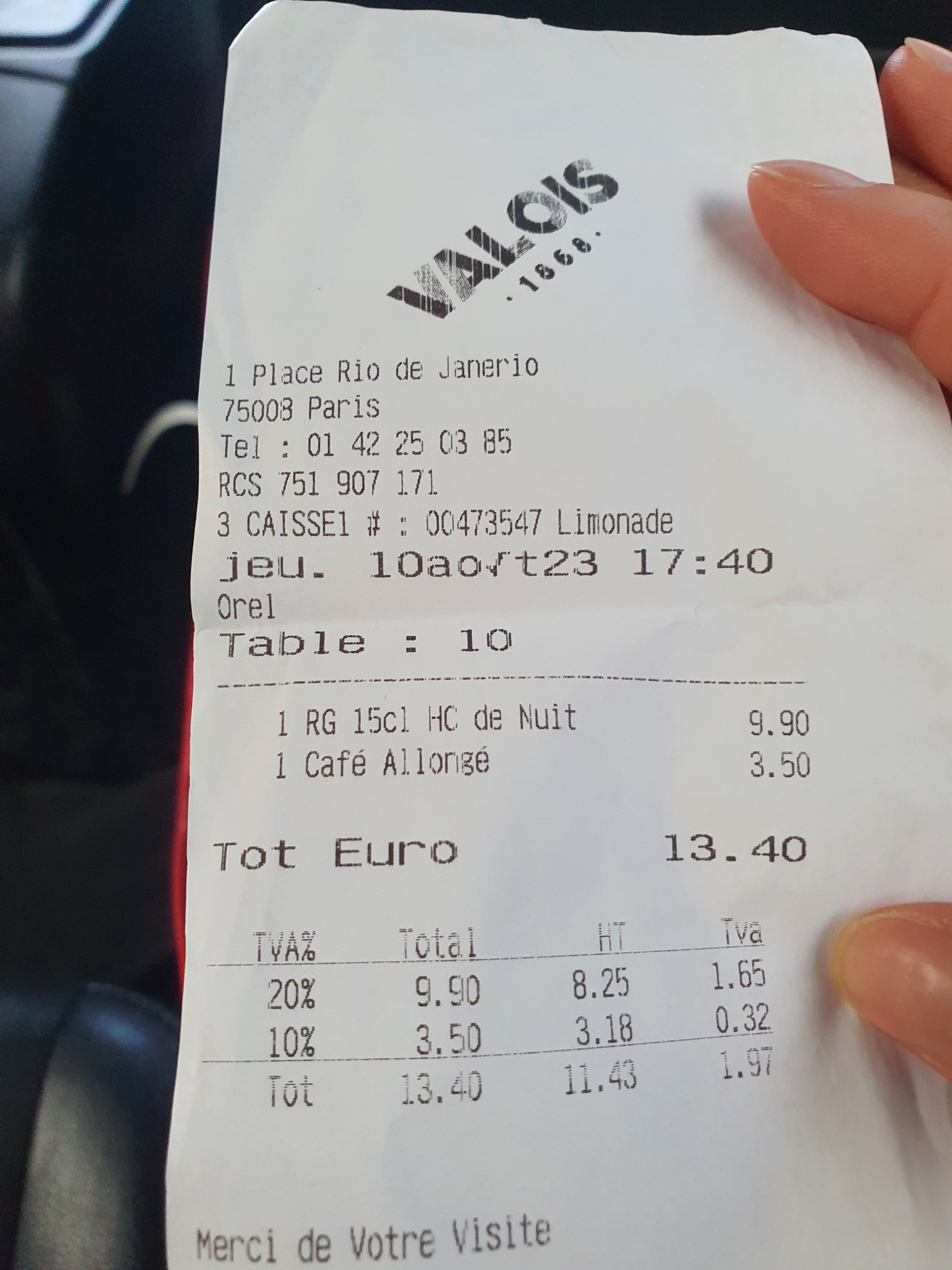 Éviter Vérifiez votre facture si vous allez ici. Ils m'ont surfacturé. Chargé un verre de 15 cl alors que mon vin était à peine à la ligne des 10 cl. Les serveurs étaient gentils, merci. Je soupçonne que le directeur ou le propriétaire était celui qui m'a mal facturé. Dommage que je n'ai pas de photo du verre de vin mais voici le reçu Check your bill if you go here. They overcharged me. Charged a 15 cl glass when my wine was barely to the 10 cl line. The wait staff were nice, thank you. I suspect the manager or owner was the one who mischarged me. Shame I don't have a picture of the glass of wine but here's the receipt