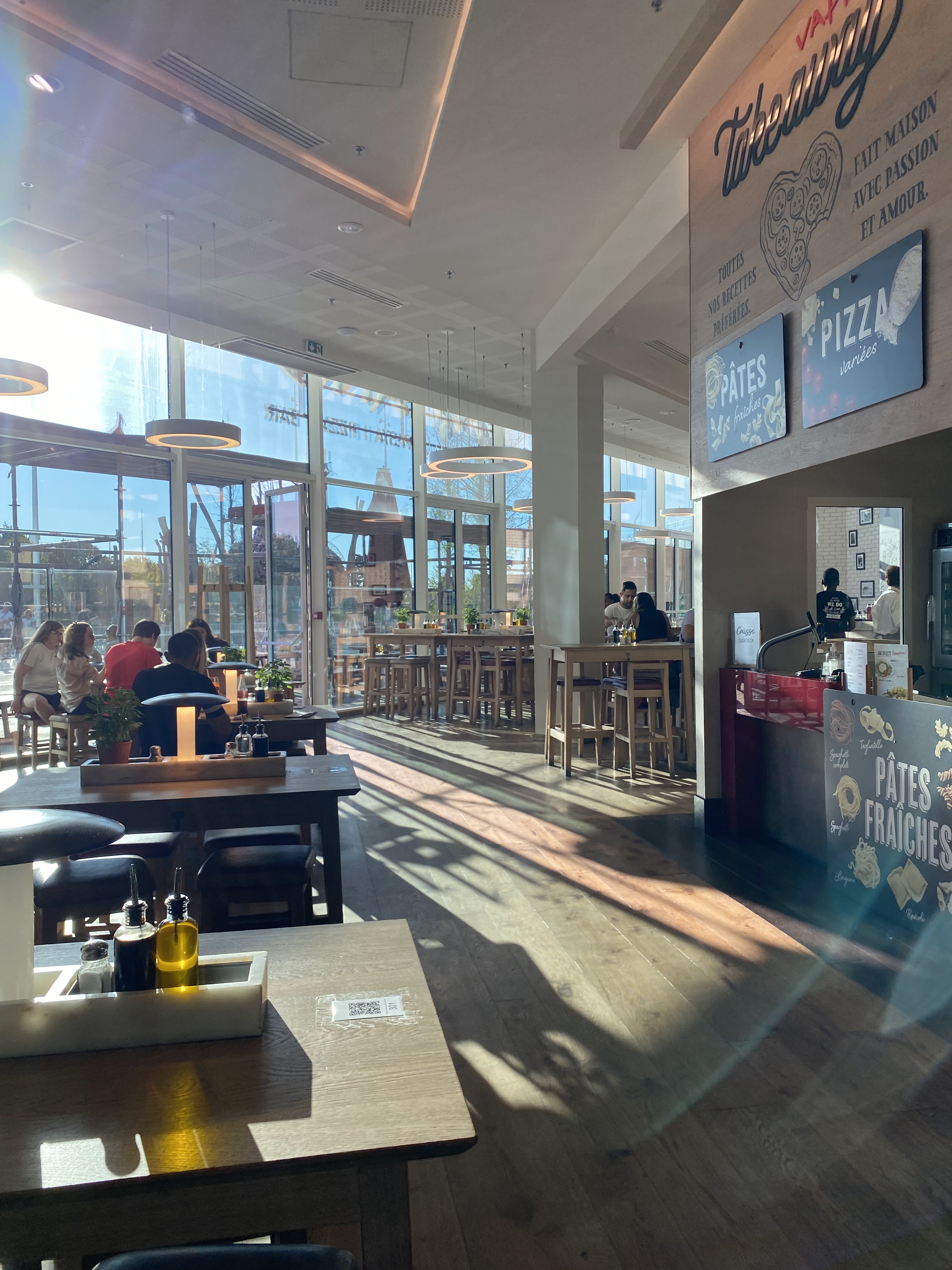Première expérience dans ce restaurant avec l'un de mes amis. Le système pour commander est très inefficace. Pas de serveur, on vous donne un menu à votre arrivé et une fois assis à la table, vous devez scanner un QR Code qui vous emmène sur un site où vous aurez la liste de tous les plats / boissons / desserts, et vous devrez commander dessus. Vous aurez ensuite le choix de payer en caisse ou directement en ligne. Bien que le principe semble pratique, nous avons passé 20 minutes pour commander, car la fluidité du site n'est pas au rendez-vous, certains plats sont sur le menu et pas sur le site, il y a une certaine lenteur (qui peut être était exceptionnelle à cette soirée). Toutefois une fois les plats servies, nous avons été forcé de reconnaitre que tout à été très bon. Pate carbonara pour ma part et pizza chèvre miel pour mon amis. L'intérieur du restaurant est un vrai plus, l'ambiance et la décoration donne plutôt bien l'ilusion de ne pas être dans un grand centre commercial mais dans un restaurant unique. Les prix sont un petit élevé cependant. À expérimenter au mois une fois pour le cadre et l'ambiance.