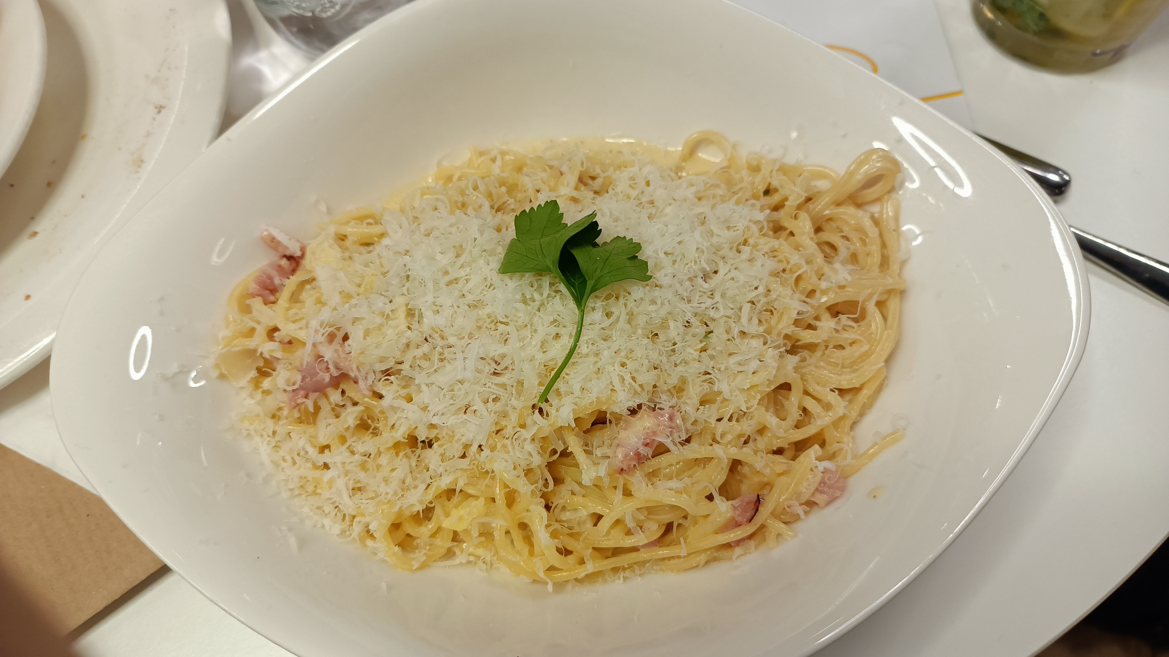 Catastrophique. Carbonara sans œuf. Pâte crevettes saumon 3 malheureux morceaux et 2 crevettes. Les boissons qui arrivent à la fin du plat après 2 demandes. Un dmseul serveur Fofana a l air de se soucier des clients. Merci à lui.