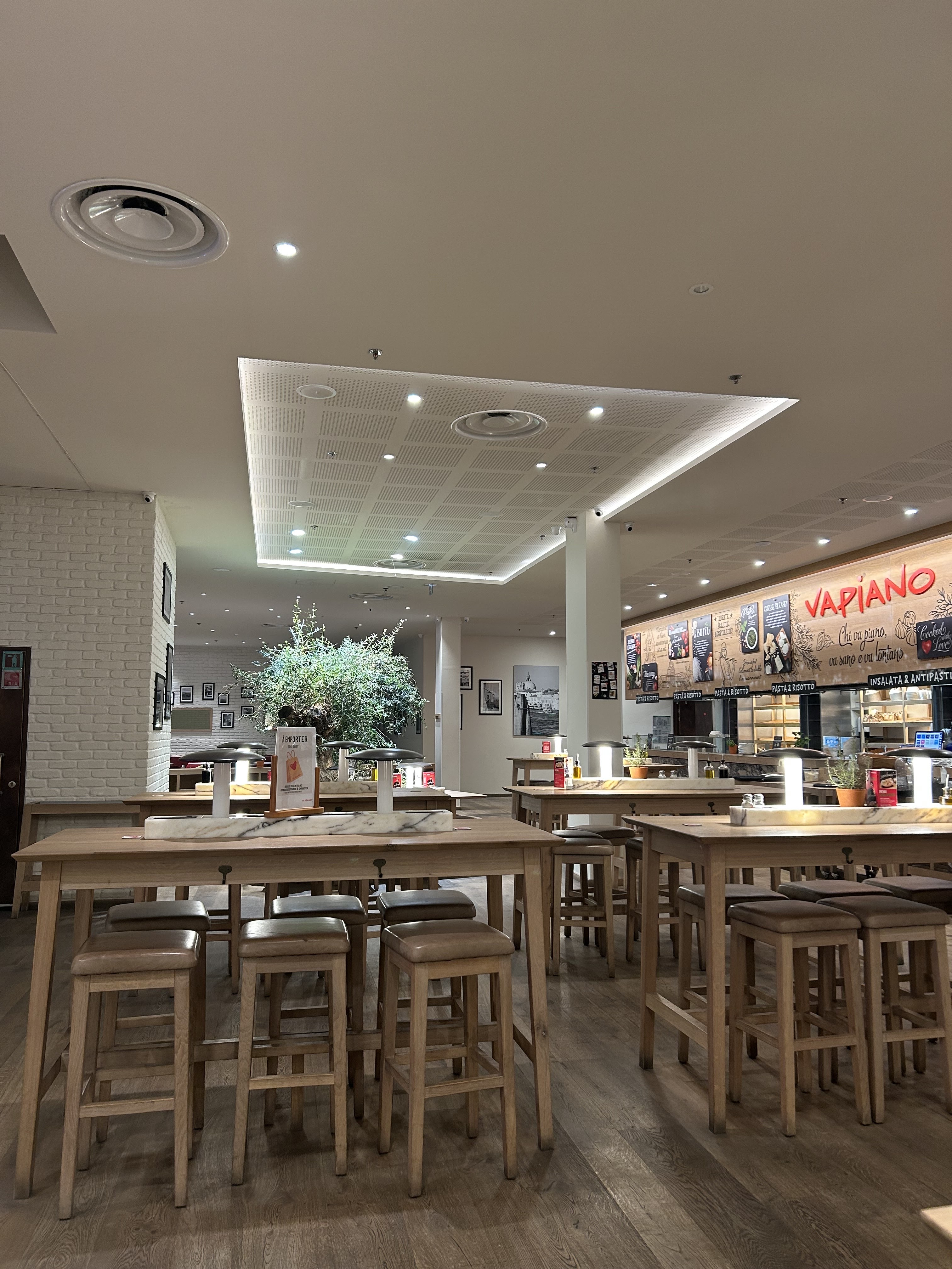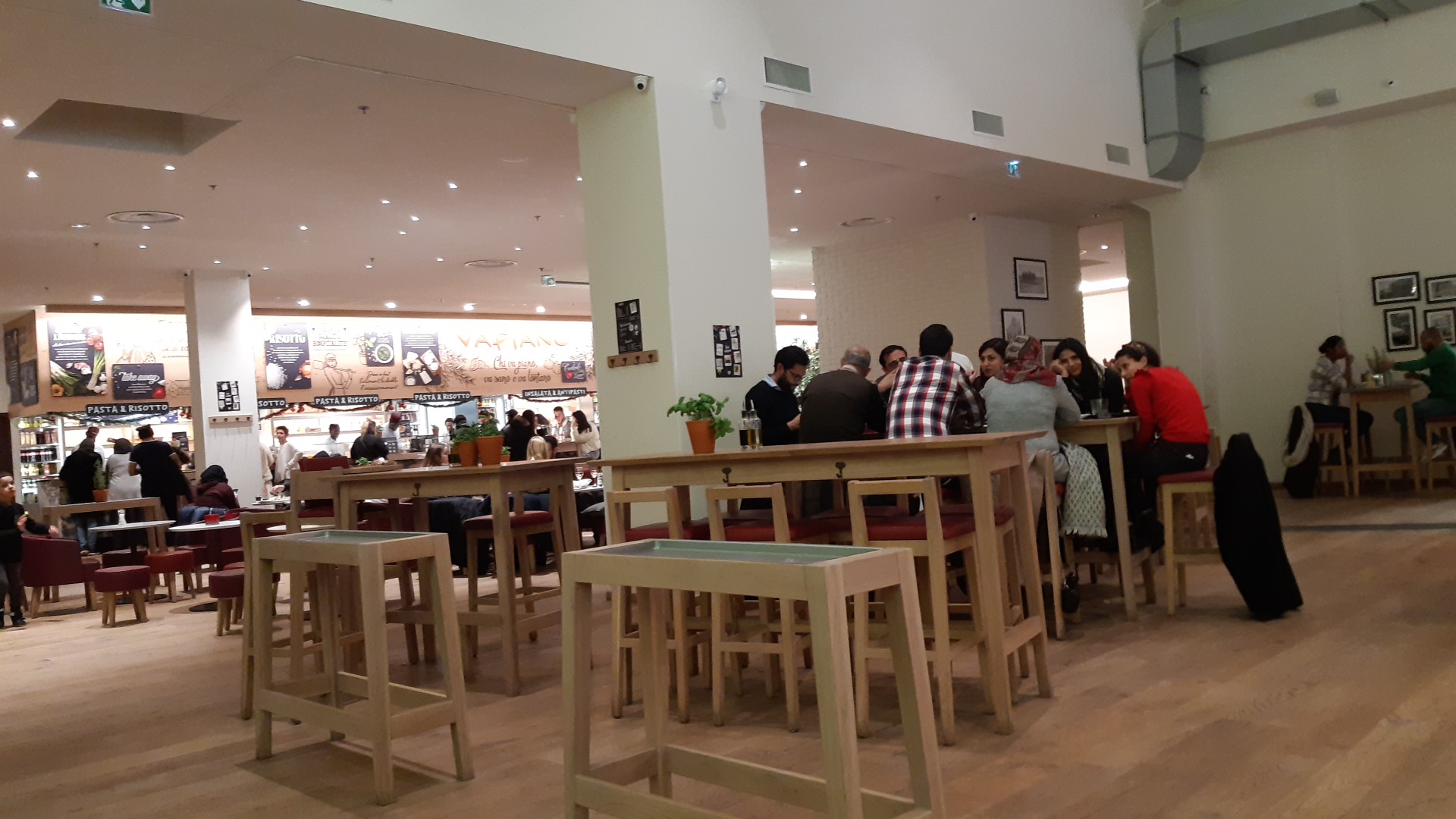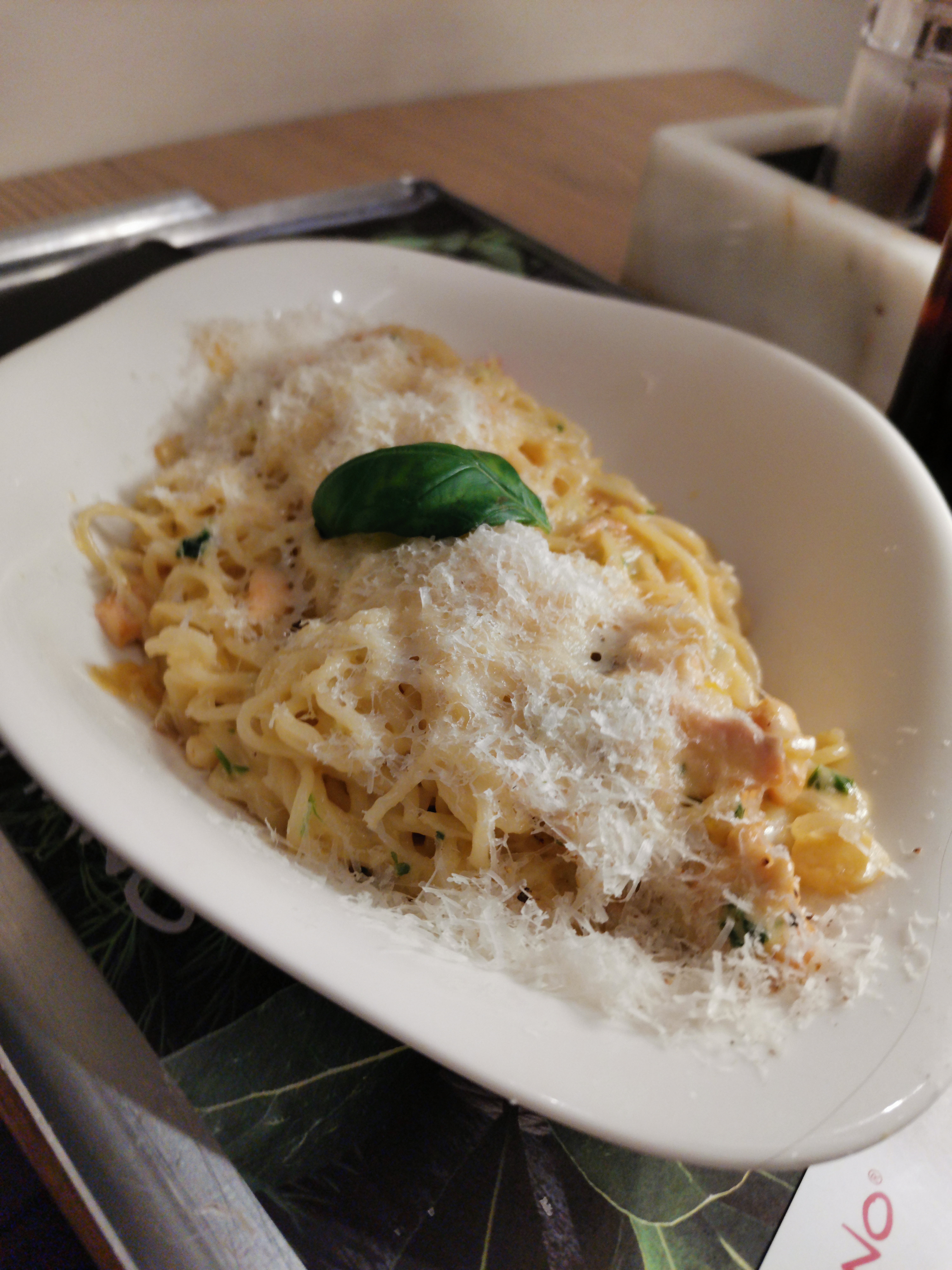 Un point positif du restaurant est la décoration. En effet, le concept est sympa avec la déco magnifique. Dès notre arrivée, on peut sentir une bonne ambiance pour notre repas. Par contre, la cuisine n’est pas top, malheureusement. On a pris de pâtes qui sont hyper salées et trop cuites. D’ailleurs, les saumons et les crevettes dans les pâtes ont de bon goût mais en toute petite quantité et un peu secs. C’est notre troisième fois dans le restaurant de la chaîne Vapiano et on trouve toujours les plats trop salés.