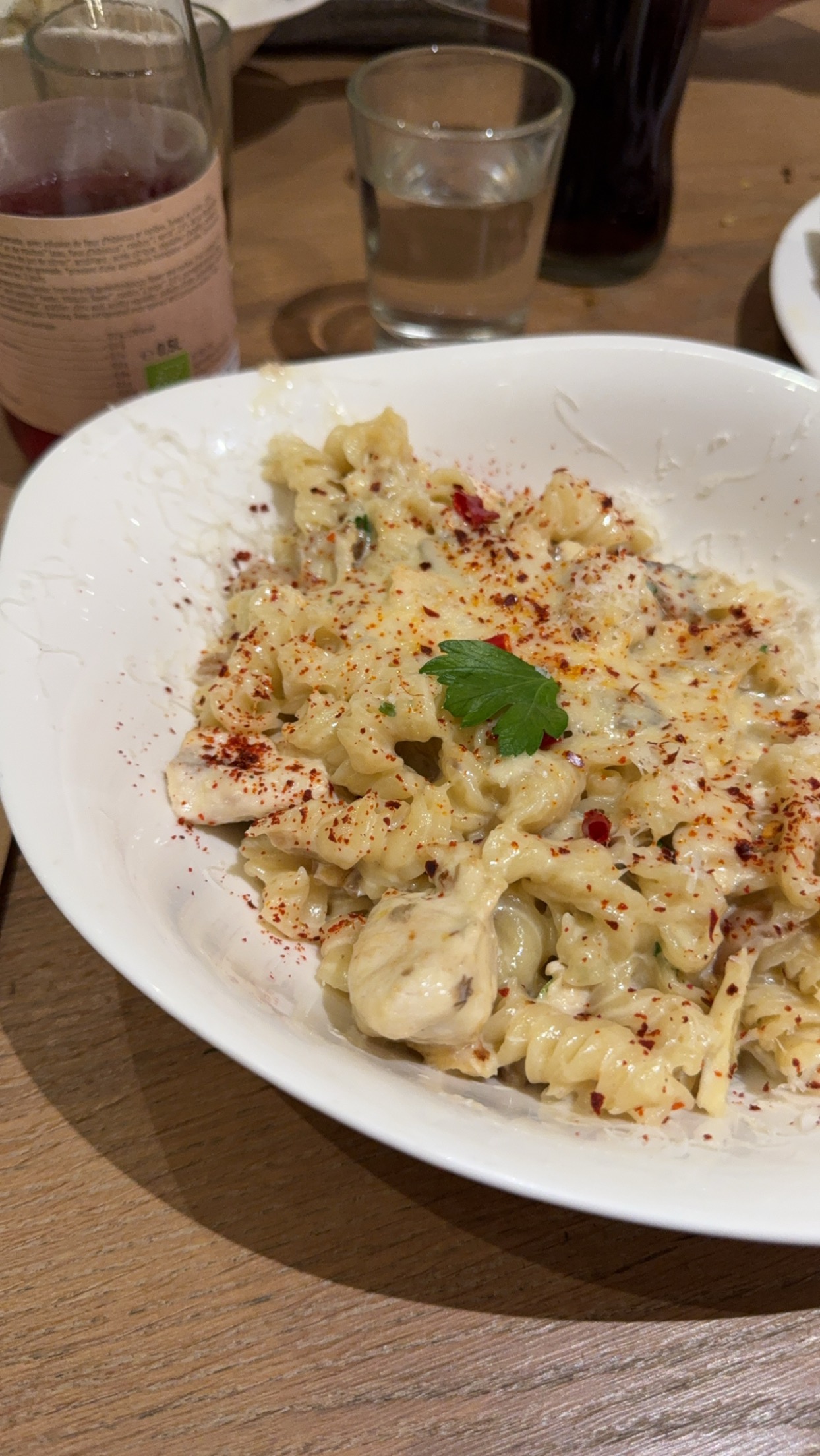 Tout était bien, j’ai pris les chicken Alfredo 👍 Merci à Line pour son sourire et sa bonne humeur !!