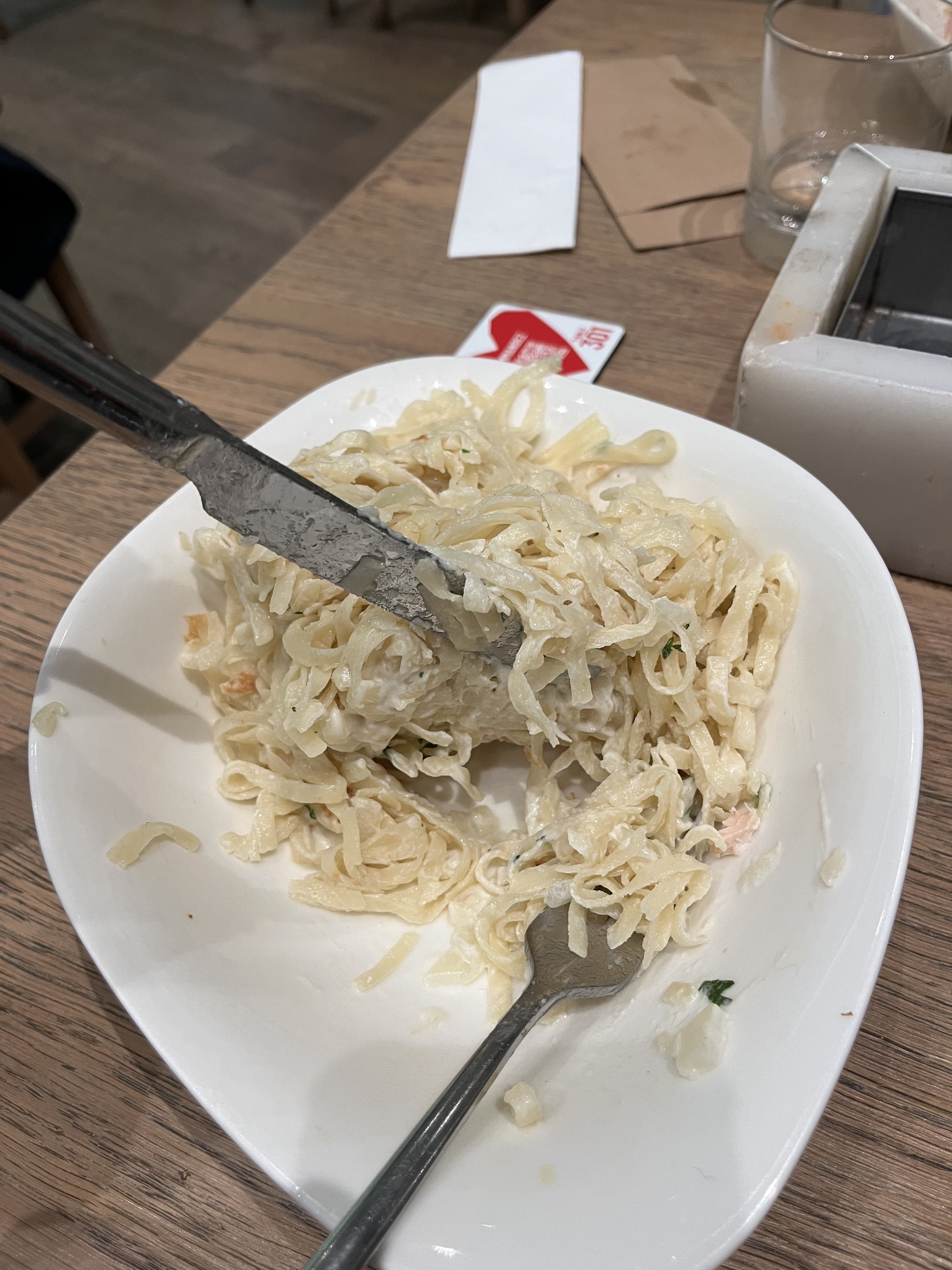 C'est original comme concept, quand vous êtes 4 vous allez manger à tour de rôle (comptez environ une personne servi toutes les 10minutes). Les pâtes étaient vraiment sous cuites et pas excellentes, les boissons arrivent sans verres, et oui apparemment les verres, couverts, serviettes, carafe d'eau sont en libre service (même le paiement). Bref le coca cola reste la seule chose qui ne m'a pas déçu. Bon courage 🫣