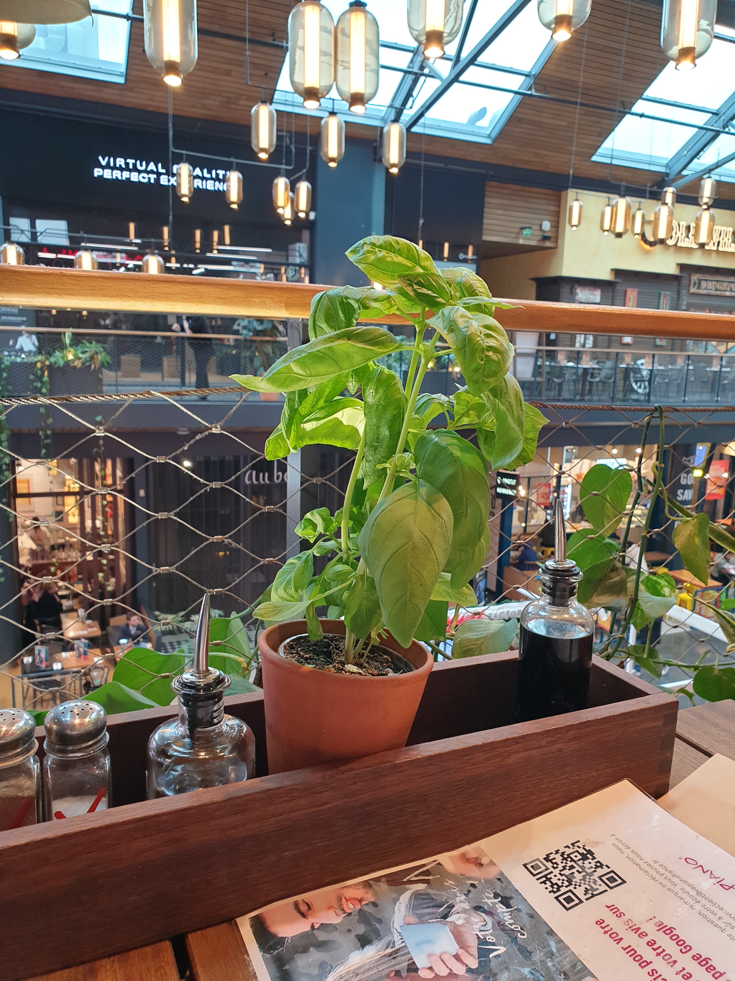 Pas forcément très convaincu par les tables pour manger. On a au milieu un bac à lumière pour faire pousser du basilic qui a tendance à cacher ses voisins de face. Cuisine très bonne les pâtes bien fraîches presque trop nourrissant.